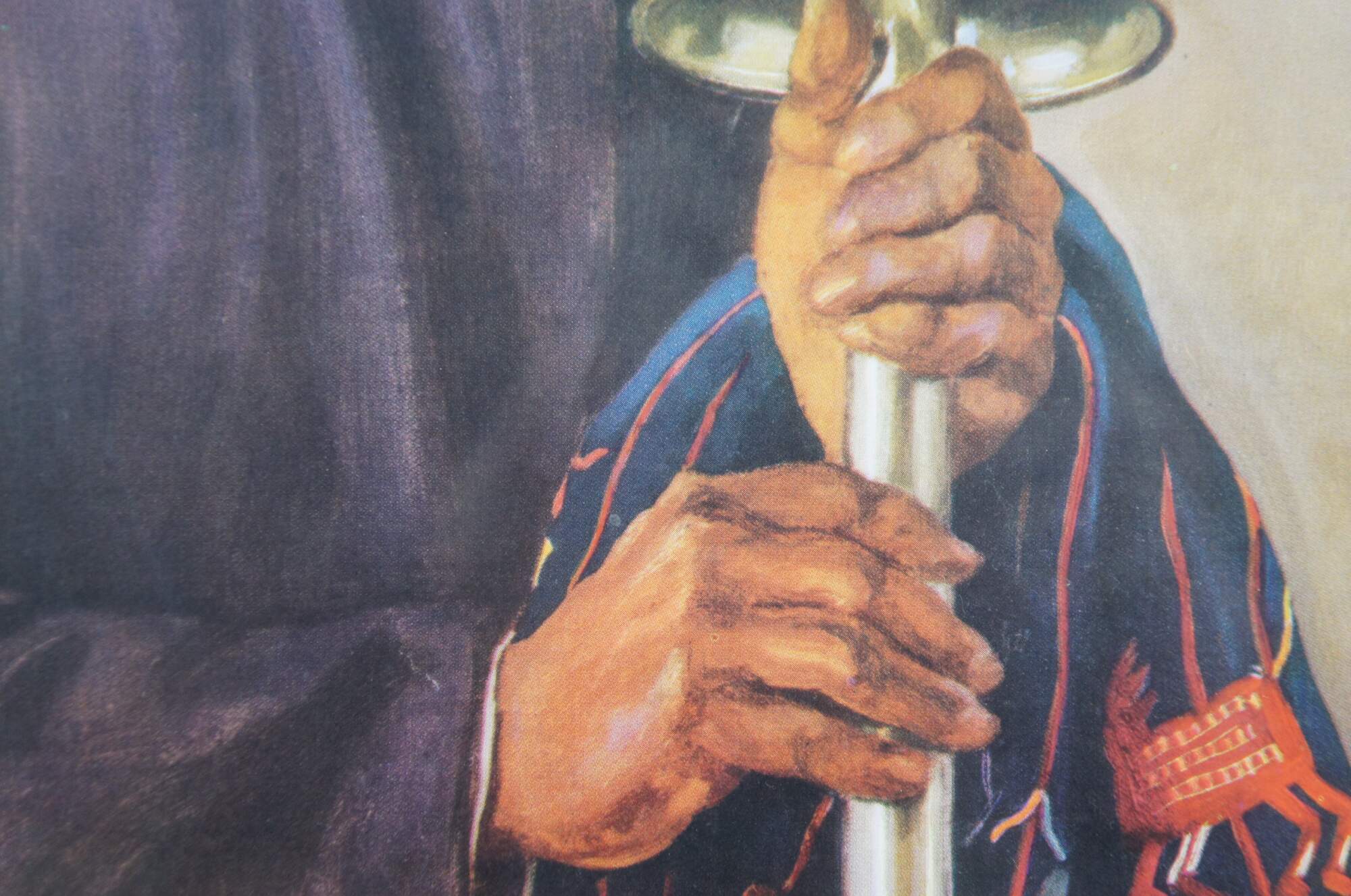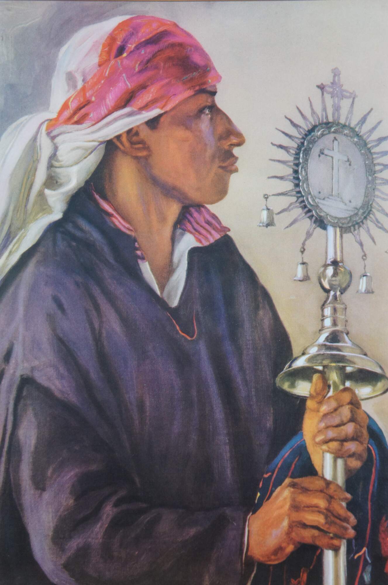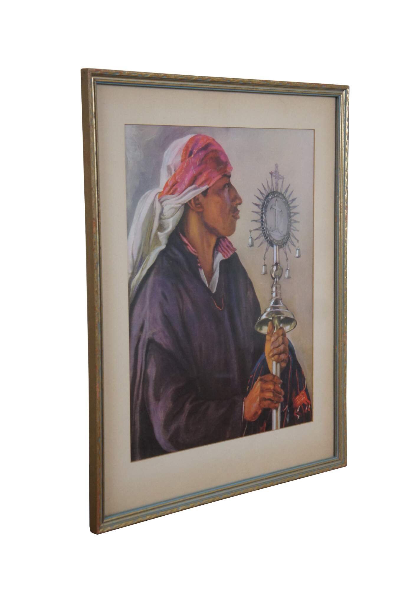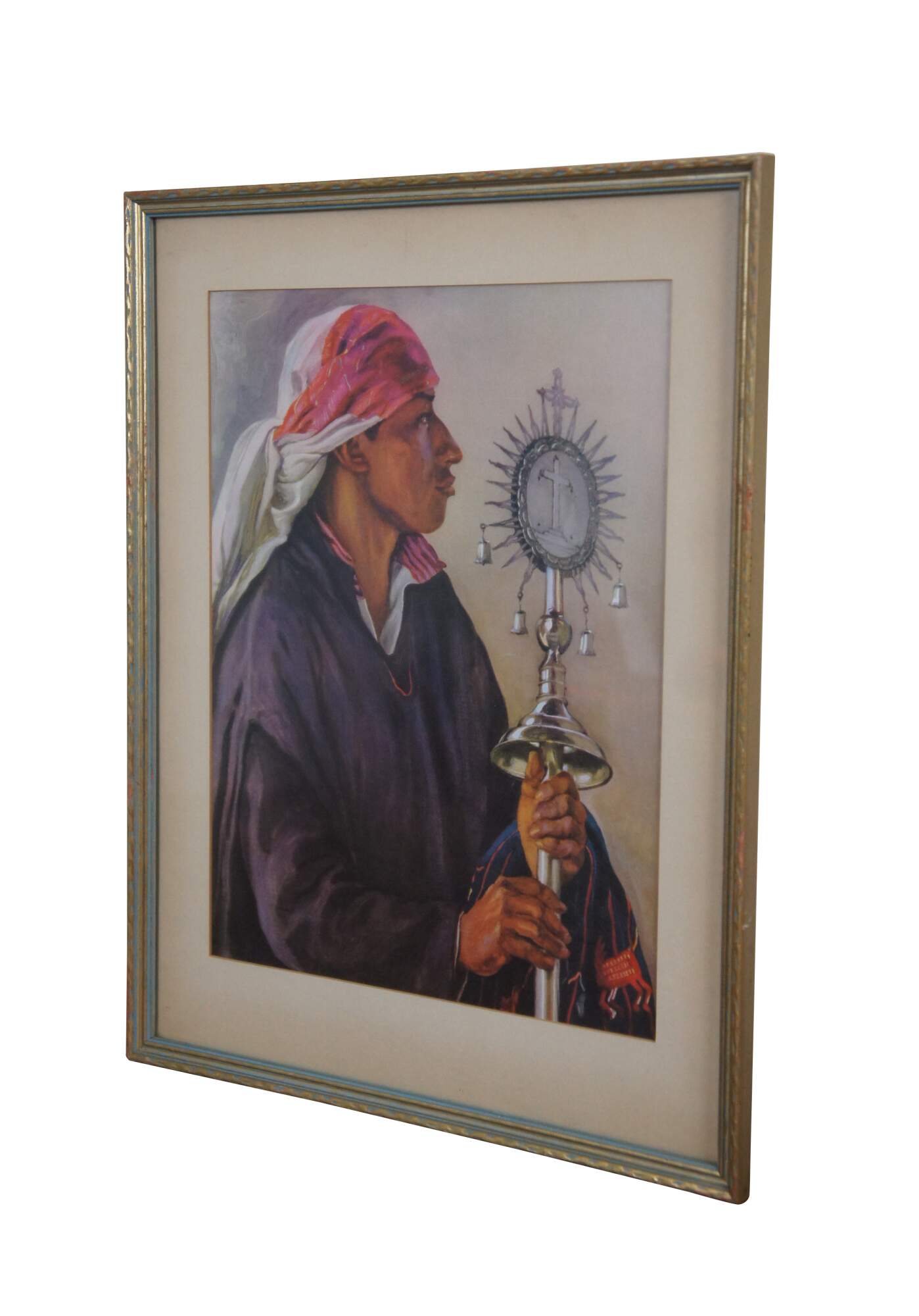 Late 20th century digital press print depicting "The Confrade (Brother) Mateo Chabaj" of San Antonio Palopo, Guatemala, painted by Alfredo Galvez Suarez. Shows Brother Mateo in a purple tunic and headscarf, holding a silver monstrance. From the art portfolio Guatemala Indians, which included 10 of his most famous Native American works. Lightly carved giltwood frame; off white mat.