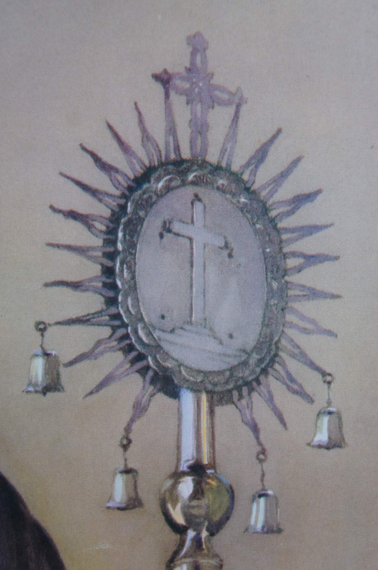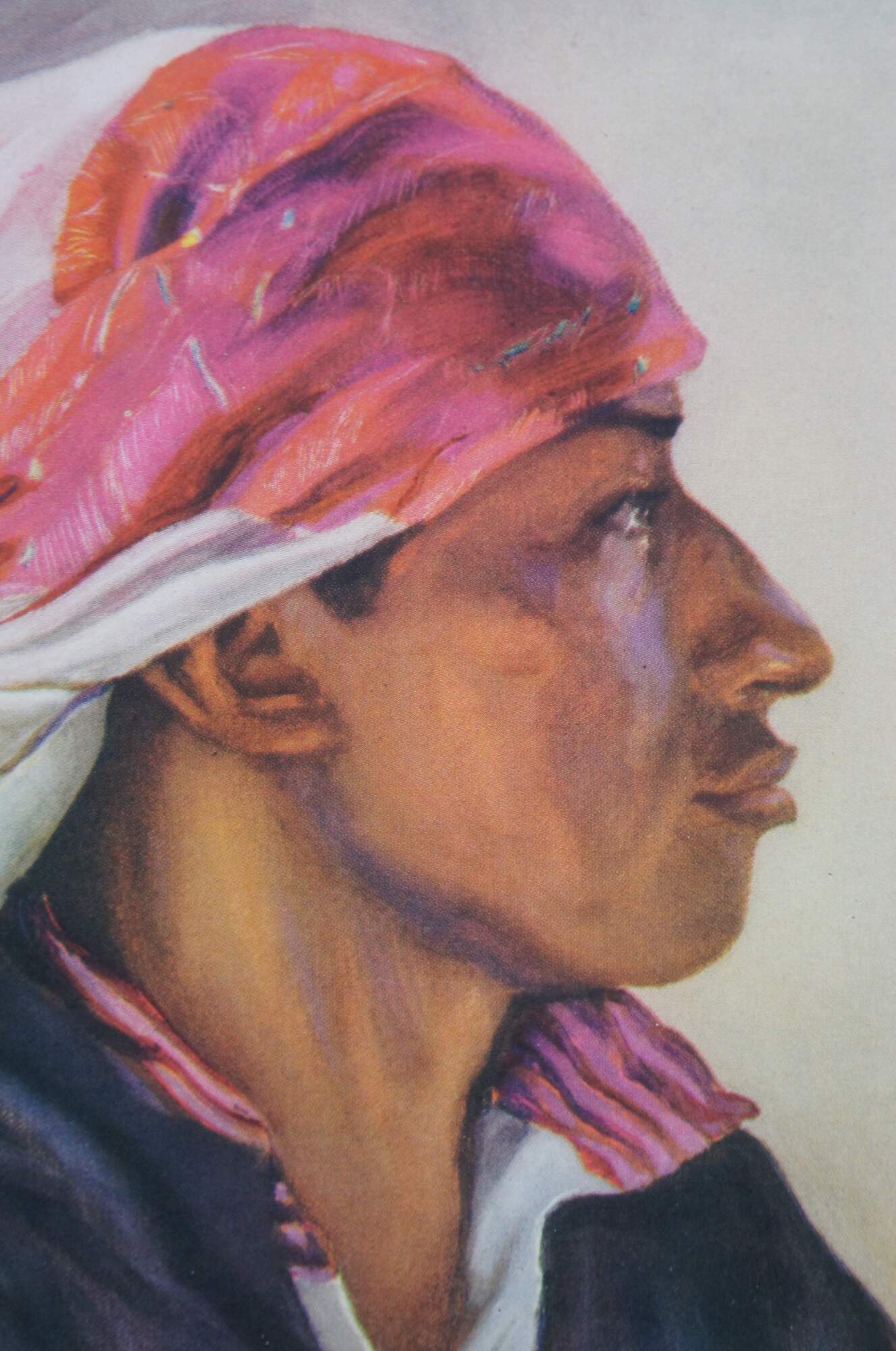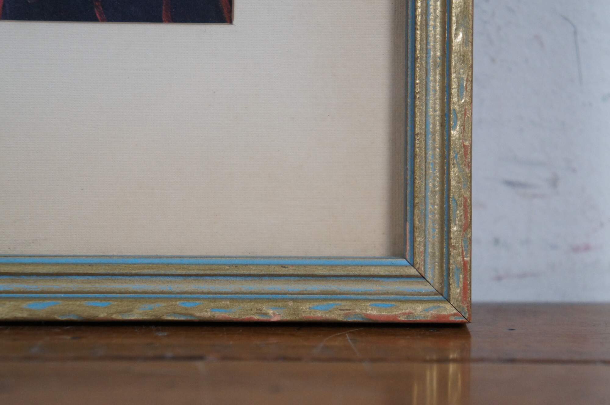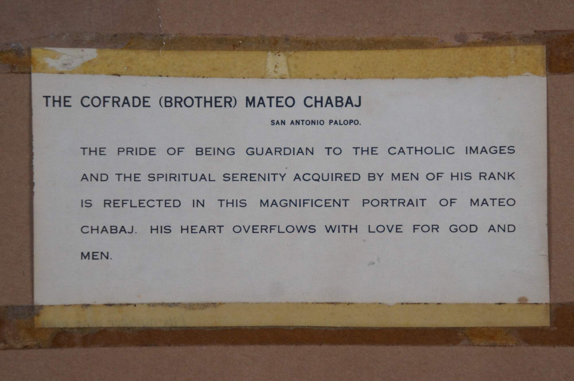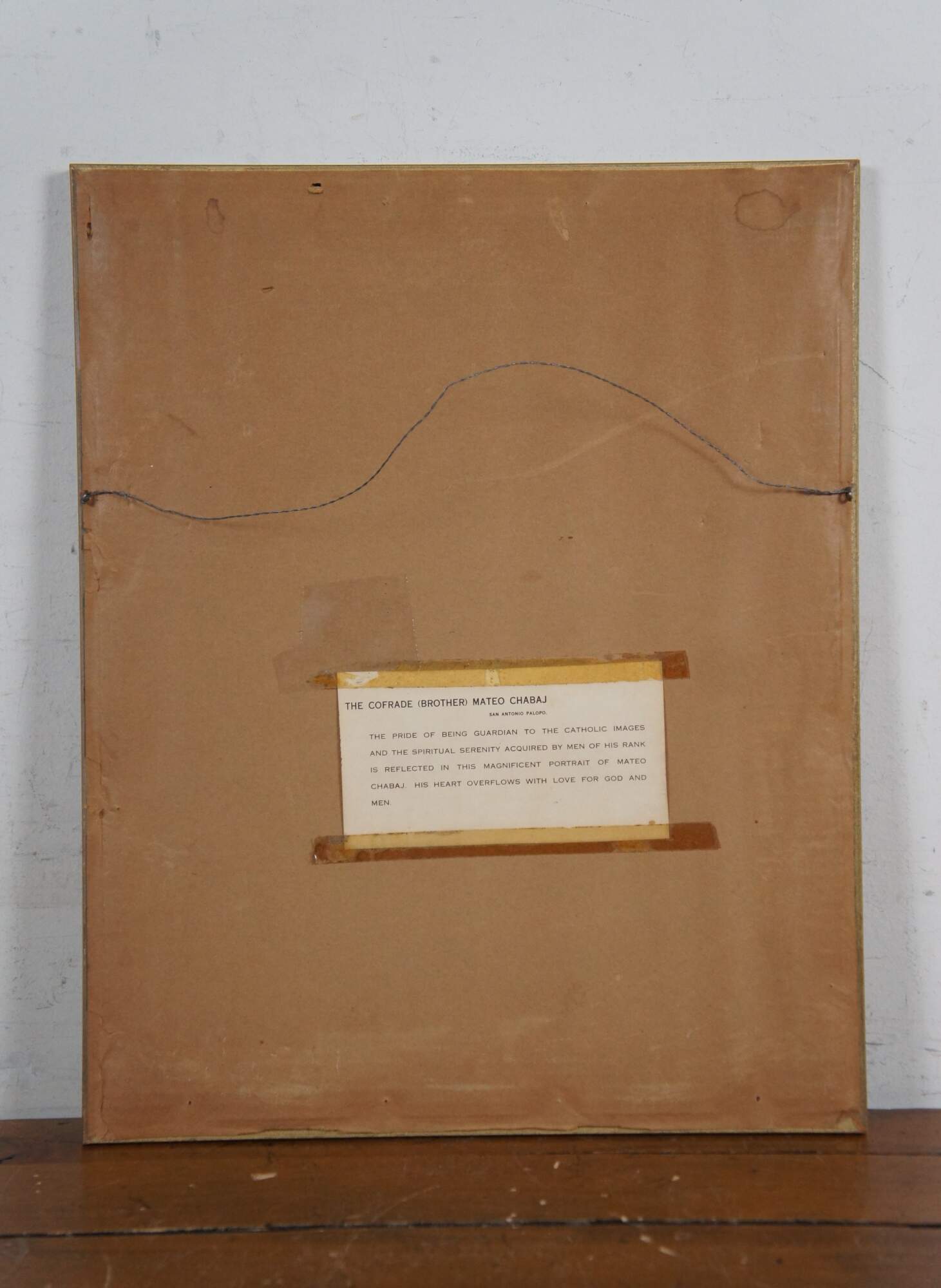 Late 20th century digital press print depicting "The Confrade (Brother) Mateo Chabaj" of San Antonio Palopo, Guatemala, painted by Alfredo Galvez Suarez. Shows Brother Mateo in a purple tunic and headscarf, holding a silver monstrance. From the art portfolio Guatemala Indians, which included 10 of his most famous Native American works. Lightly carved giltwood frame; off white mat.