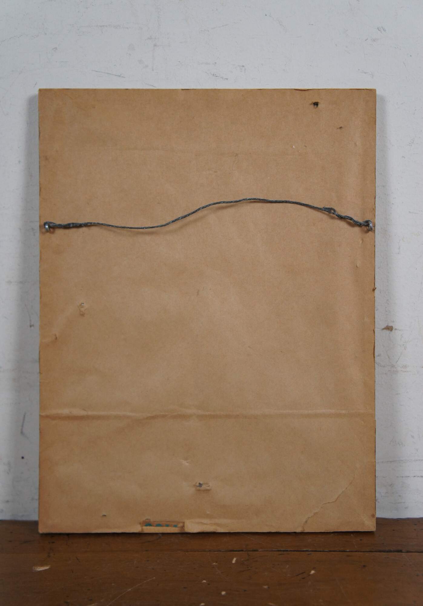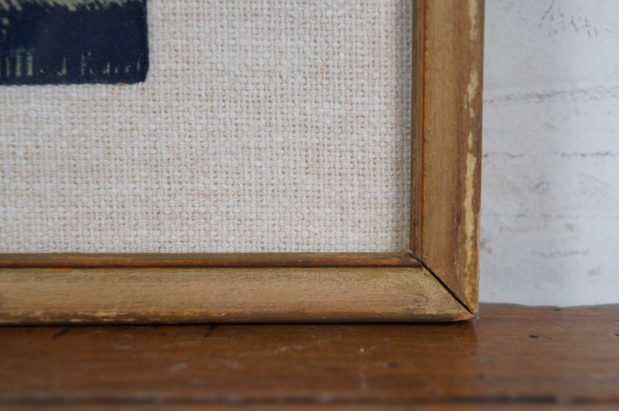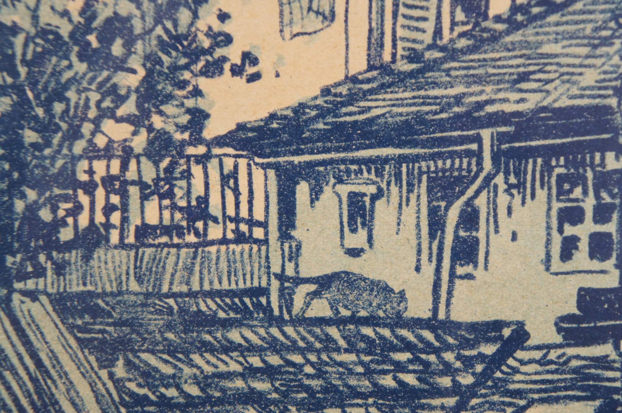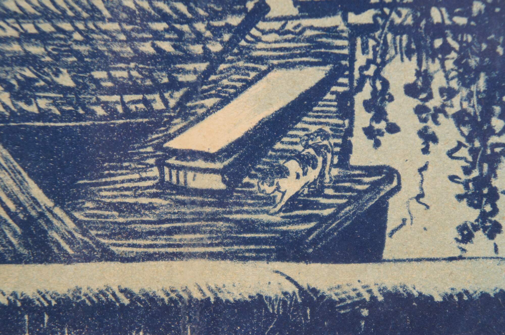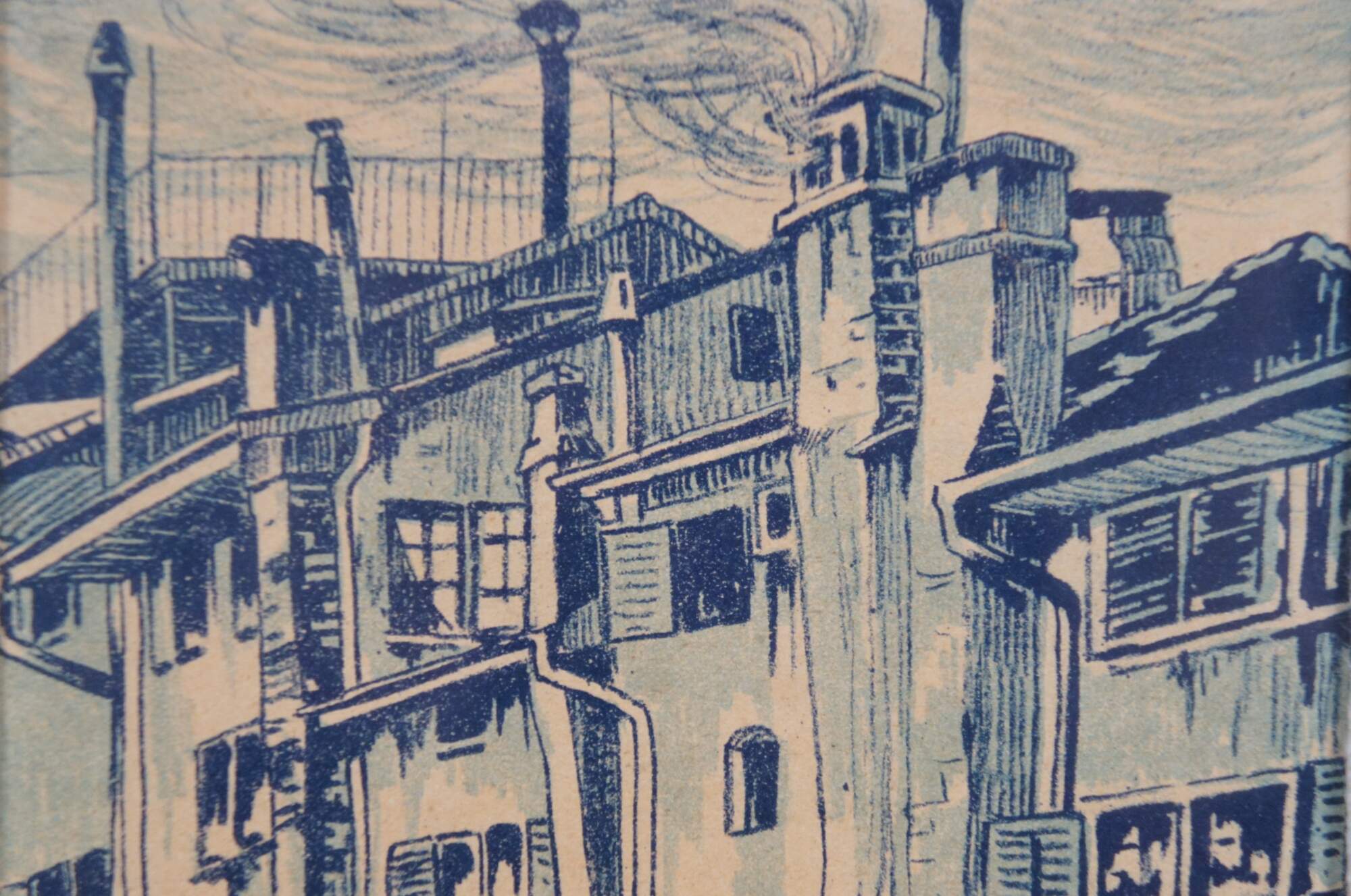 Mid to late 20th century German print depicting a view of tightly packed rooves and apartment buildings, with two cat in the foreground. Beveled gold painted frame, beige fabric mat.