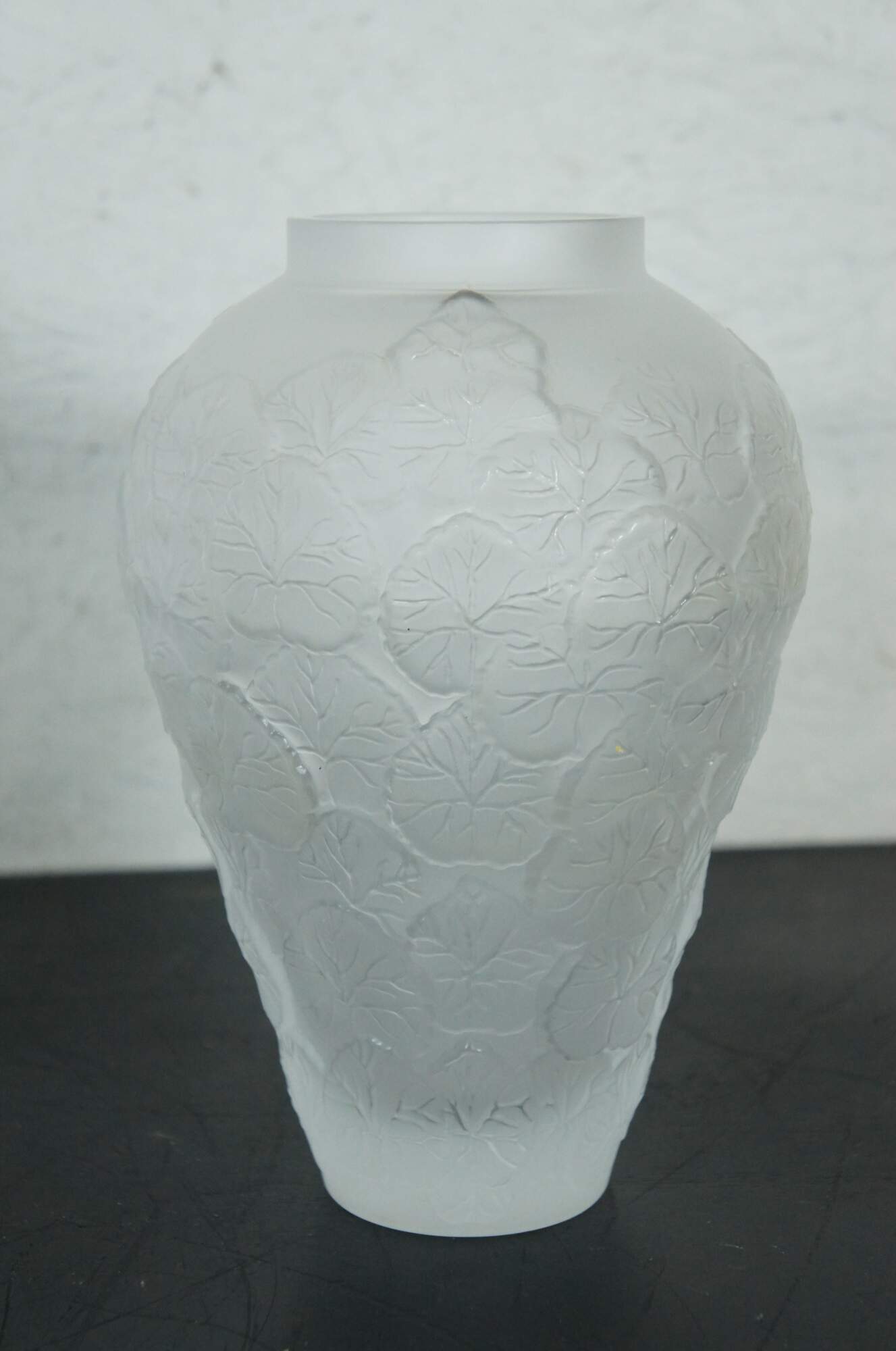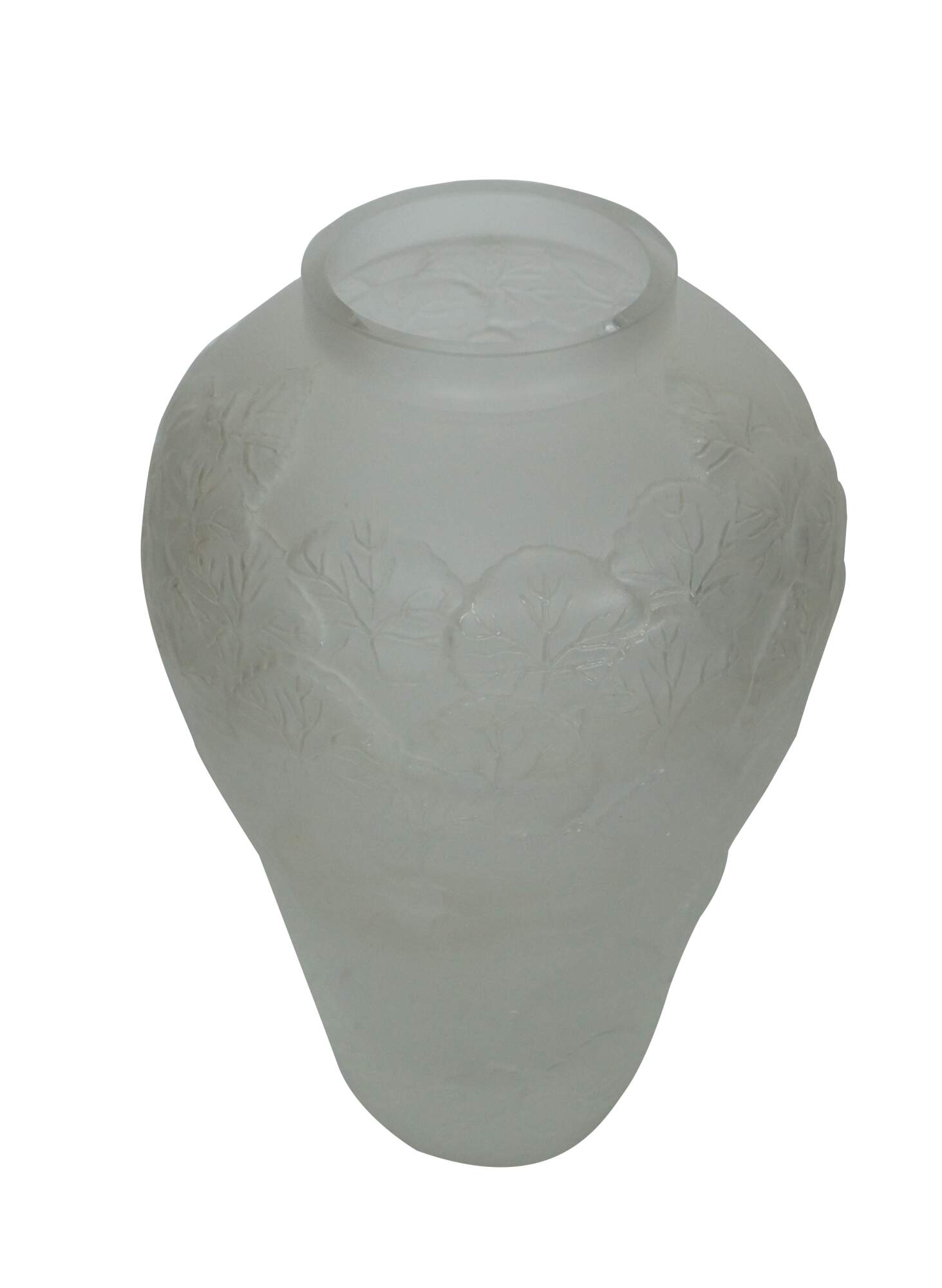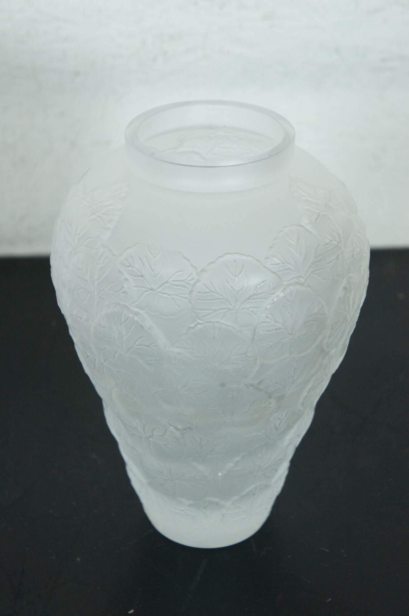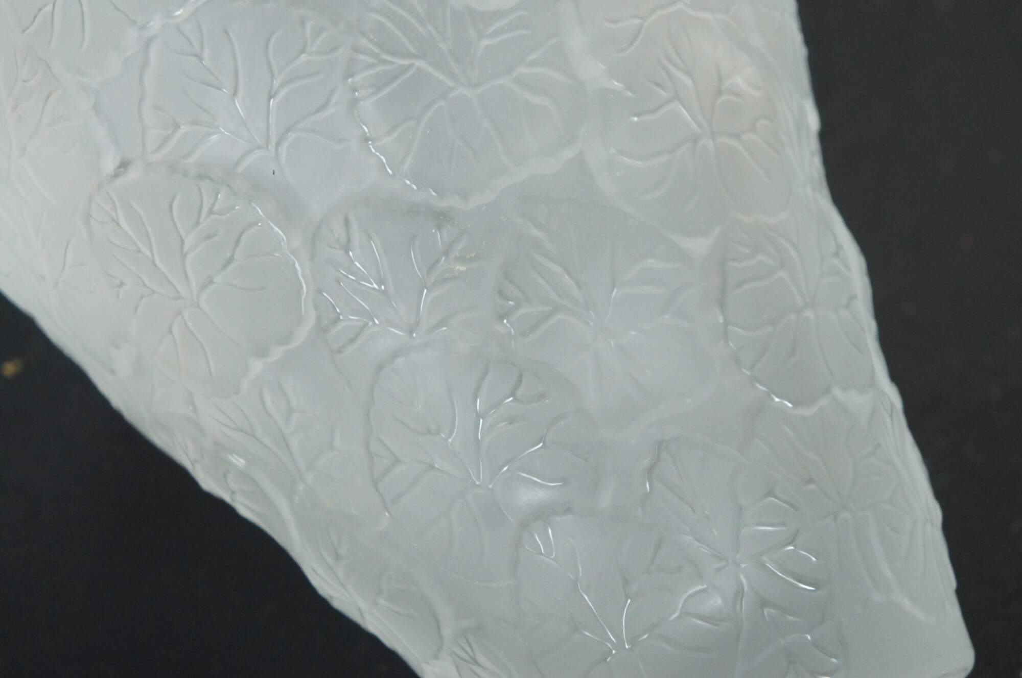 A large vintage Pheonix Consolidated frosted glass vase, featuring a round bulbbous top with a tapered base, molded with an overlapping pattern of heavily veined lotus leaves.