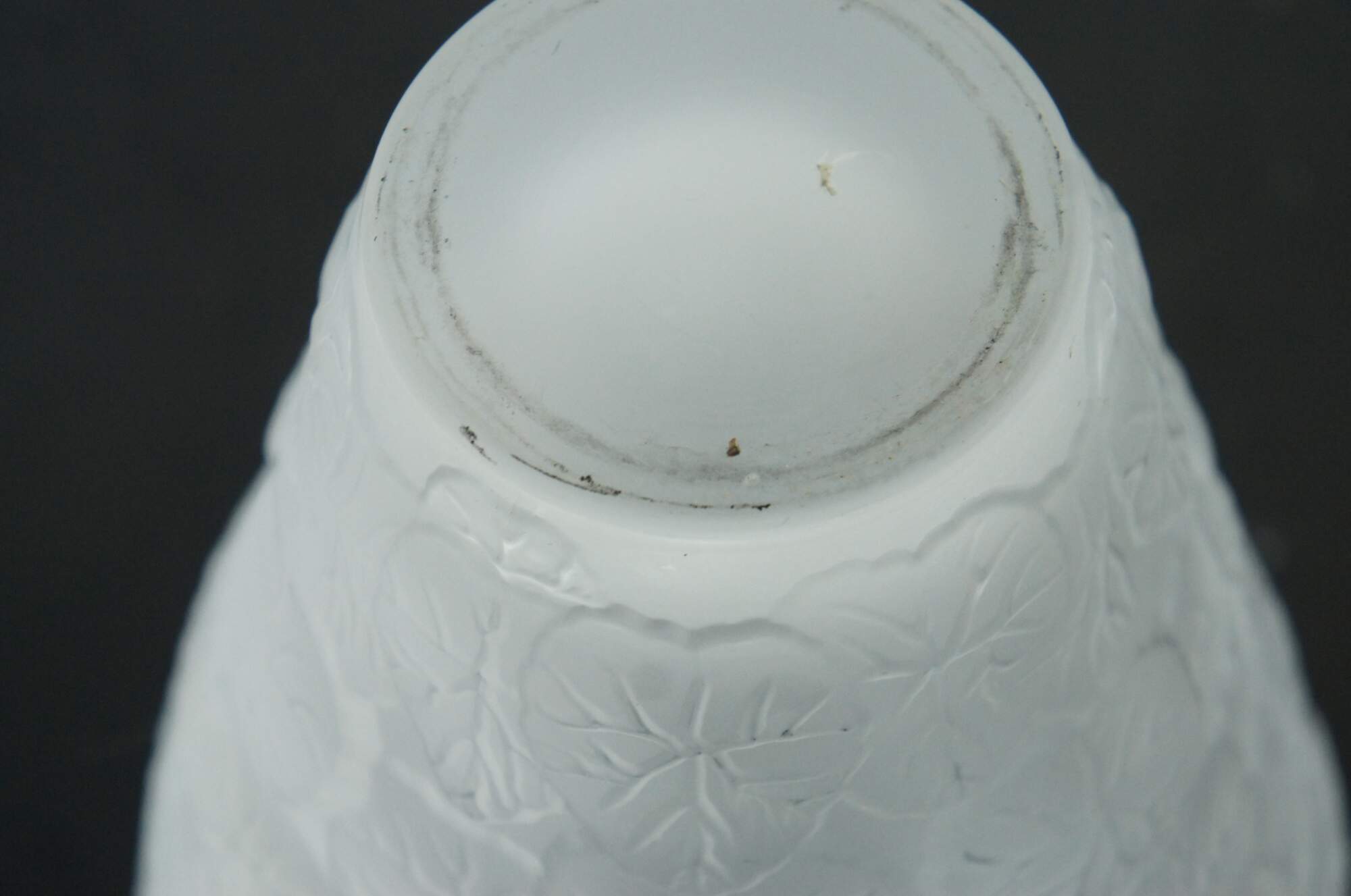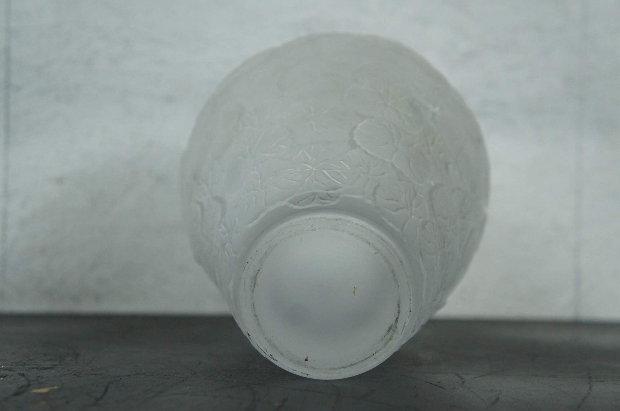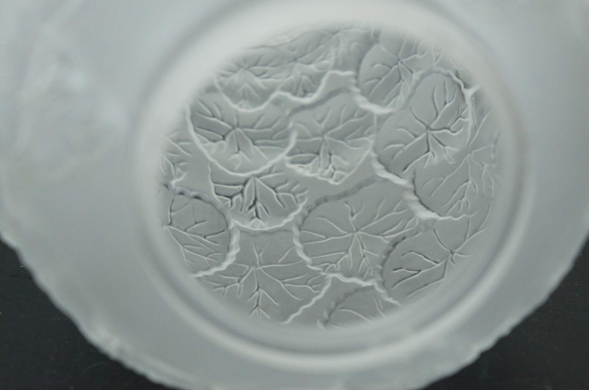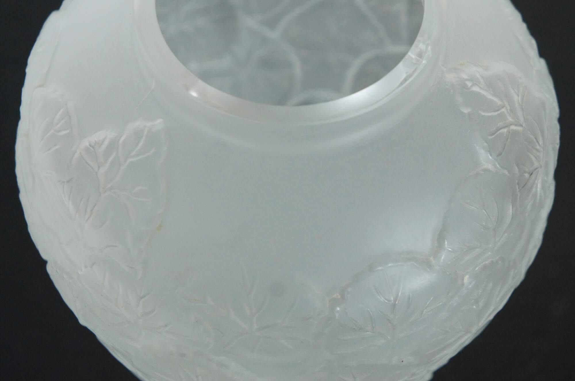 A large vintage Pheonix Consolidated frosted glass vase, featuring a round bulbbous top with a tapered base, molded with an overlapping pattern of heavily veined lotus leaves.