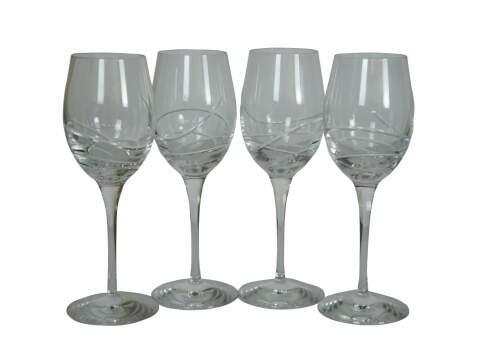Set of 4 late 20th century Waterfiord crystal Ballet Ribbon Essence Platinum stemmed wine glasses. Features a sleek, modern, swirling ribbon design. Marked on base. 142832.