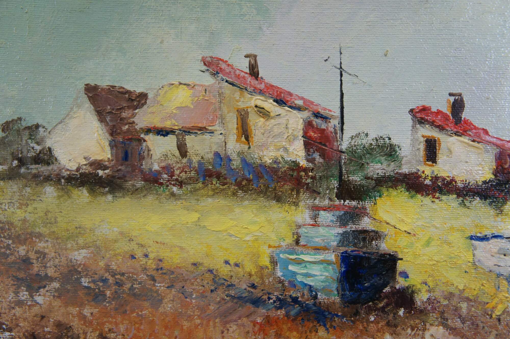 Vintage Impressionist oil painting on canvas by Joseph Nagy. It features a landscape theme of houses overlooking two beached sailboats / boats and water. Signed lower right.