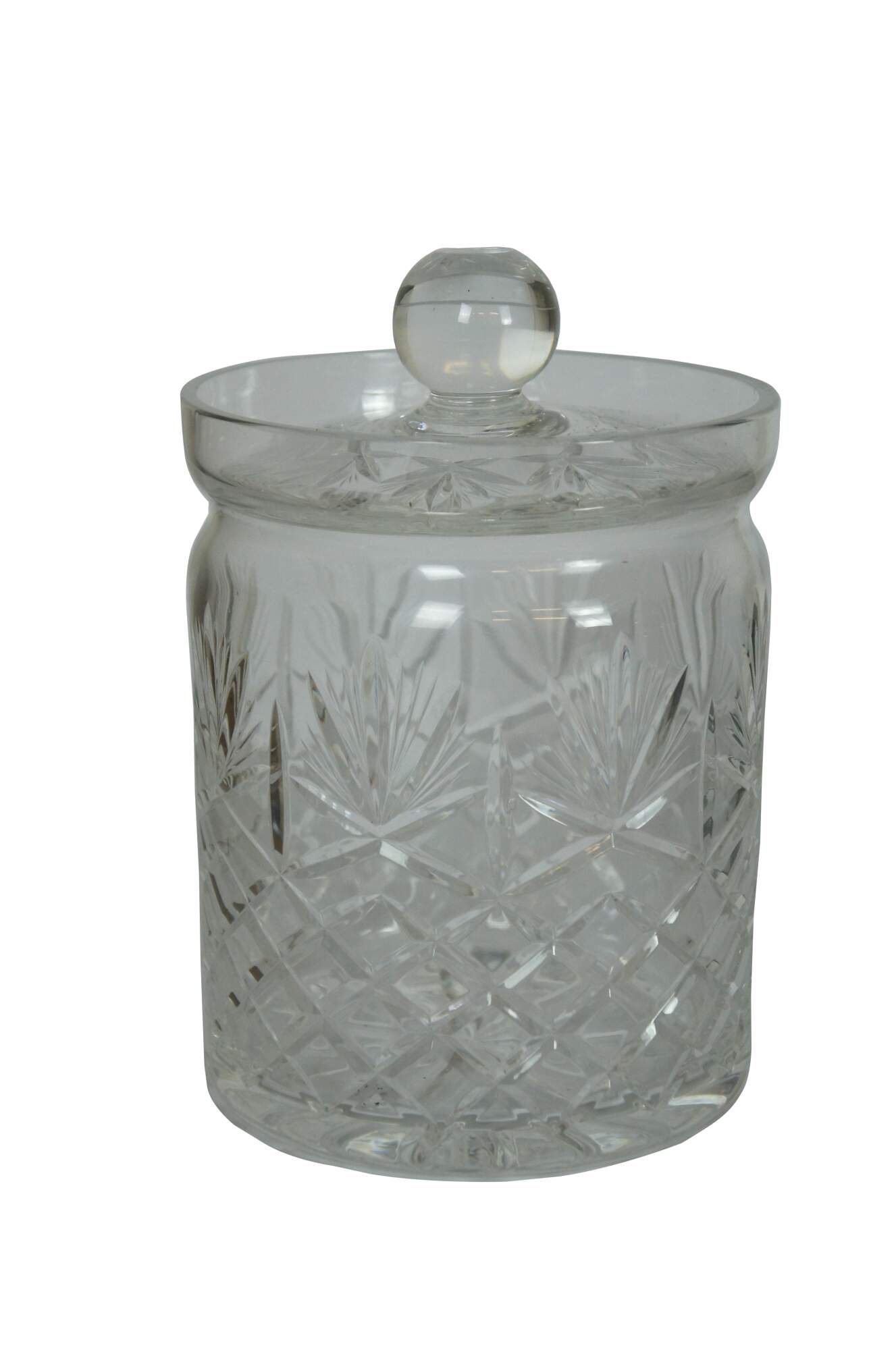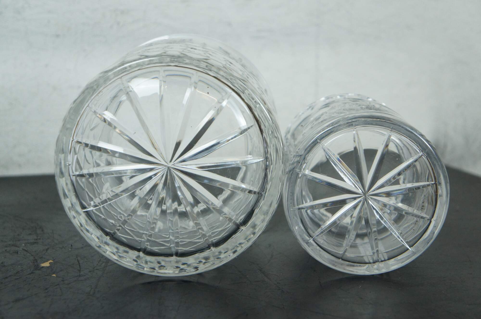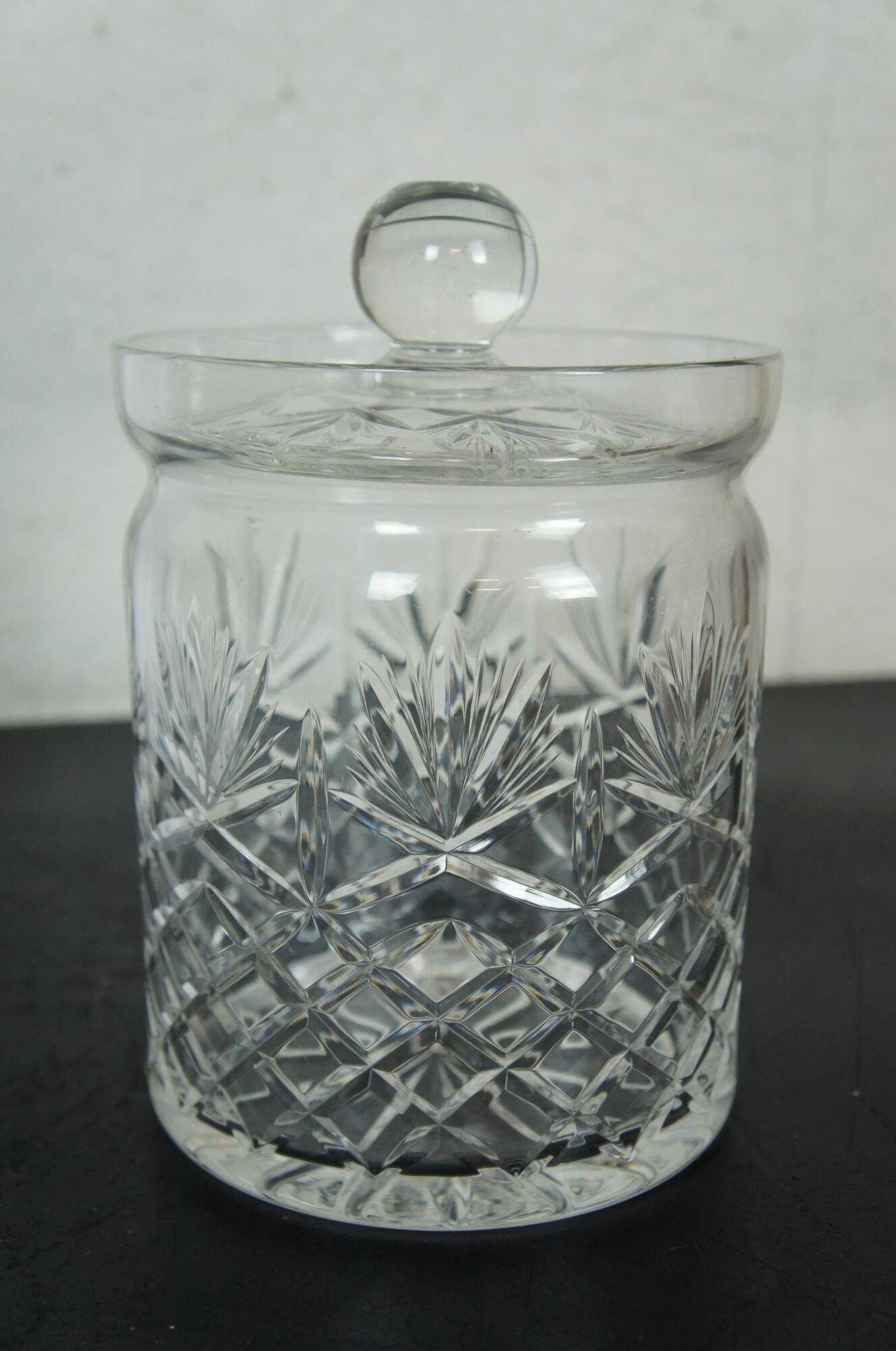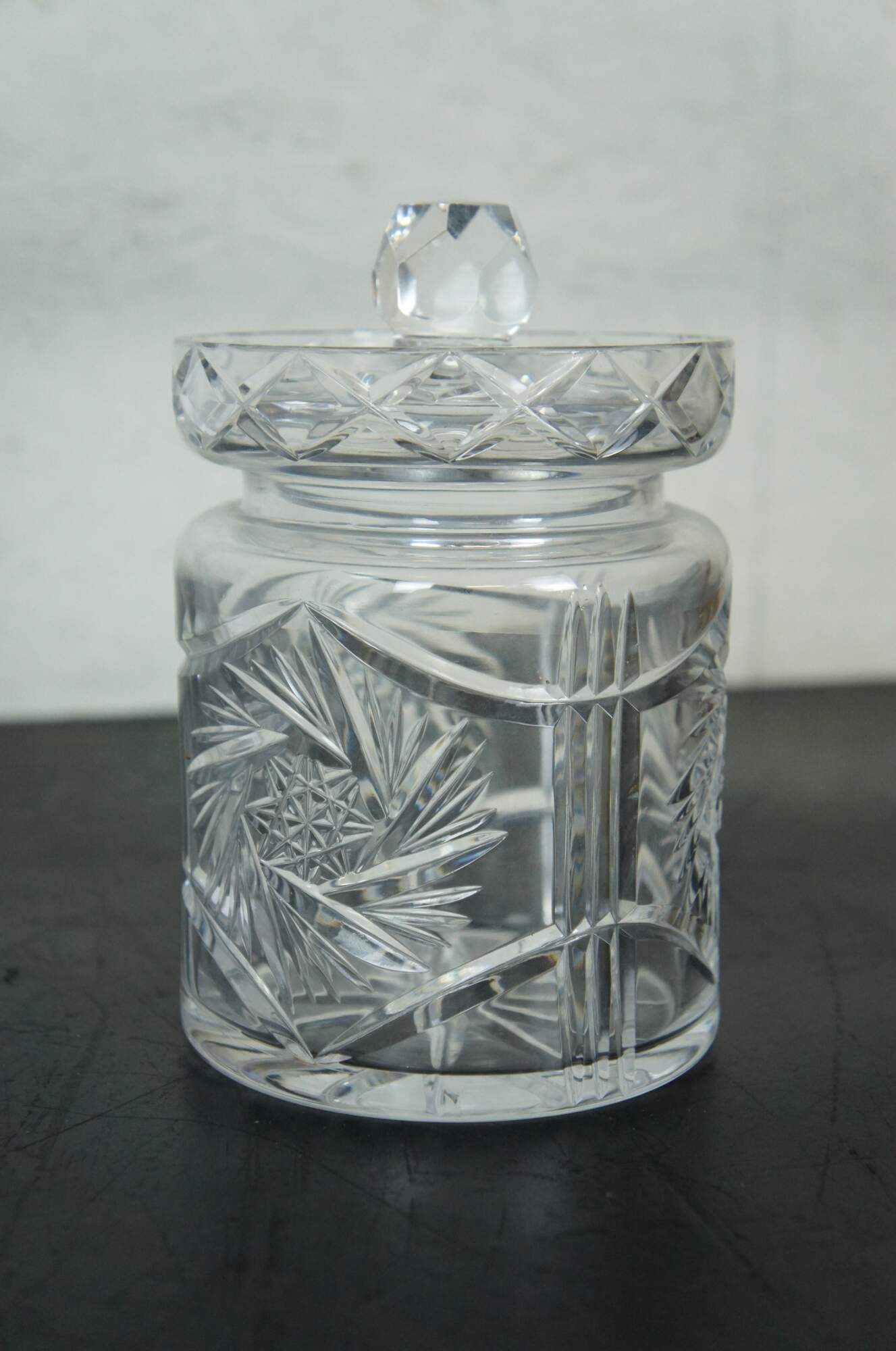 Pair of mid to late 20th century cut crystal lidded biscuit apothecary jars. One features a diamond and fan / leaf design. The other features a pinsheel motif around an eight pointed star.