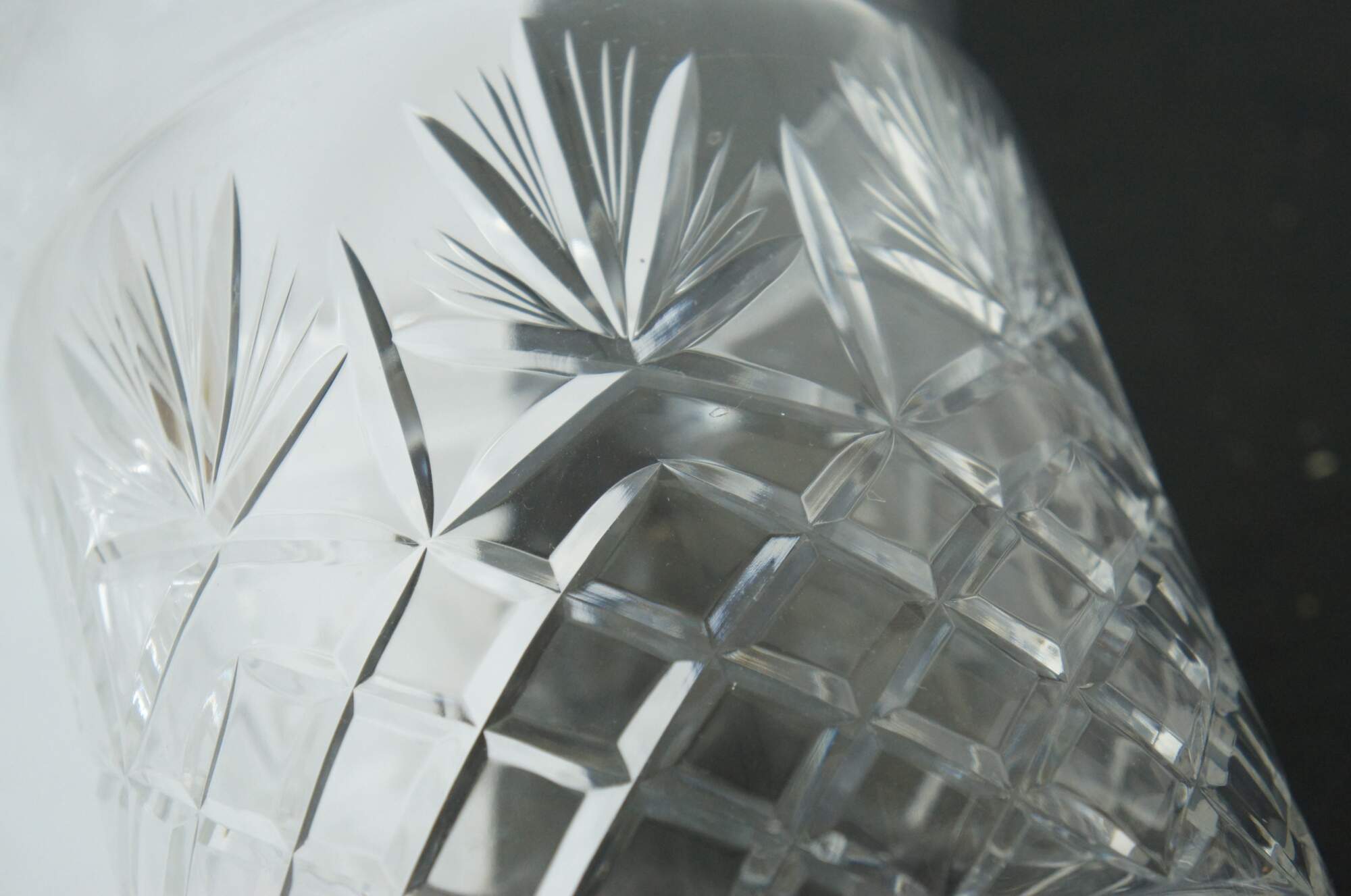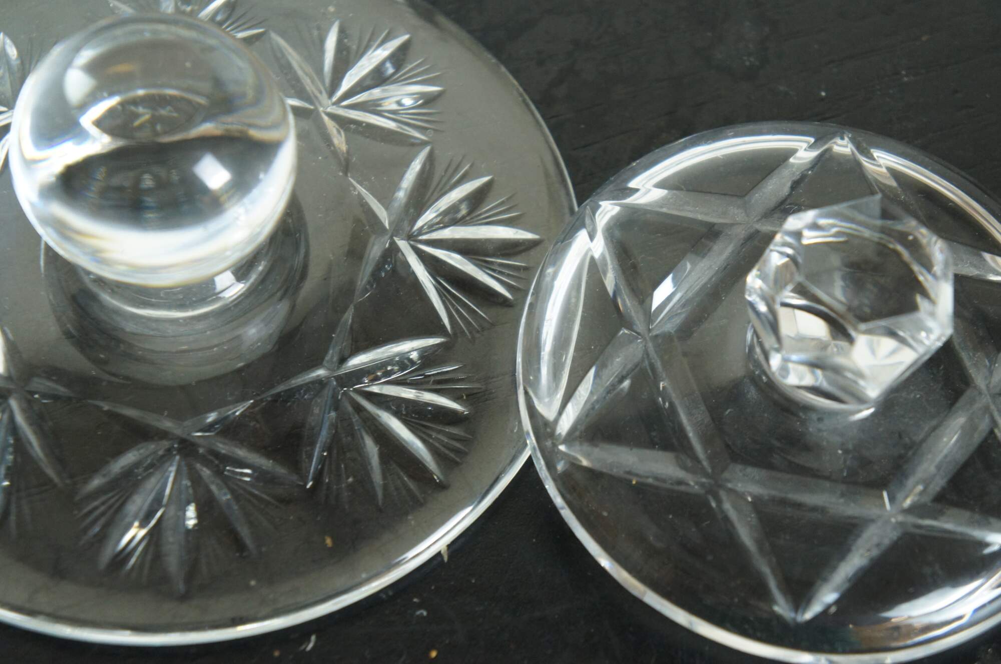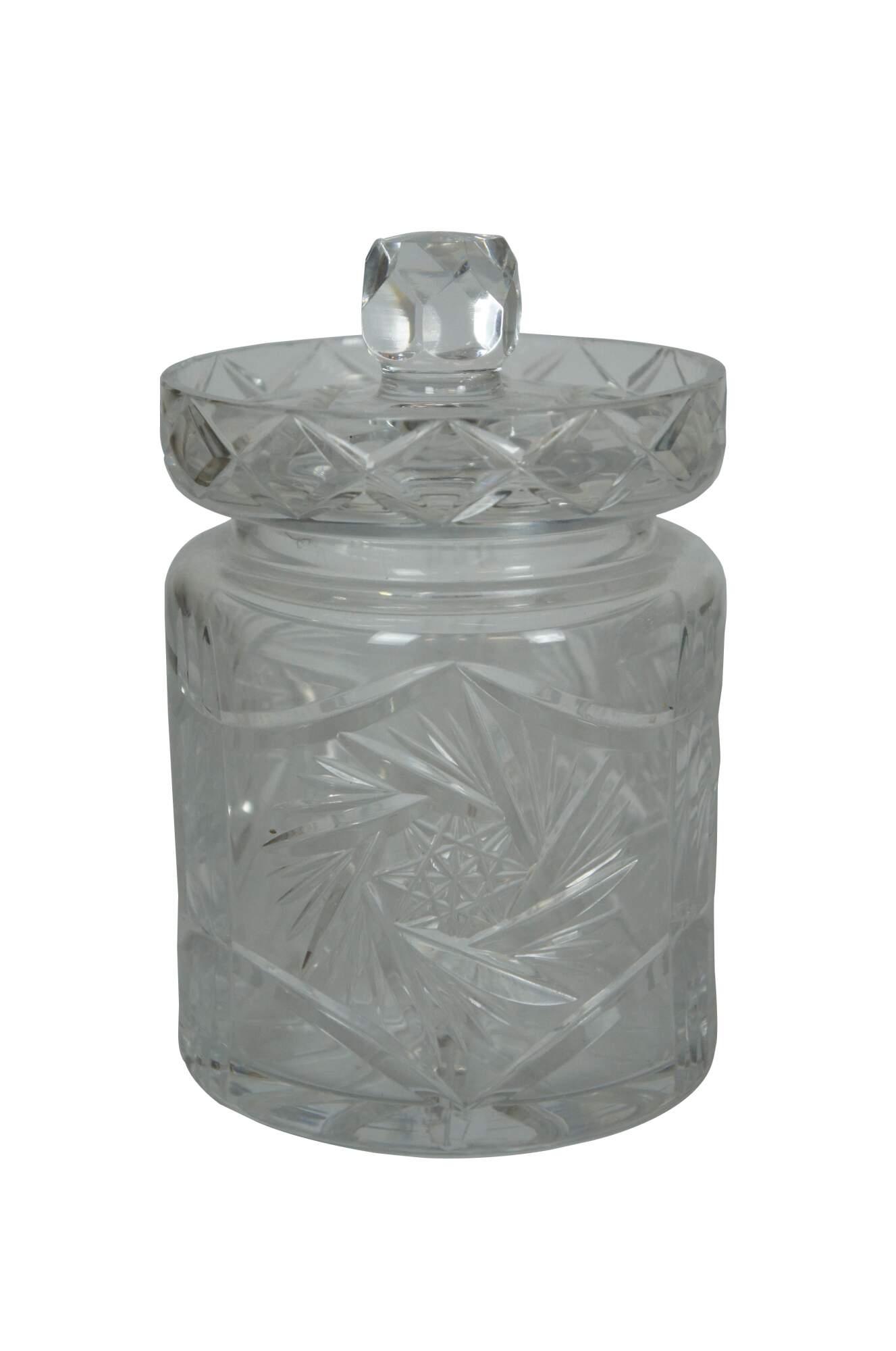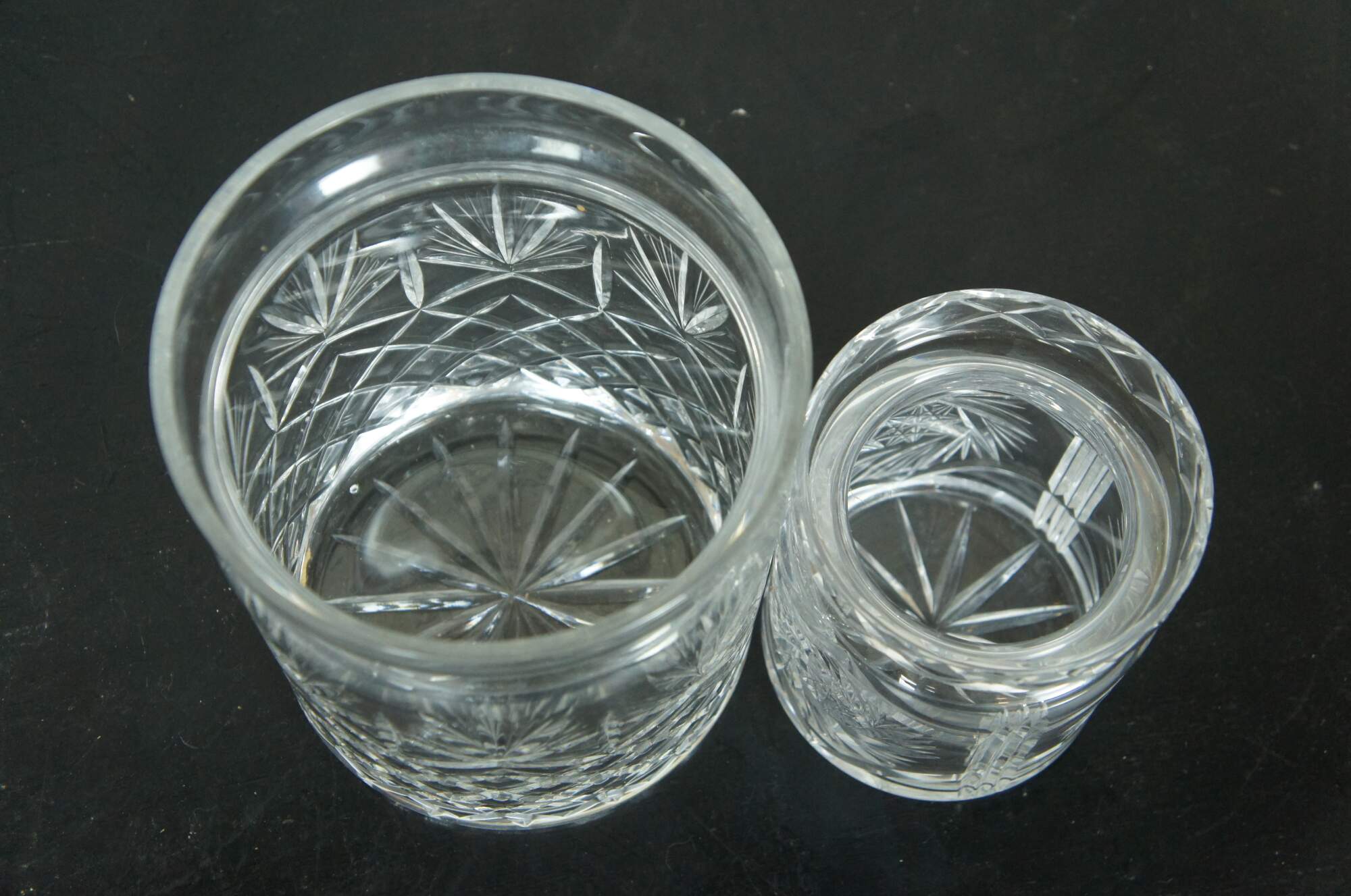 Pair of mid to late 20th century cut crystal lidded biscuit apothecary jars. One features a diamond and fan / leaf design. The other features a pinsheel motif around an eight pointed star.