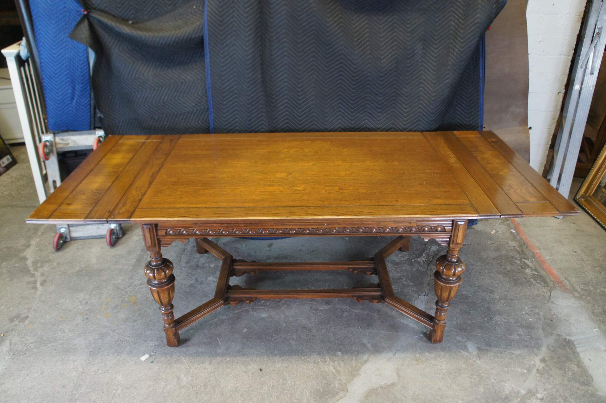 An Impressive early 20th century Elizabethan or Jacobean style Oak Draw-Leaf table. Features a rectangular plank top with pull-out leaves on each end, Bulbous carved legs and notched feet connected by stretchers.