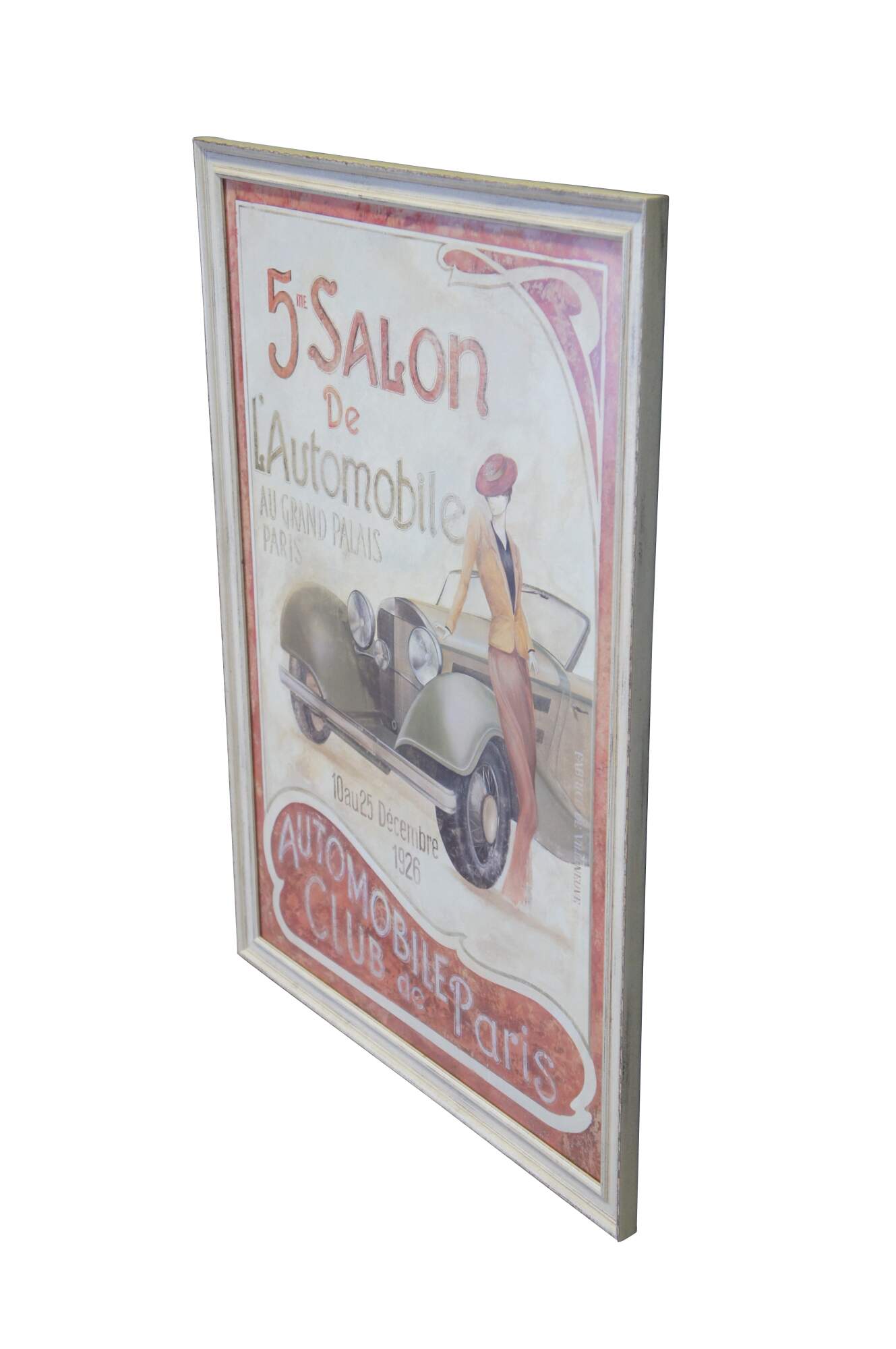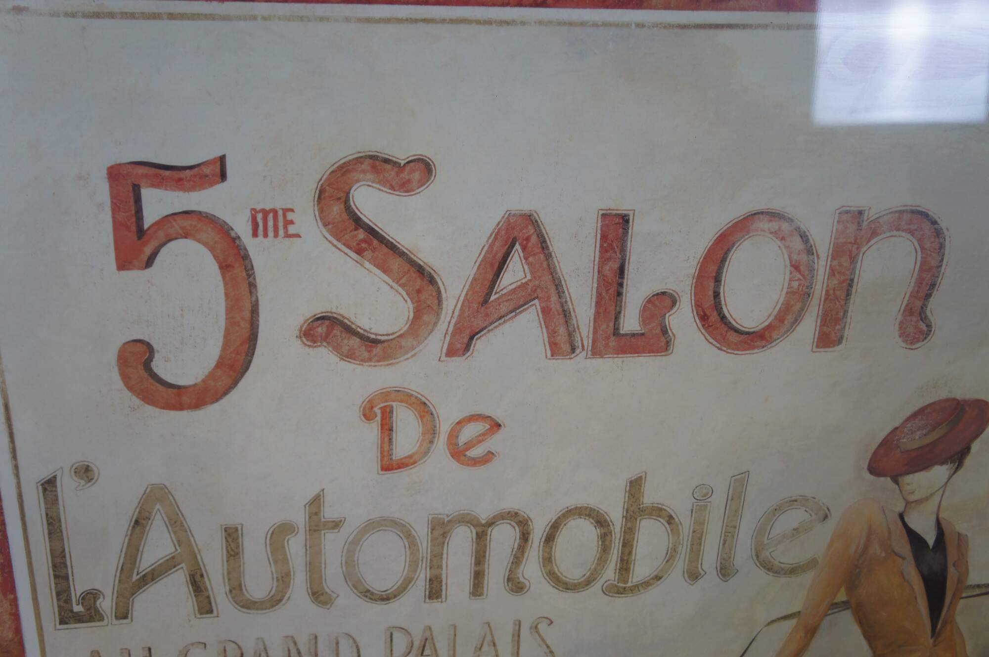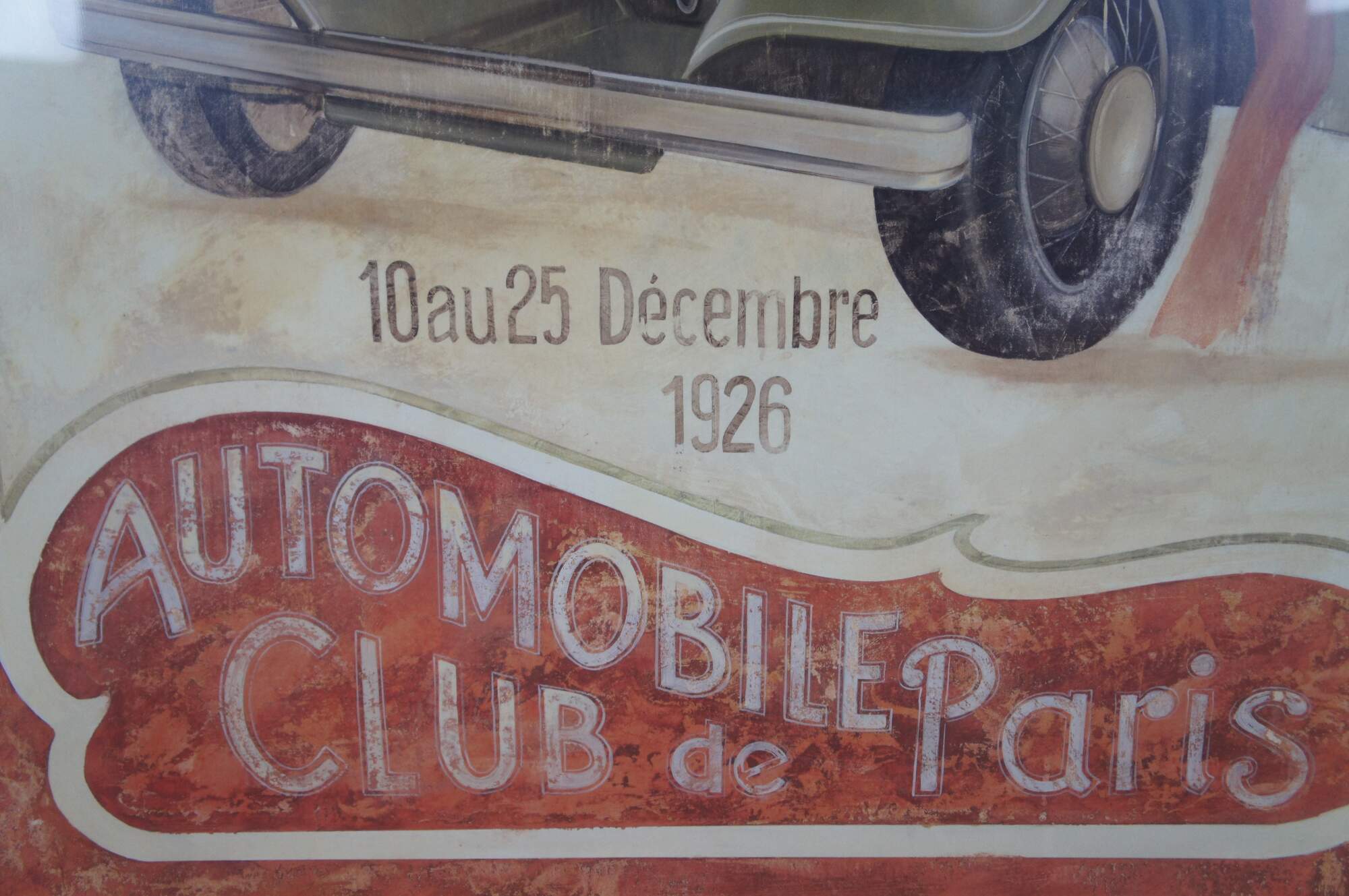 Vintage French Fabrice de Villeneuve framed car show poster print featuring a Victorian Art Deco themed advertisement for the Automobile Club of Paris France in 1926. 5 Me Salon De L'Automobile Au Grand Palais Paris, 10au25 December 1926.