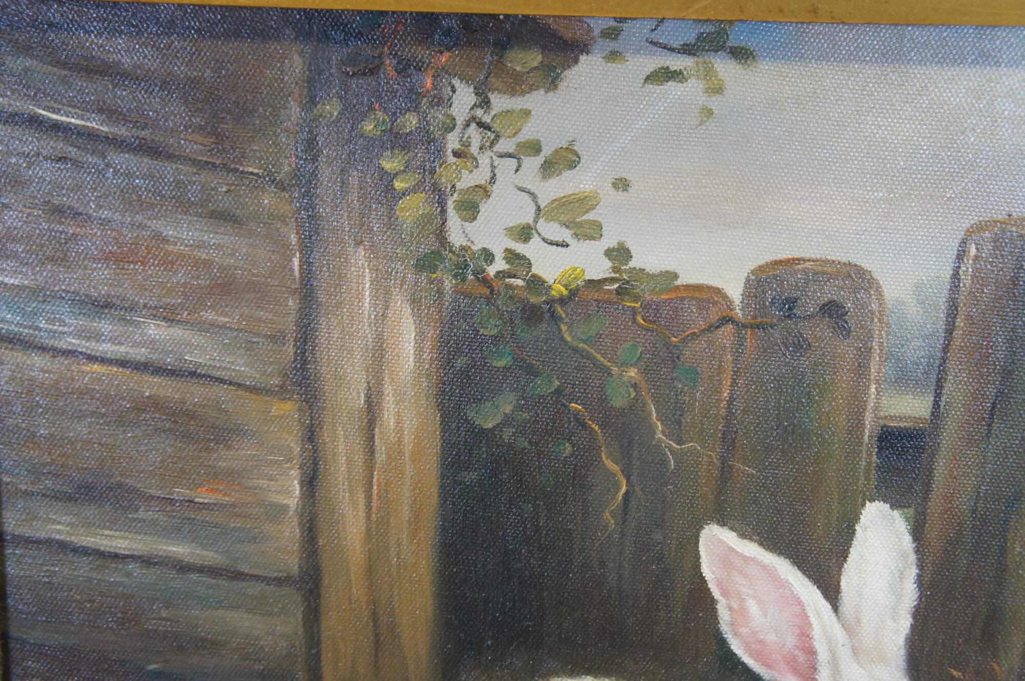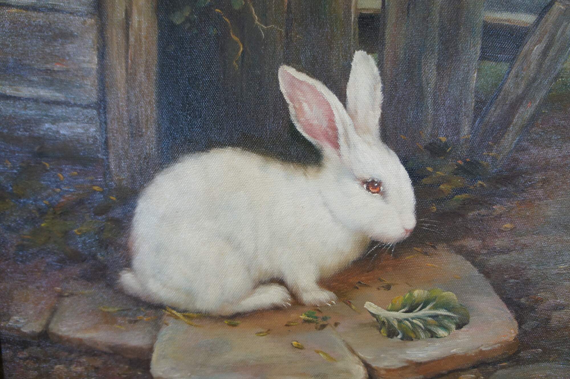 20th century C. Garnet realist bunny / rabbit landscape / portrait oil painting on canvas featuring a white rabbit eating lettuce or a leaf in the garden. Framed in ornate gold acanthus design frame with black accents. Signed lower right.