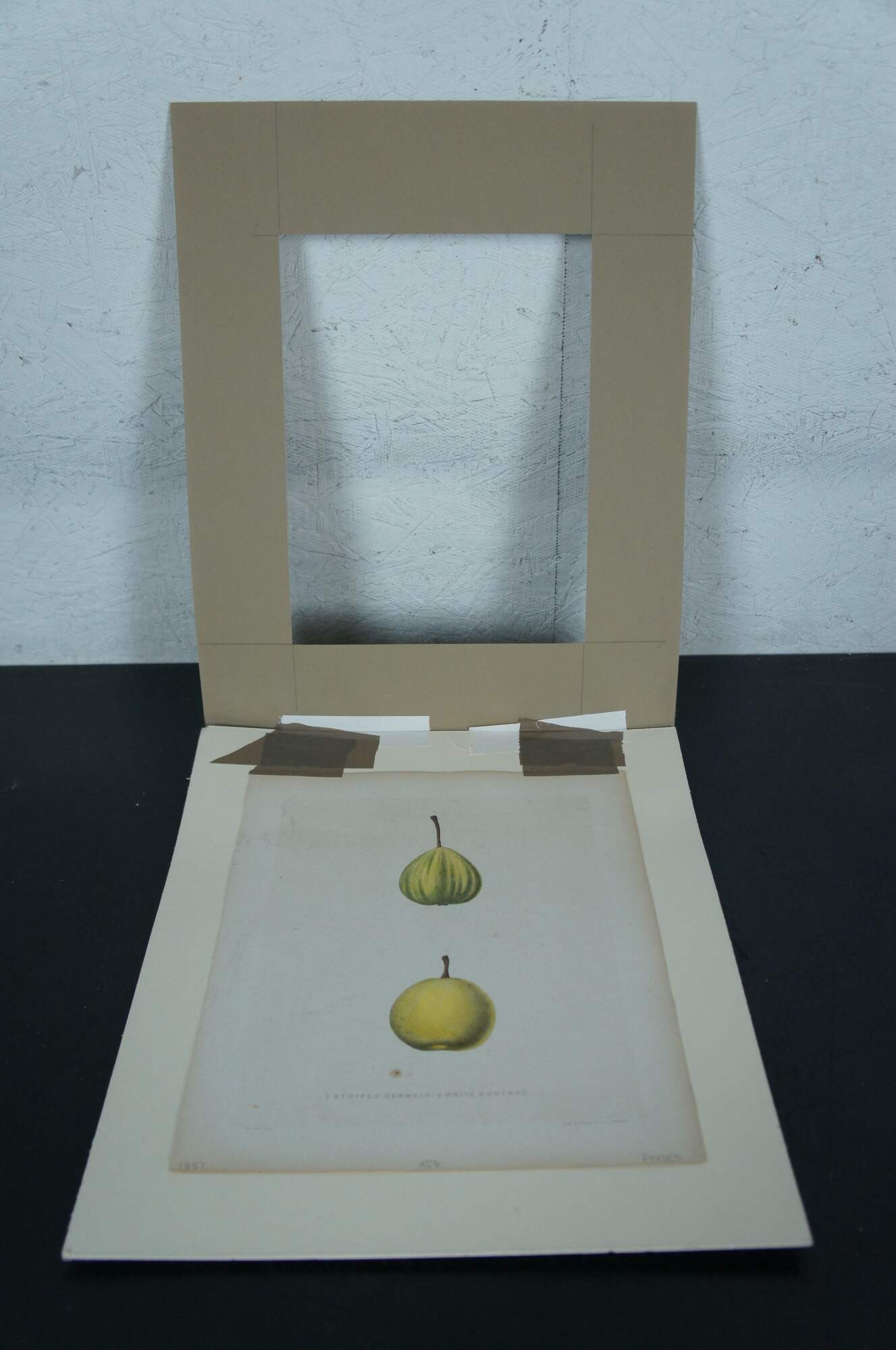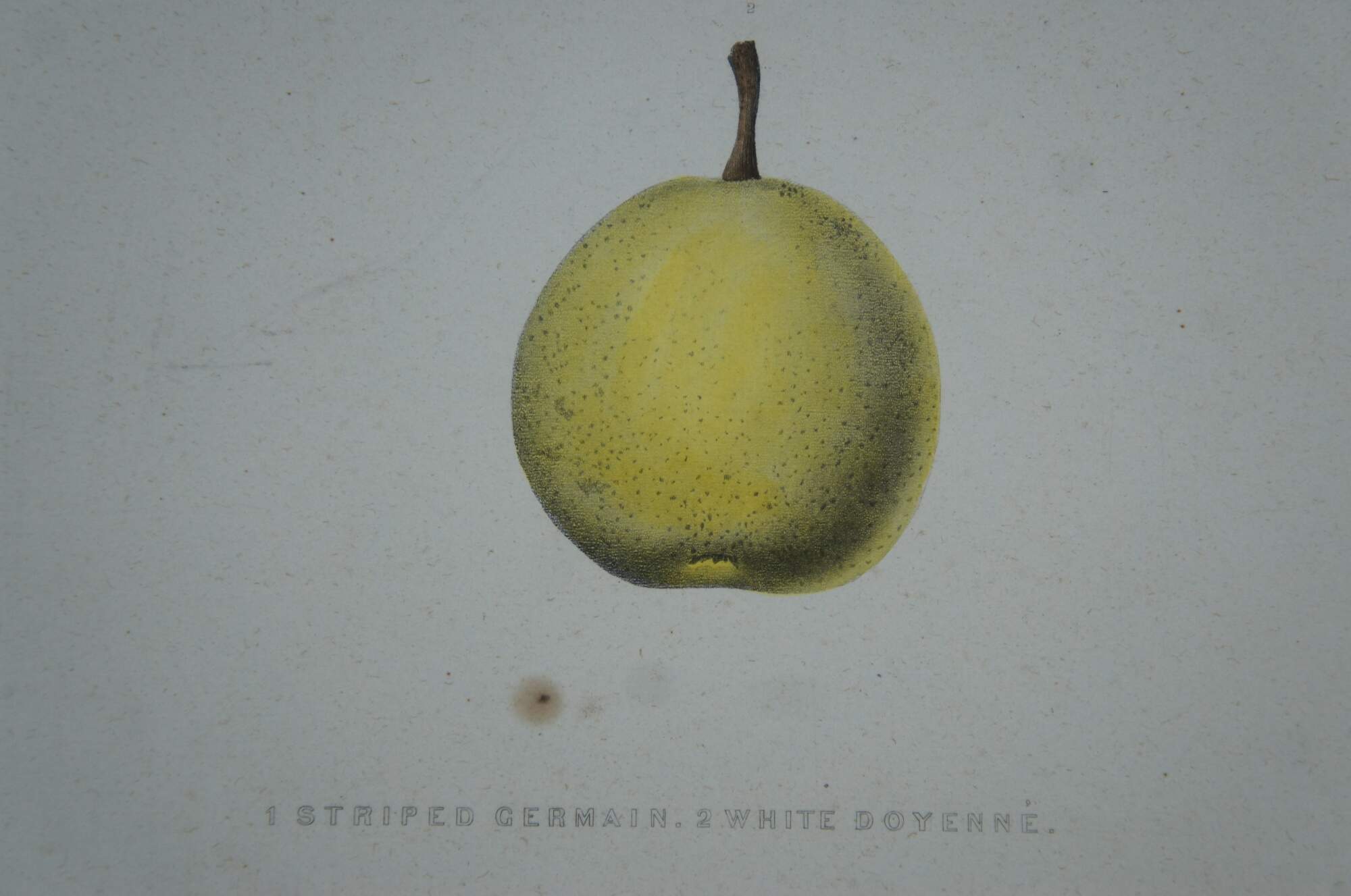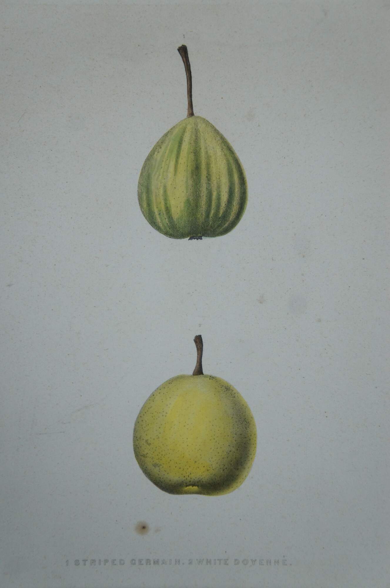 Antique Victorian ear circa 1851 colored botanical engraving / print depicting 1) Striped Germain and 2) White Doyenne pears. Drawn by Joseph Prestele. Engraved and Printed by J.I. and R.H. Pease. Matted in beige; un-framed.