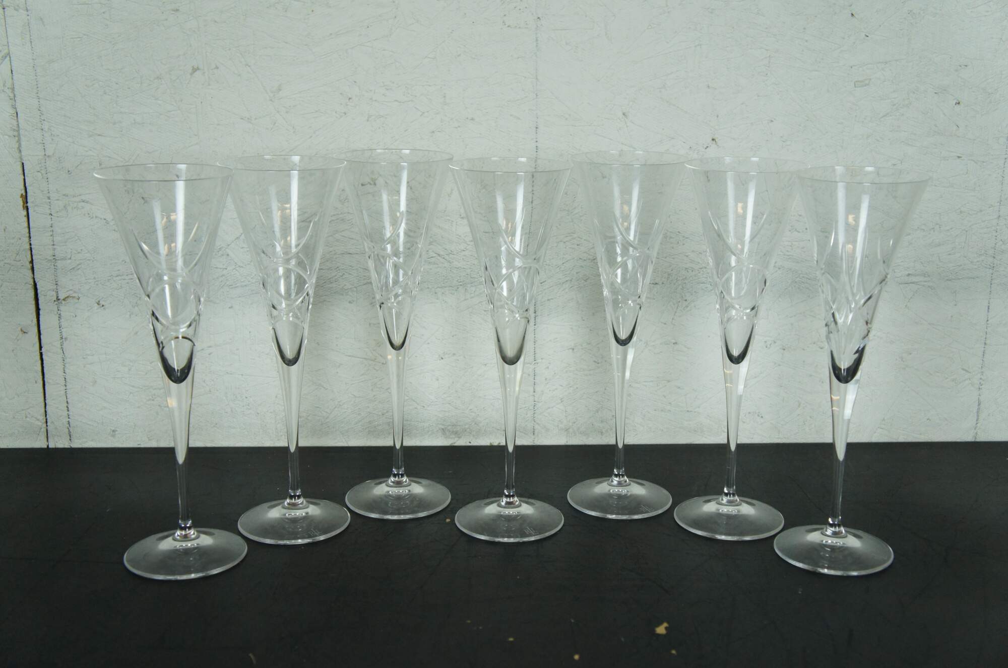 Late 20th century 46 piece lot of Ralph Lauren cut crystal barware / glassware in the Royalton pattern. Lot includes: whiskey decanter with stopper, vase, round bowl, 16 shot glasses, 7 wine glasses, 7 trumpet champagne flutes, 7 standard champagne flutes, and 6 martini glasses. Retired design. Marked on base.