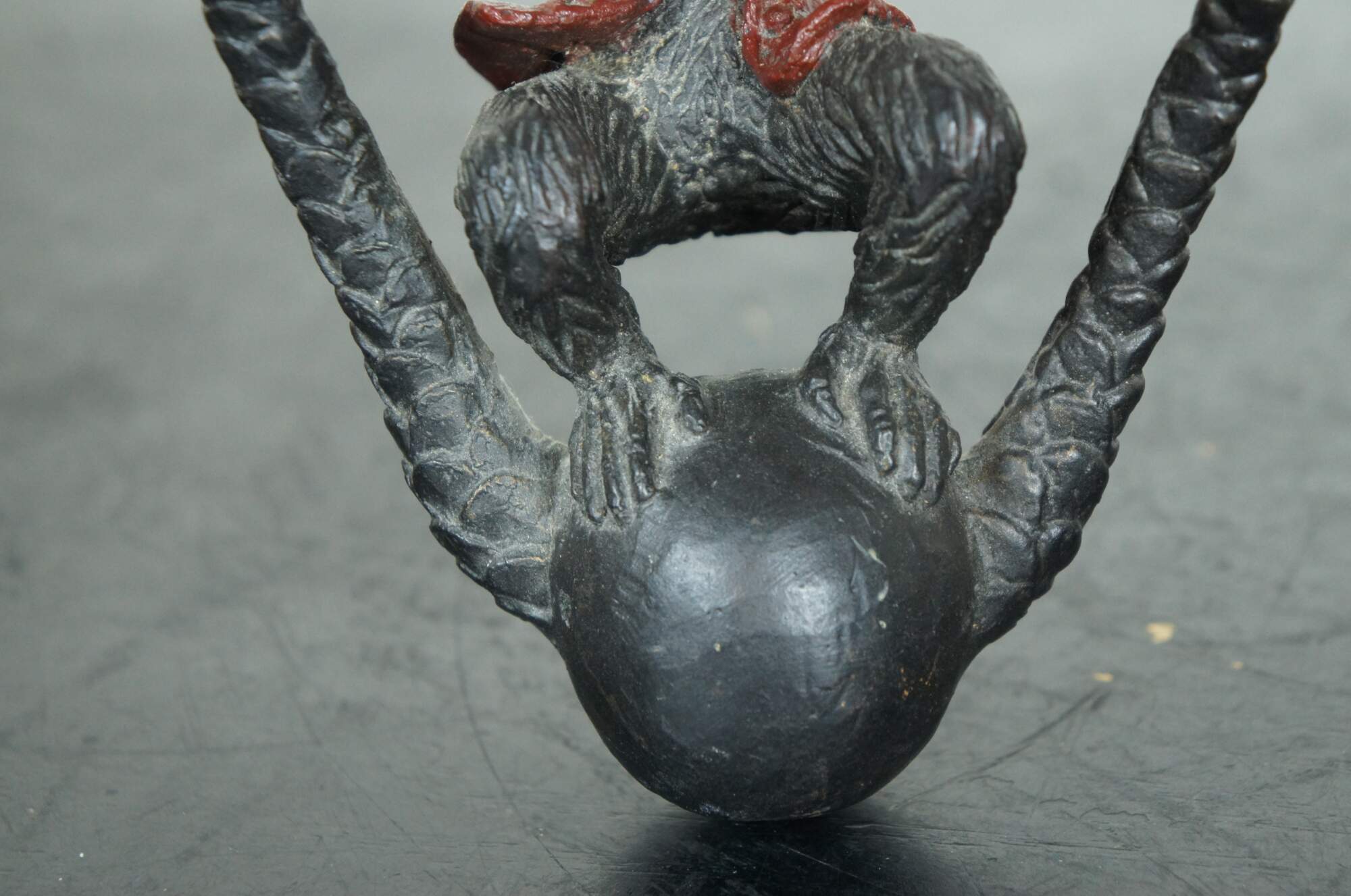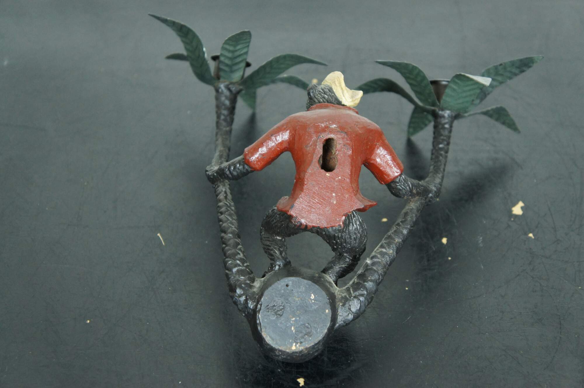 Vintage cast metal wall hanging sconce, featuring a monkey wearing a red jacket and yellow hat, perched on a ball between a pair of palm trees, the tops of which hold a single taper candle.