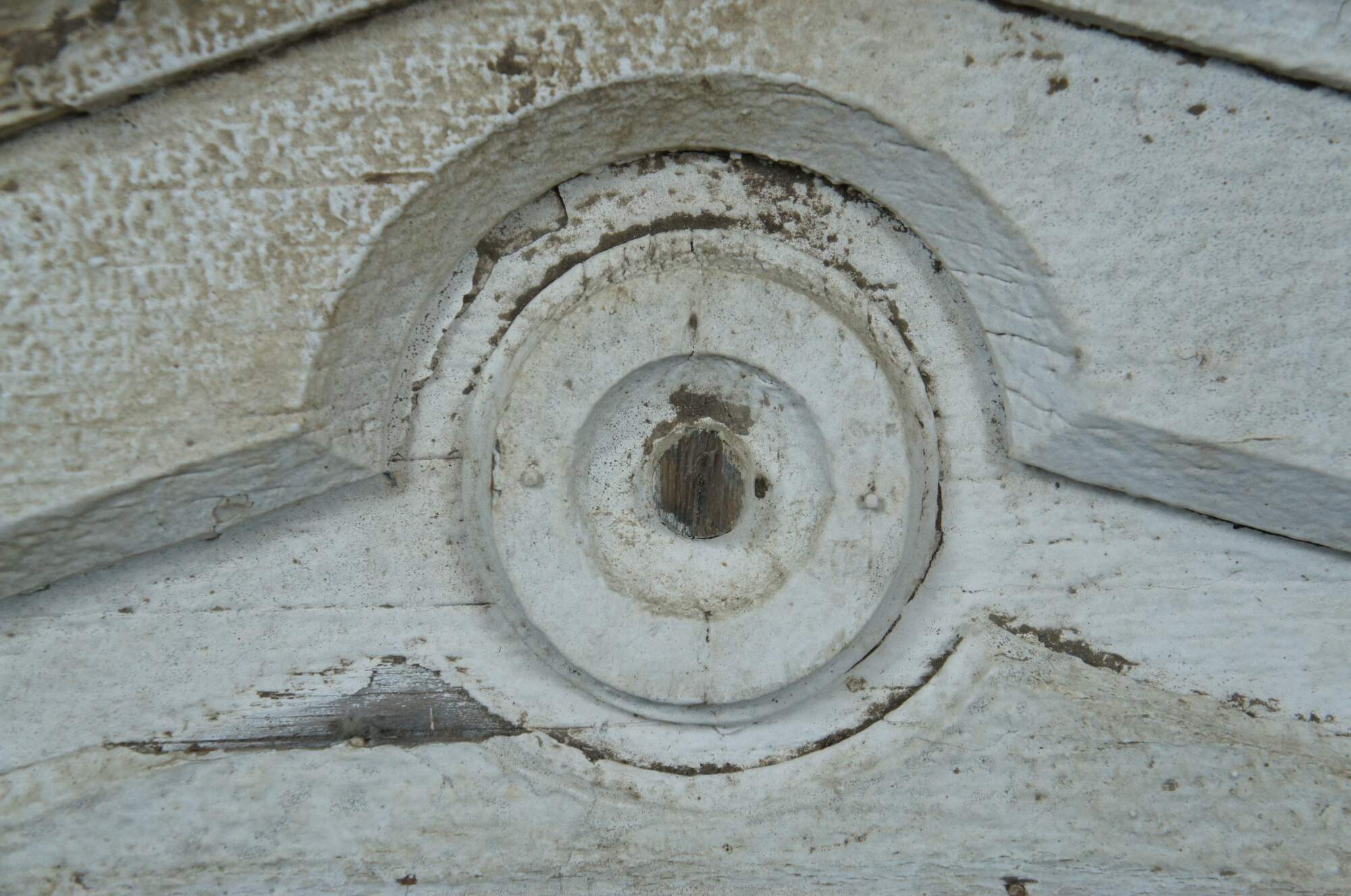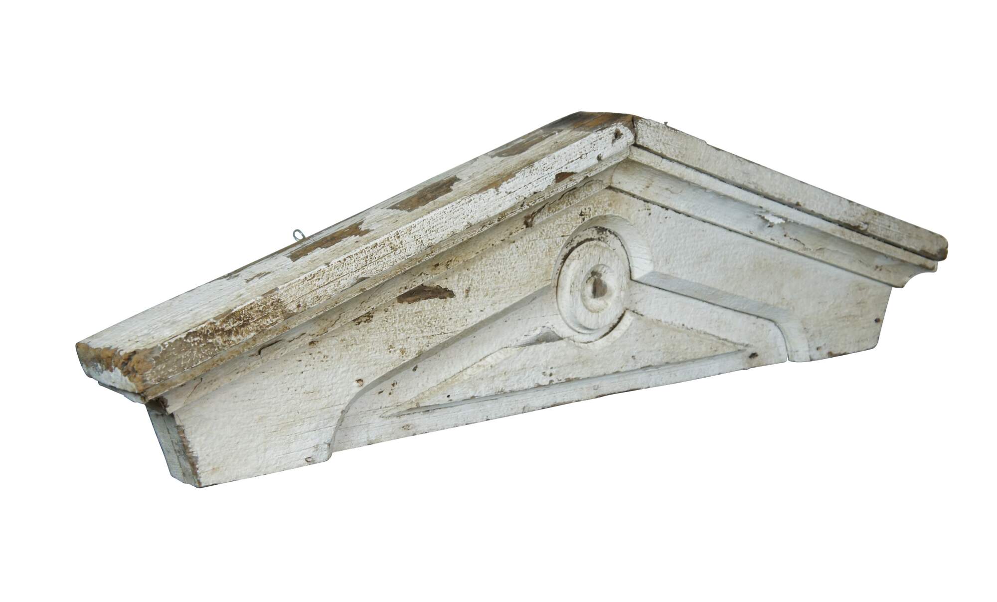 Antique Victorian architectural salavaged wooden farmhouse window or door pediment, lintel or header. Painted white; simple peaked design with beveled bulls eye detail. Fitting with two hooks for wall display.