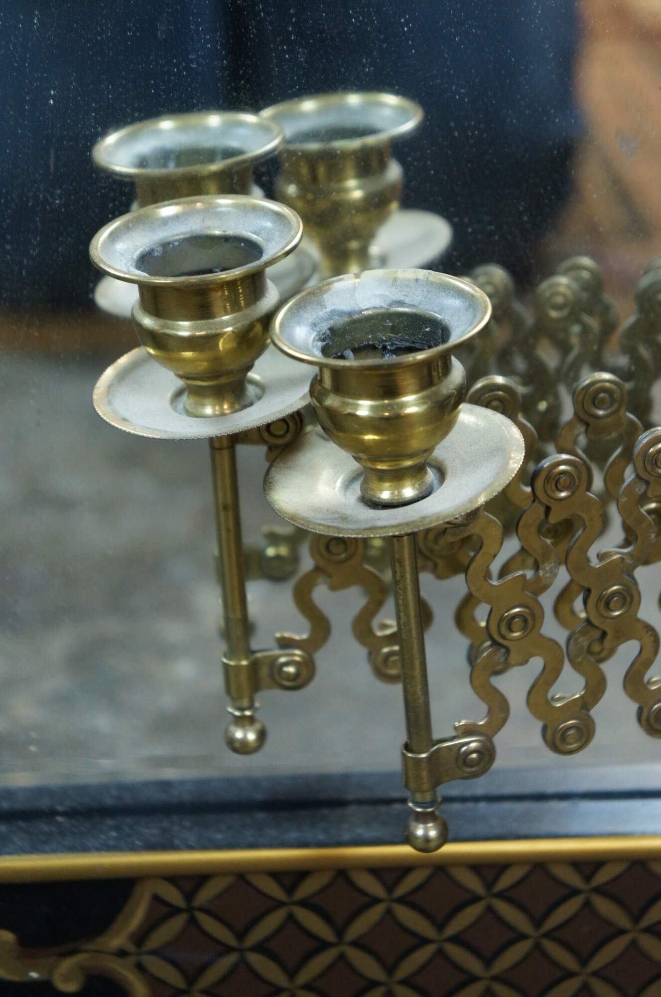 Mid century circa 1963 over mantel wall vanity mirror by Drexel Heritage (Et Cetera Collection). Features a rectangular form with faux baboo edge, painted in black and gold with a Chinoiserie floral and fruit design with lattic corners. Each side is mounted with a pair of swing arm articulating accordion single-taper candlesticks. Beveled glass. Back marked 63 43-215. Drexel Heritage Furnishings Inc - 104035 - Merlene Yates -Inspector, Plant 33.