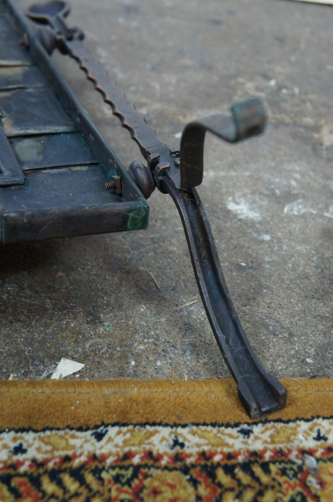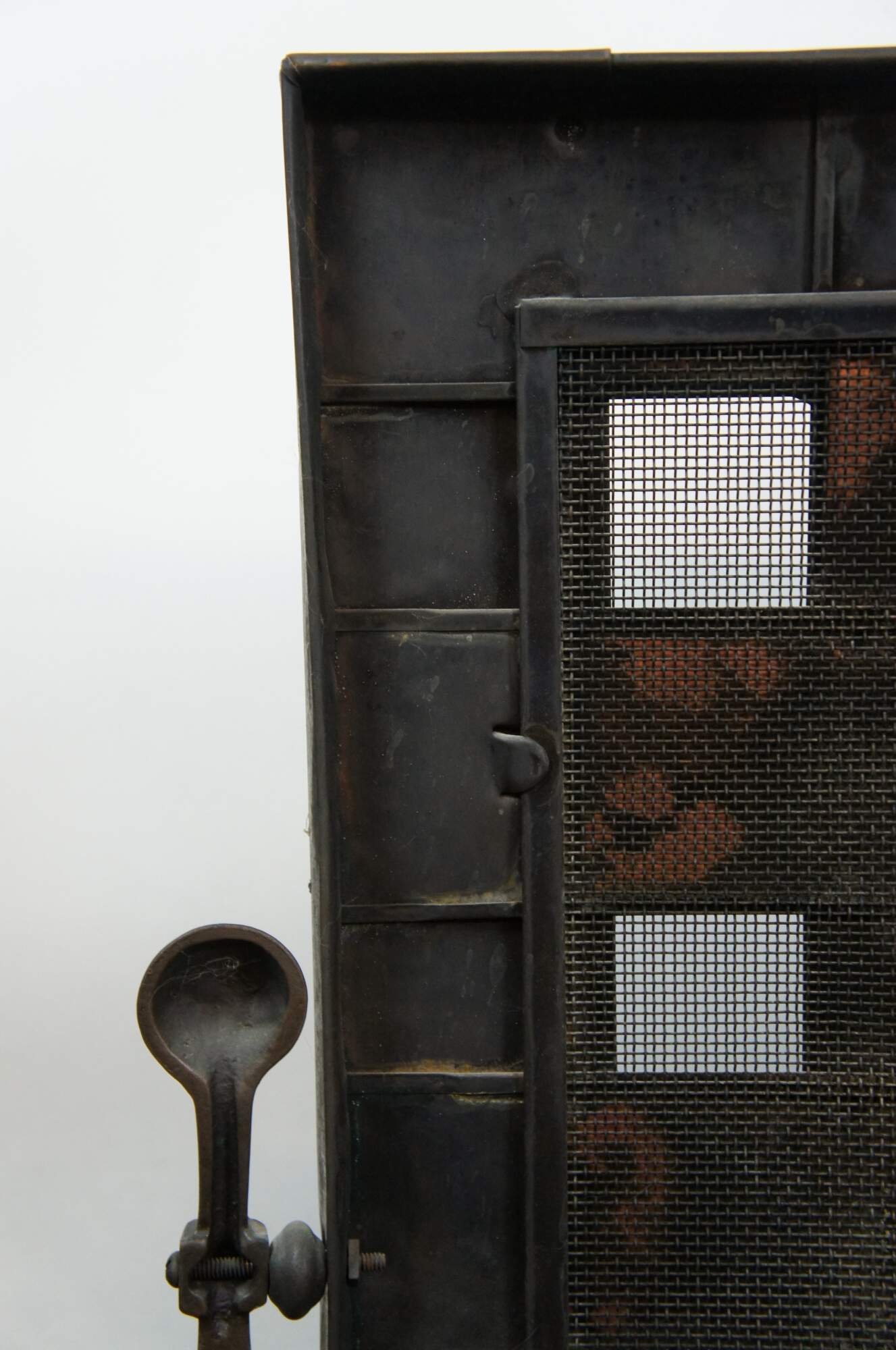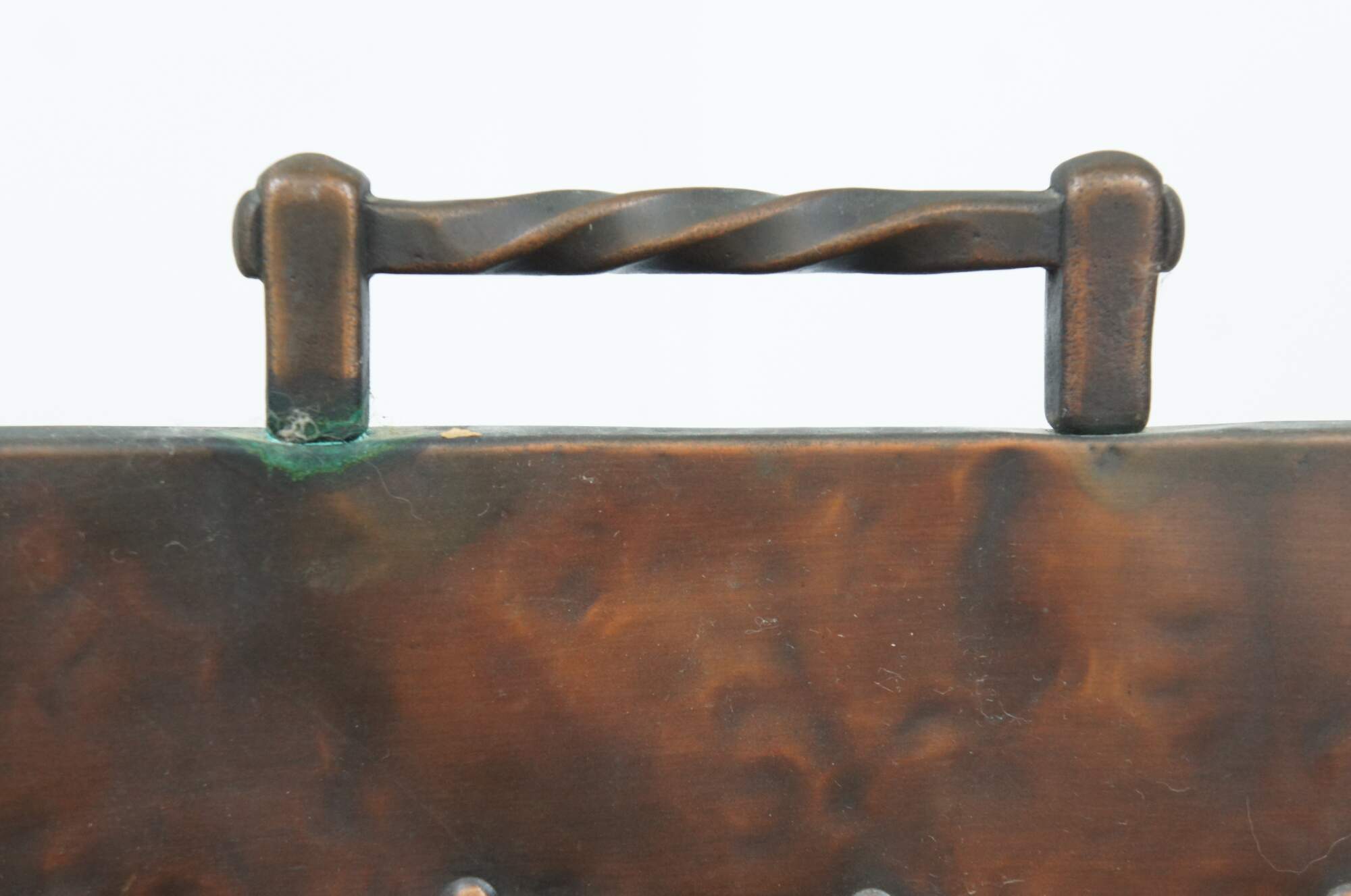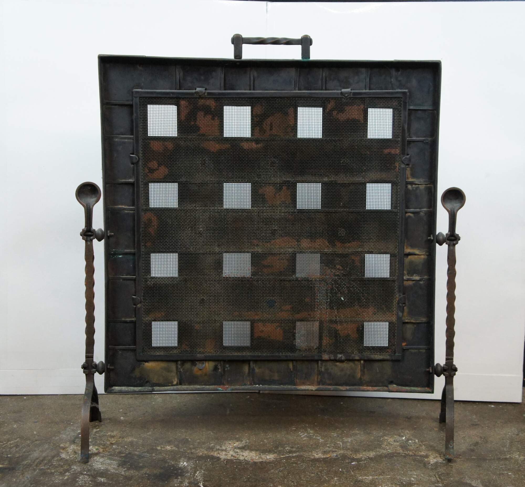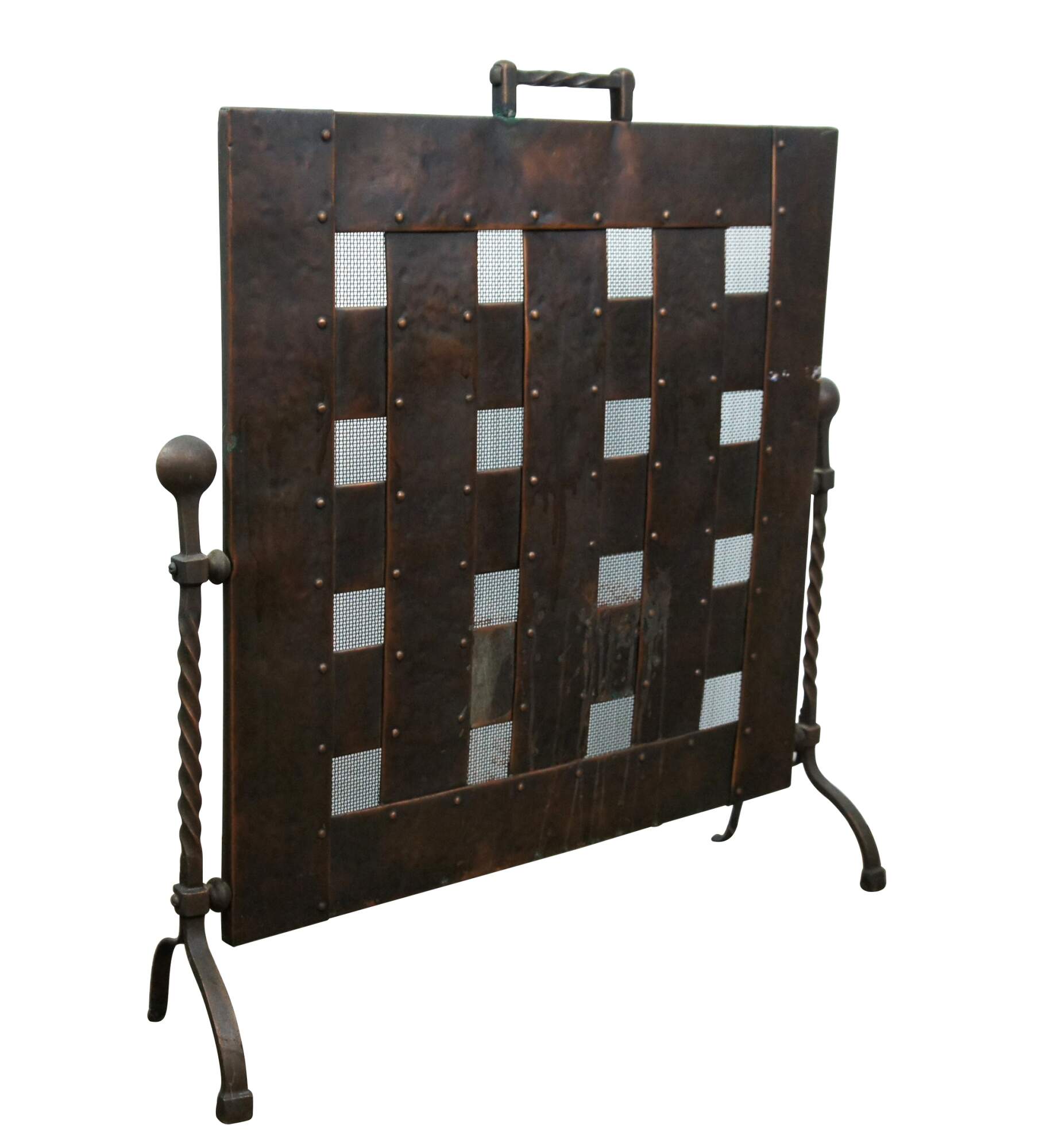 20th century Gothic / medieval style wrought iron and copper fireplace screen featuring twisted iron side supports with ball top and bow legs, flanking a studded lattice panel with nailhead trim and a dark / aged copper, hammered texture and twisted handle at the top. Back lined with metal mesh.