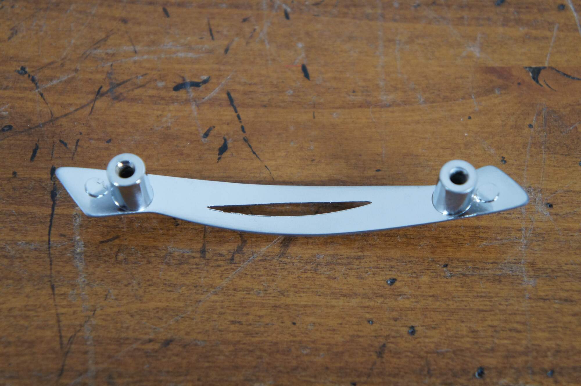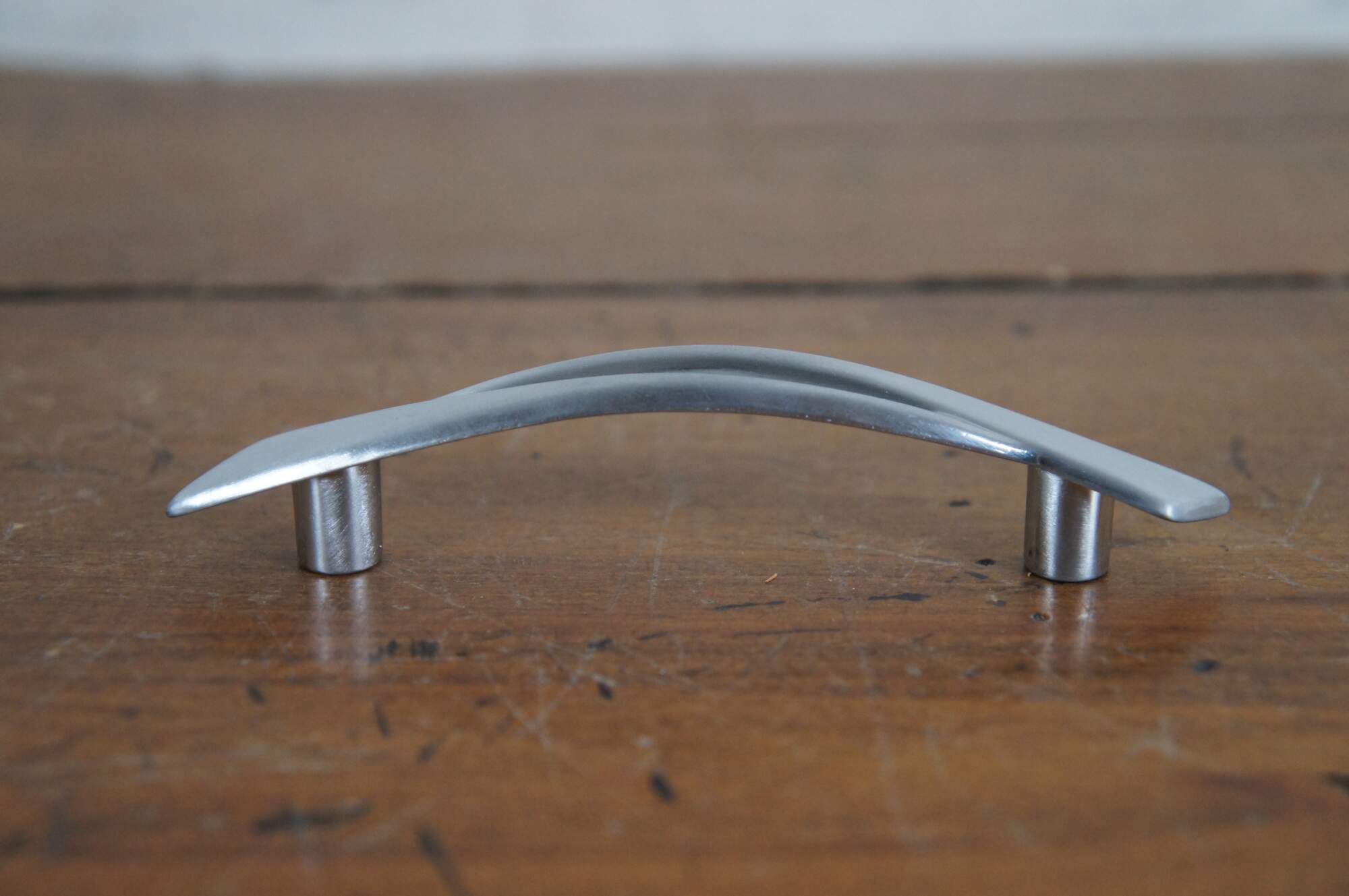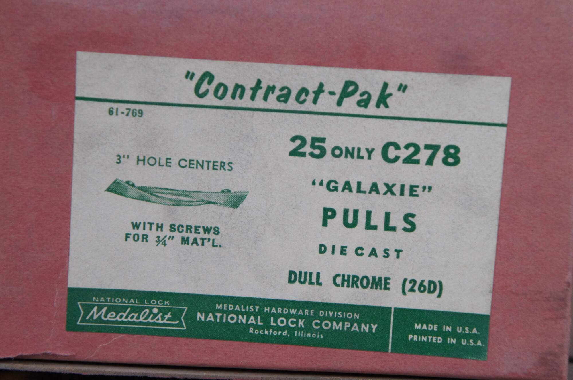48 Available - Mid to late 20th century old-stock die cast drawer / cabinet pulls. National Lock Company - Medalist, item number C278 "Galaxie" Pulls, Dull Chrome (26D). 3" Hole Centers. Mid Century Modern styling.