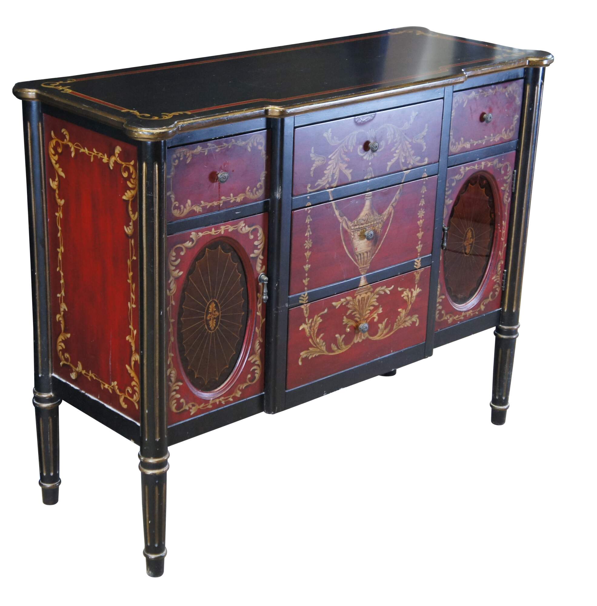 Vintage Italian Neoclassical / Napoleon revival style commode, chest or cabinet featuring black and red painted motif with central trophy urn surrounded by acanthus designs.