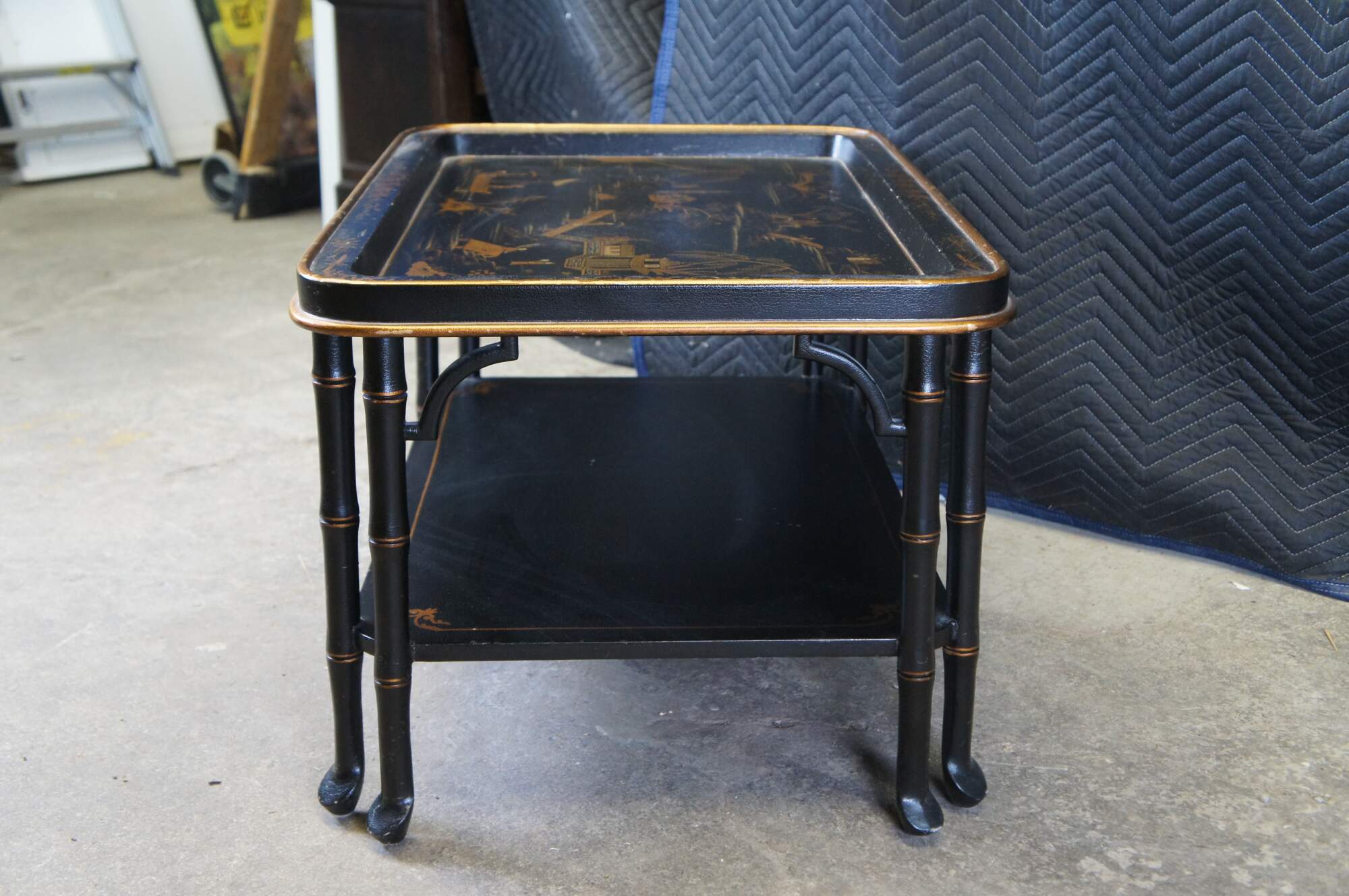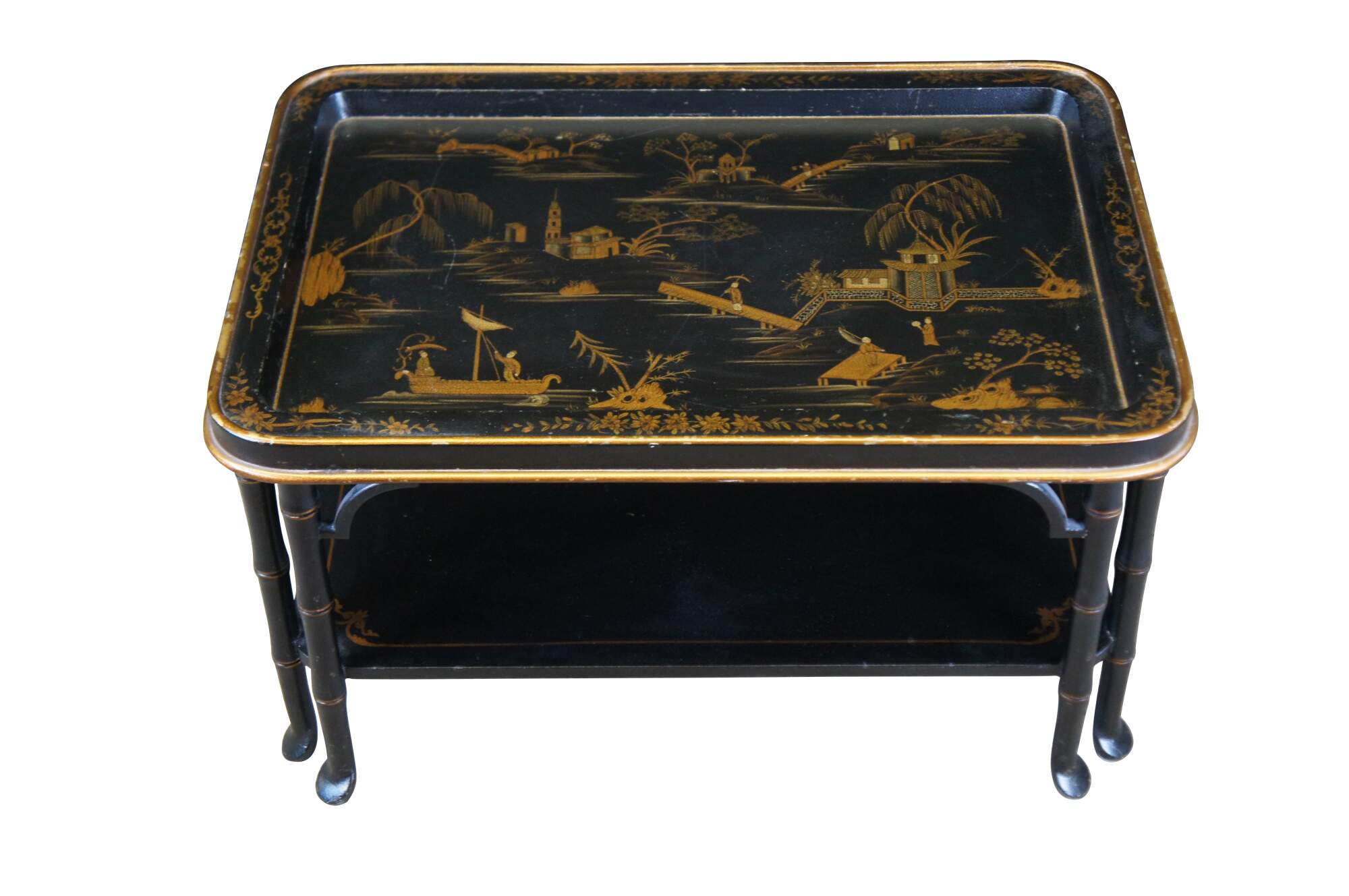 Vintage Chinoiserie black lacquer coffee or cocktail table featuring a nautical Chinese theme of Pagodas, fishing boats, Cherry Blossoms, bridges, Willow trees and figures.