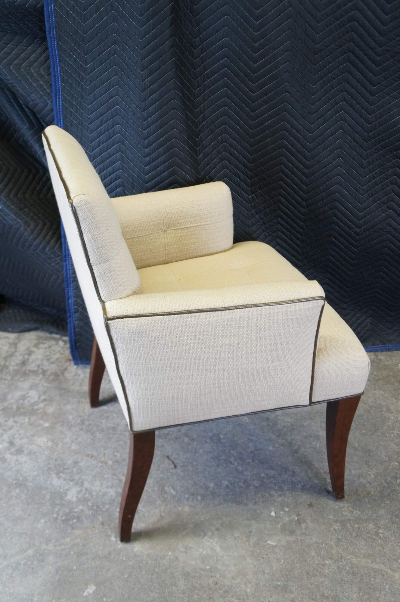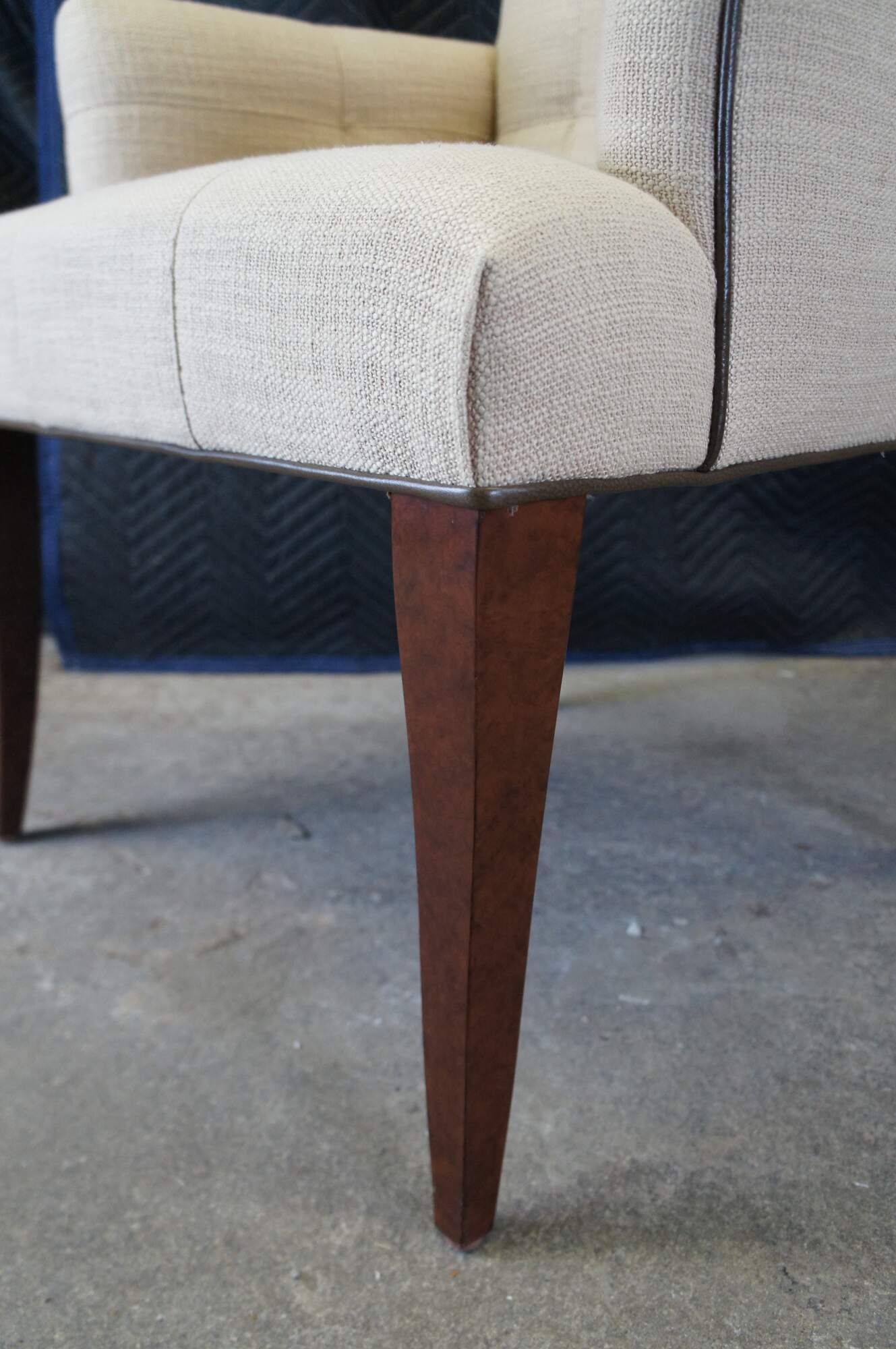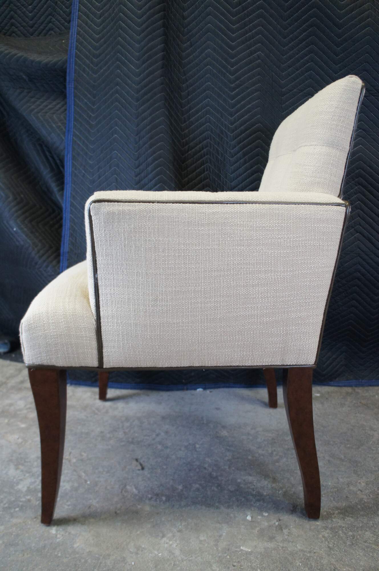 Set of four vintage Jessica Charles for Hickory Chair Co Mann half arm dining chairs featuring a slightly faired form with tufted upholstery, half arms and tapered legs.