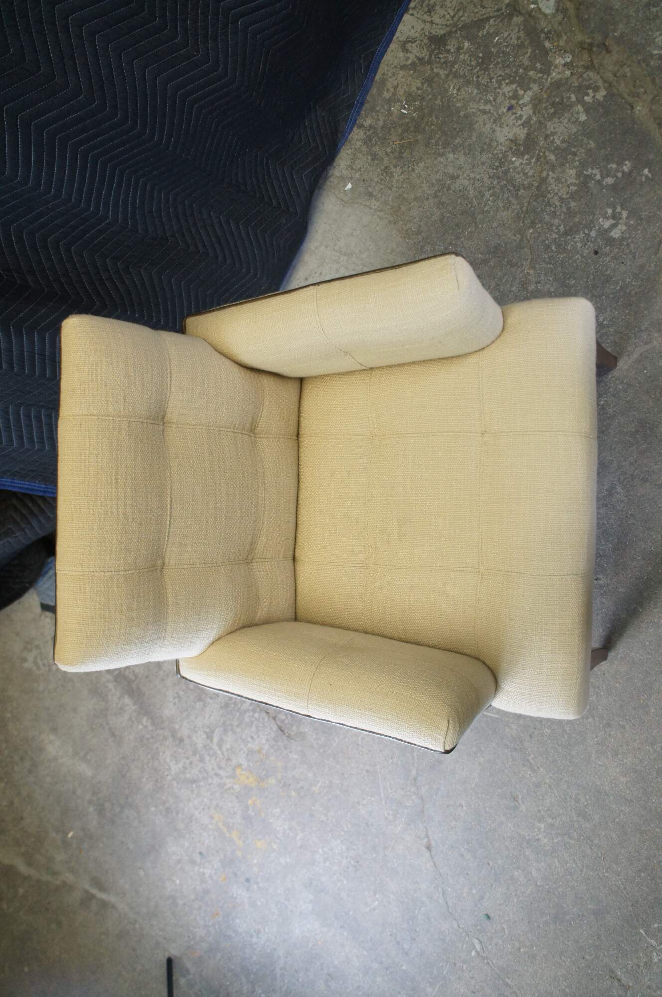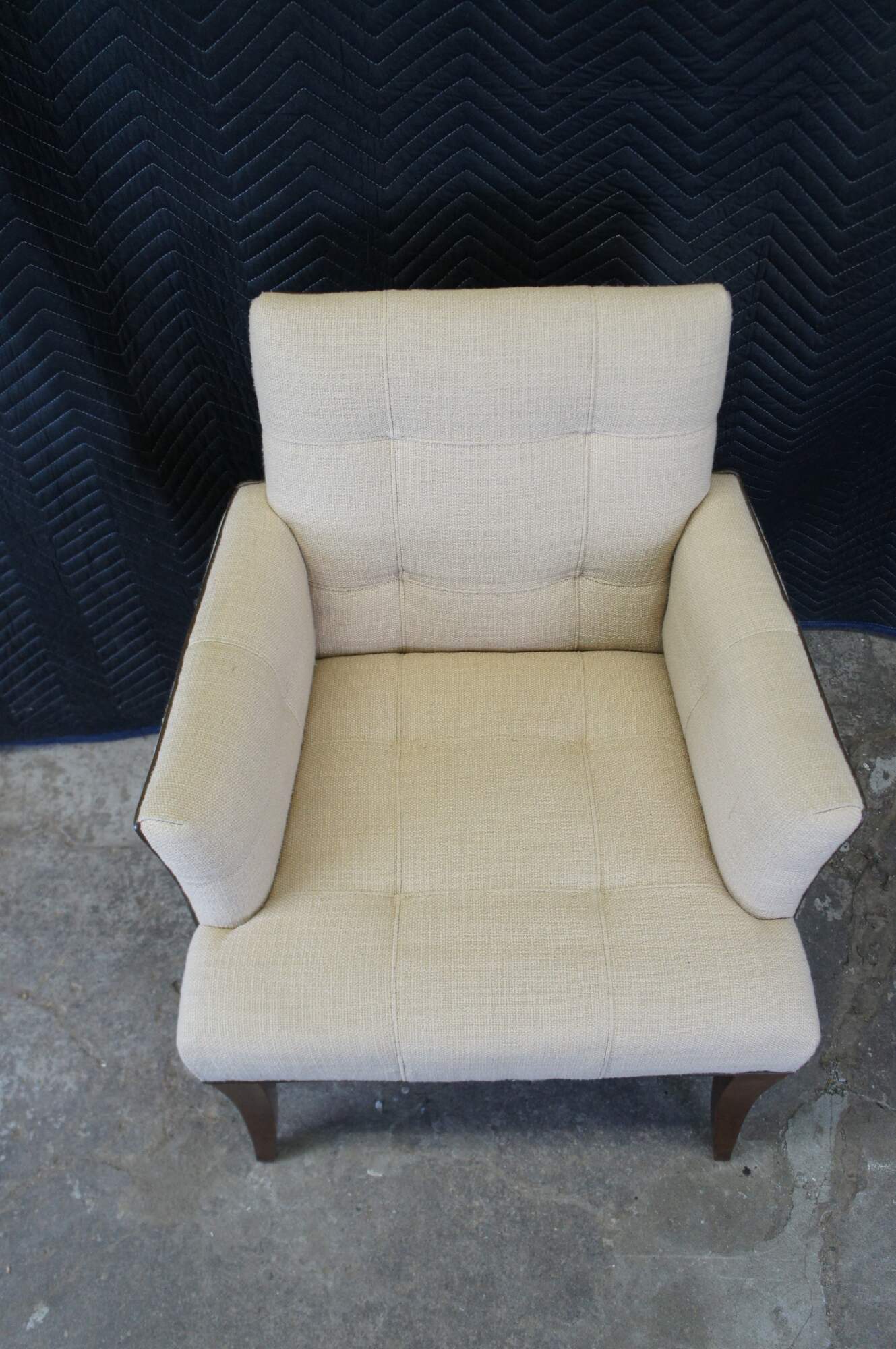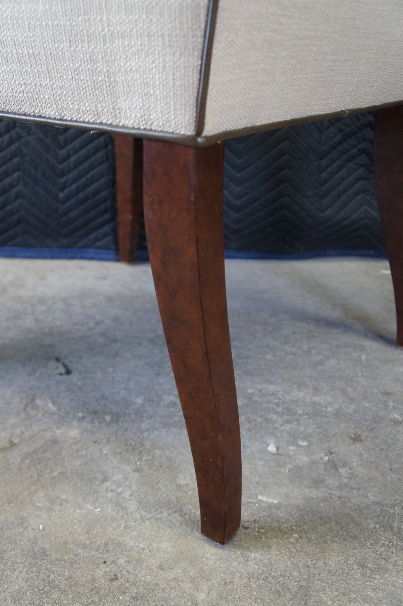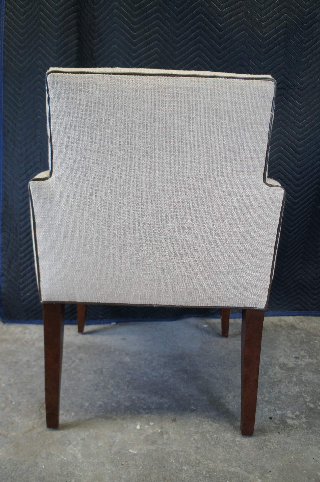 Set of four vintage Jessica Charles for Hickory Chair Co Mann half arm dining chairs featuring a slightly faired form with tufted upholstery, half arms and tapered legs.