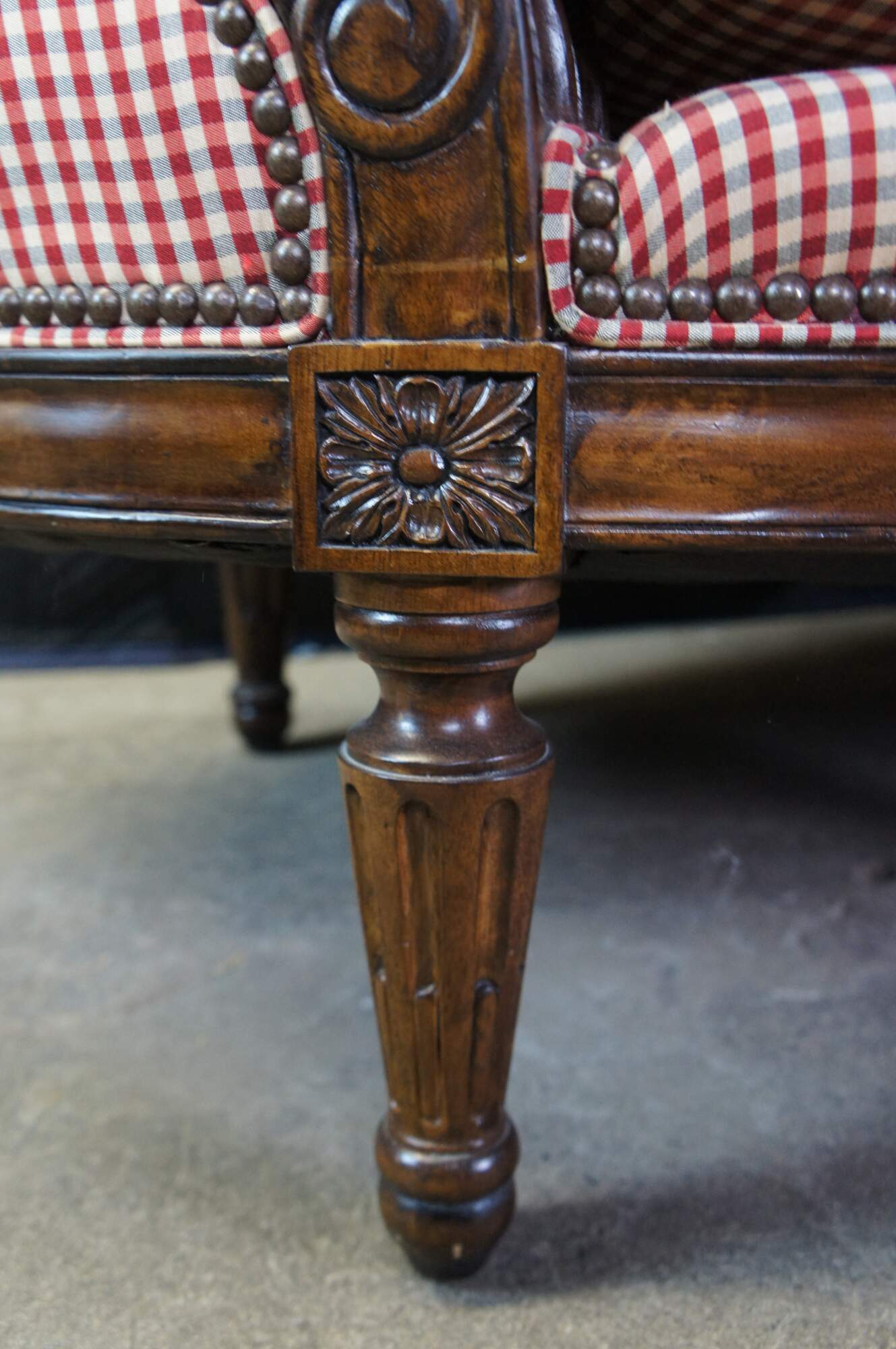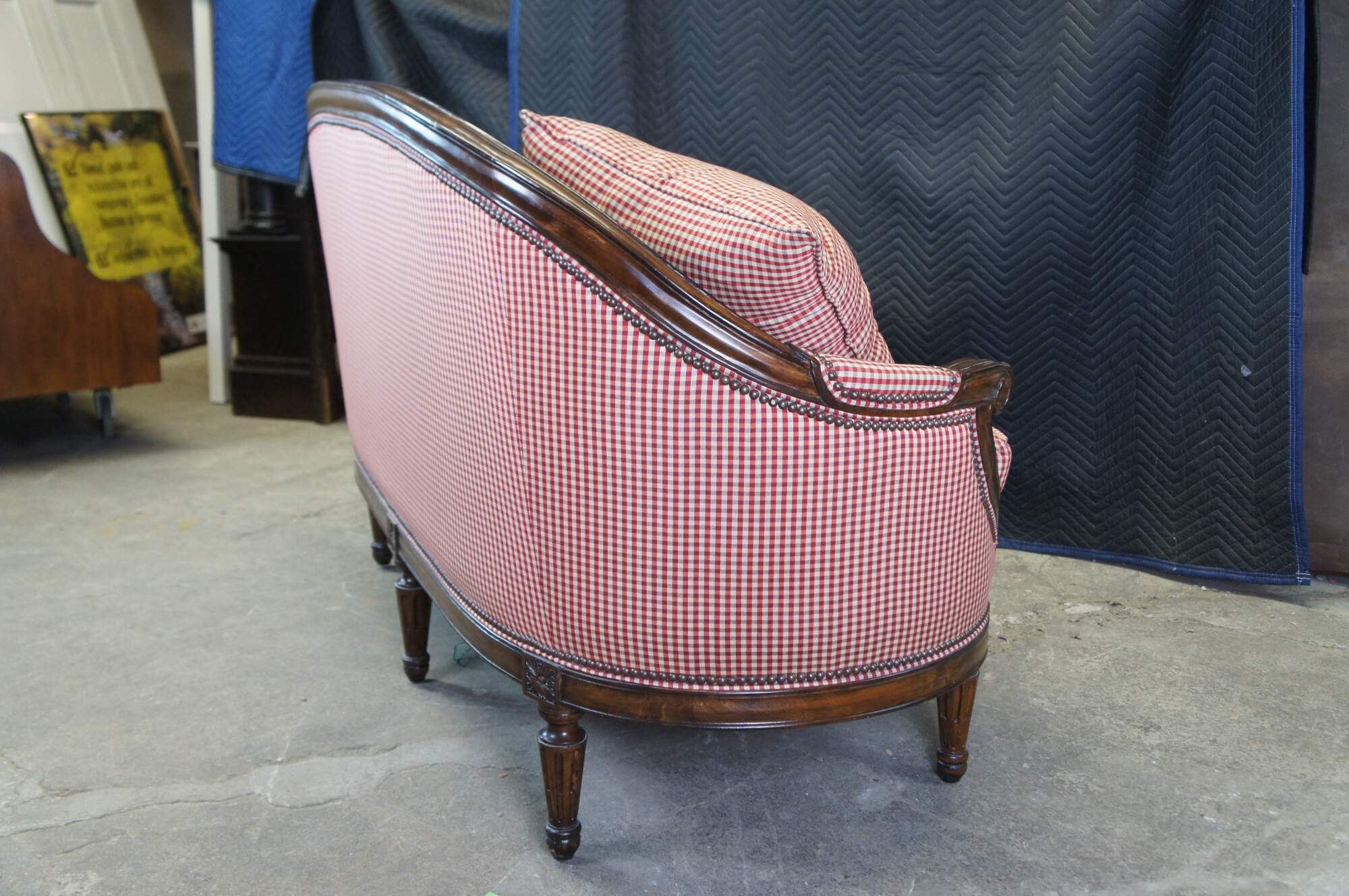 Vintage Hickory Chair company Park Avenue parlor settee / love seat / bench. Made of mahogany featuring round form with padded arm, red plaid upholstery, nailhead trim, floral carved accents and tapered fluted legs.