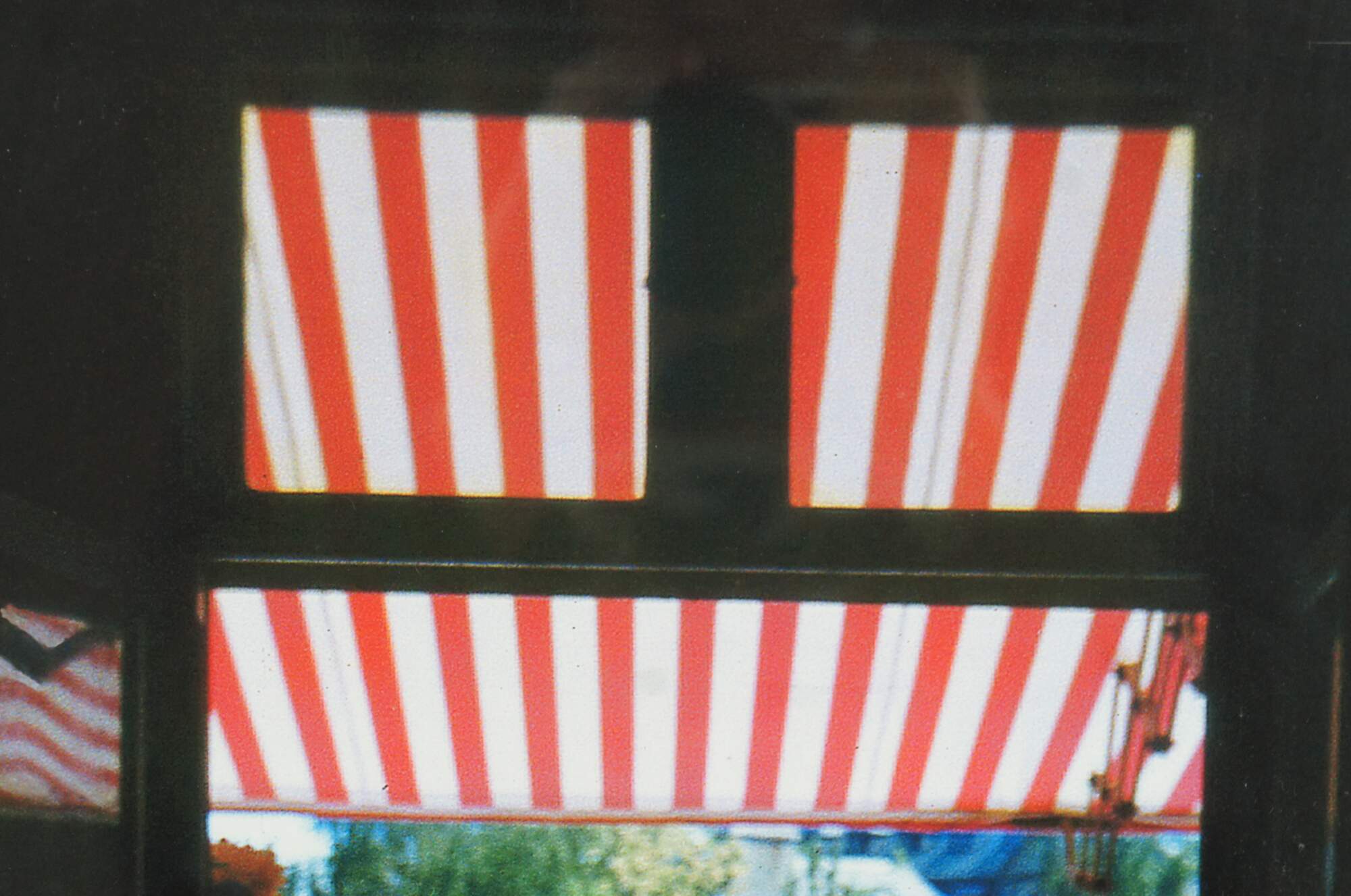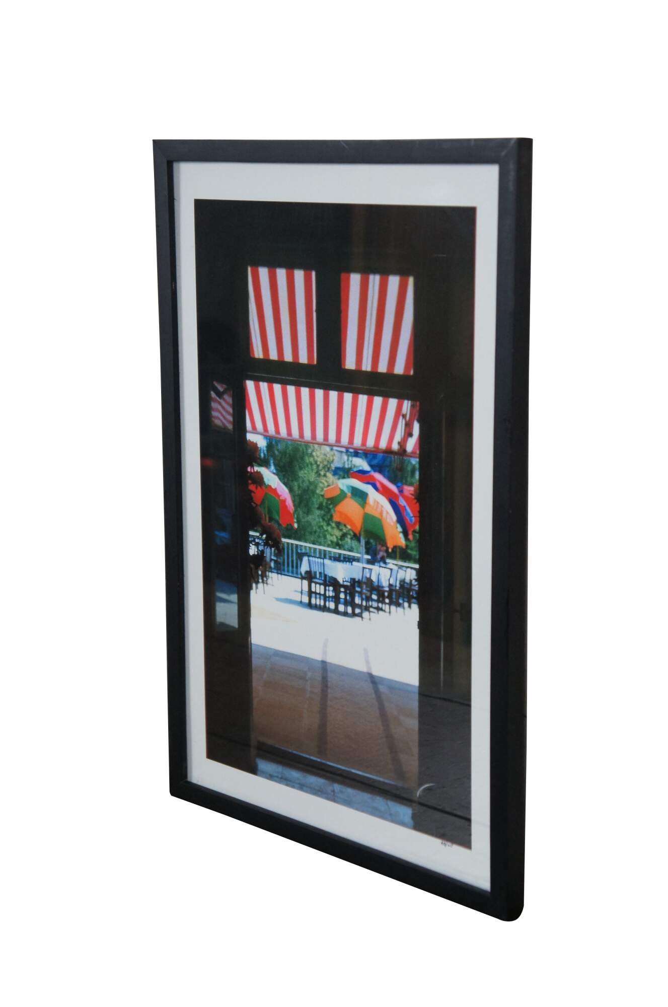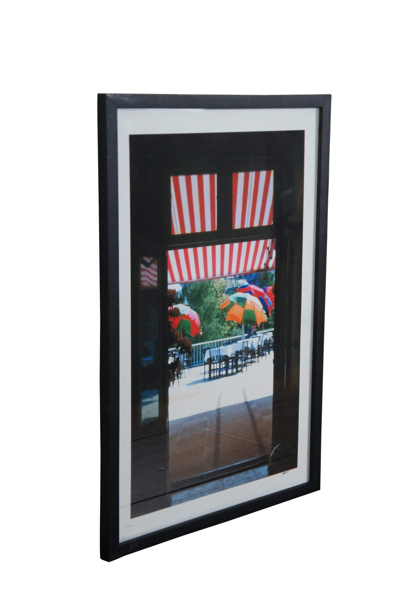 Late 20th century color photograhic art print, showing a view shot a doorway of a sunny pool patio in the summertime with tables, chairs, bright umbrellas under a red and white striped awning. Signed RD/WJ in lower right corner. Black painted frame. Attributed to Dayton Country Club.