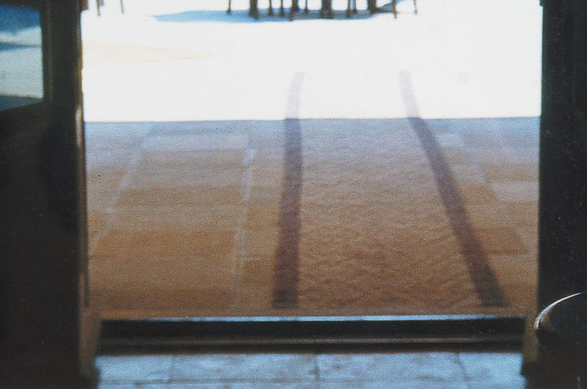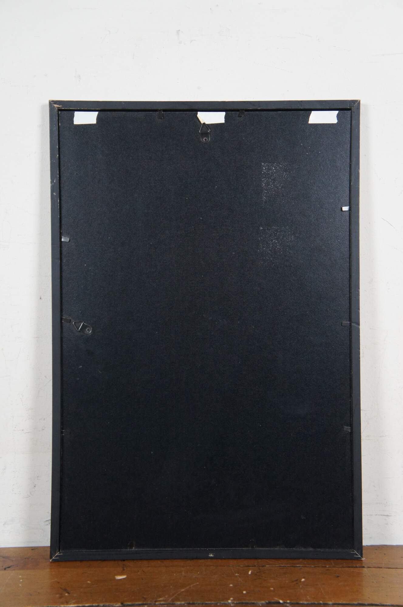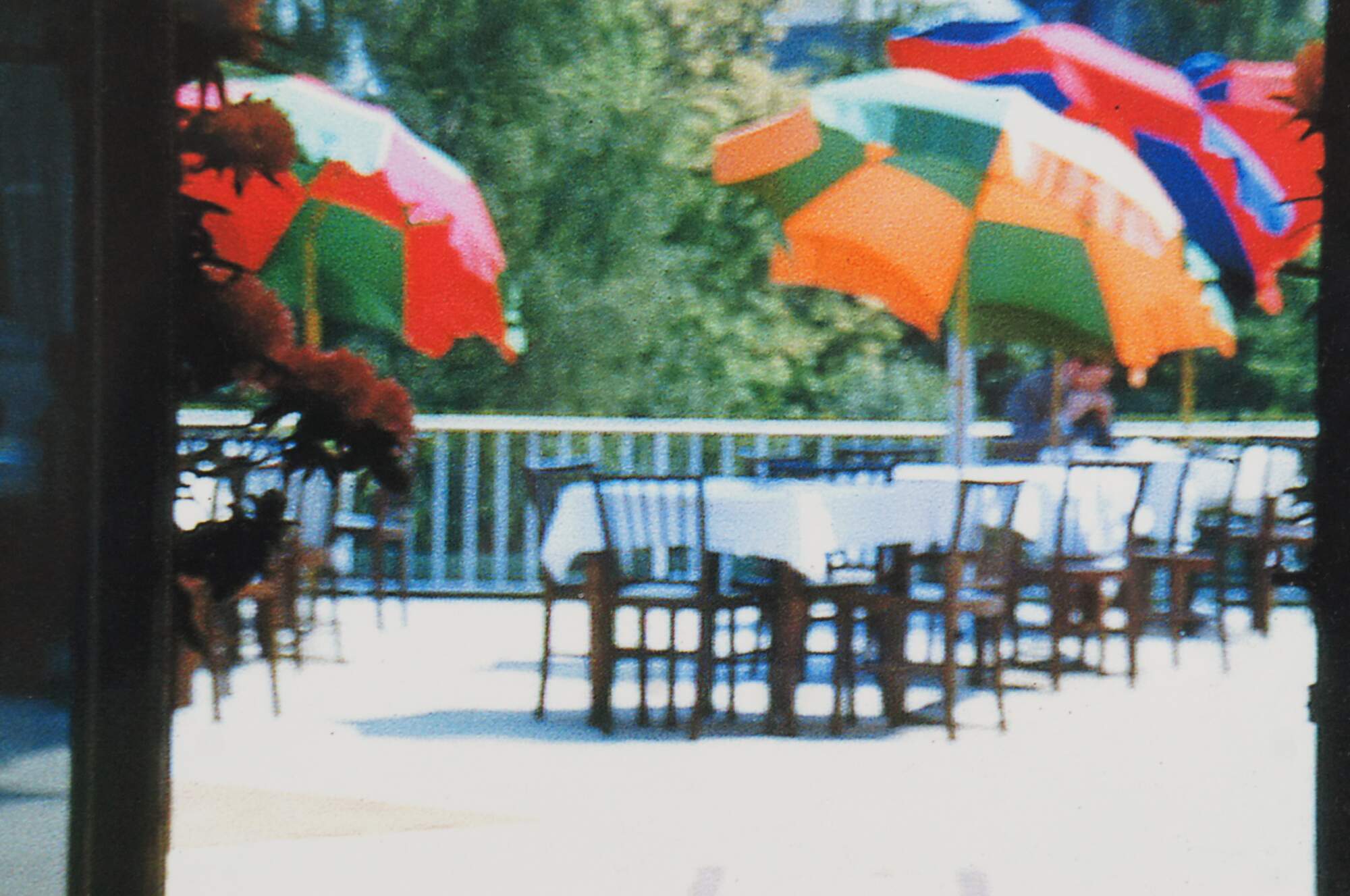 Late 20th century color photograhic art print, showing a view shot a doorway of a sunny pool patio in the summertime with tables, chairs, bright umbrellas under a red and white striped awning. Signed RD/WJ in lower right corner. Black painted frame. Attributed to Dayton Country Club.