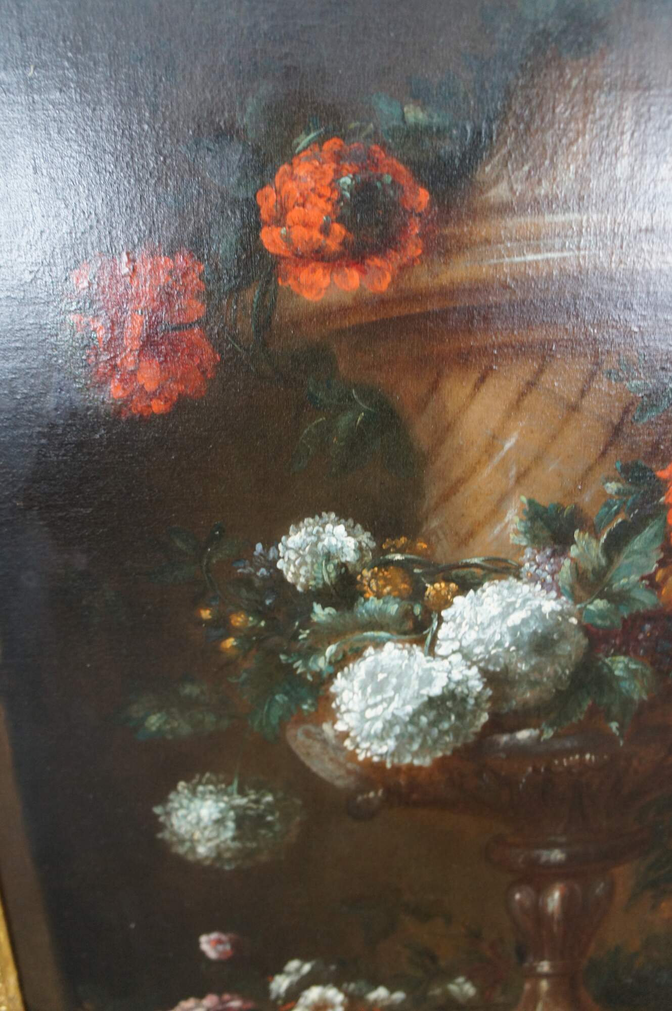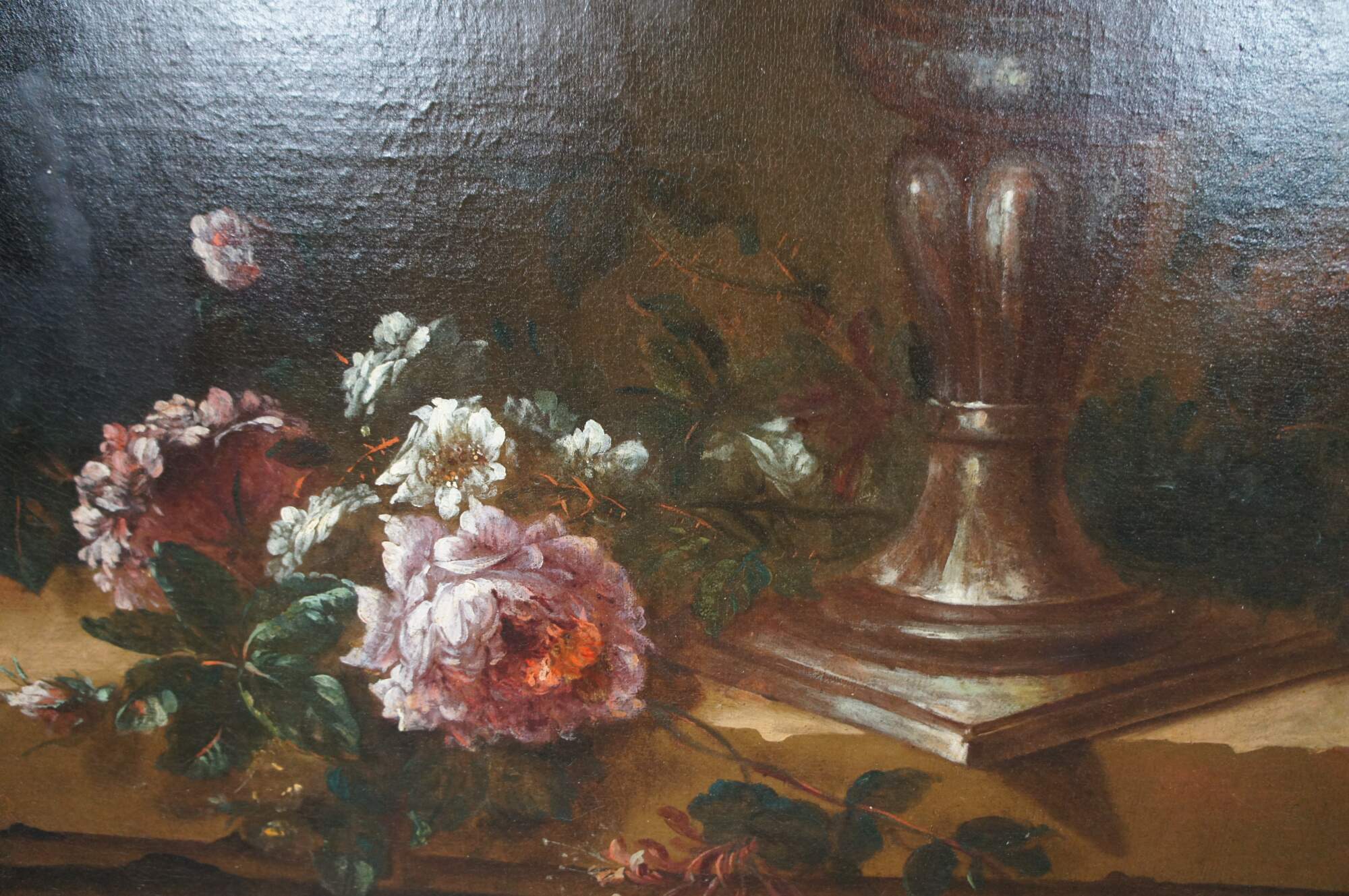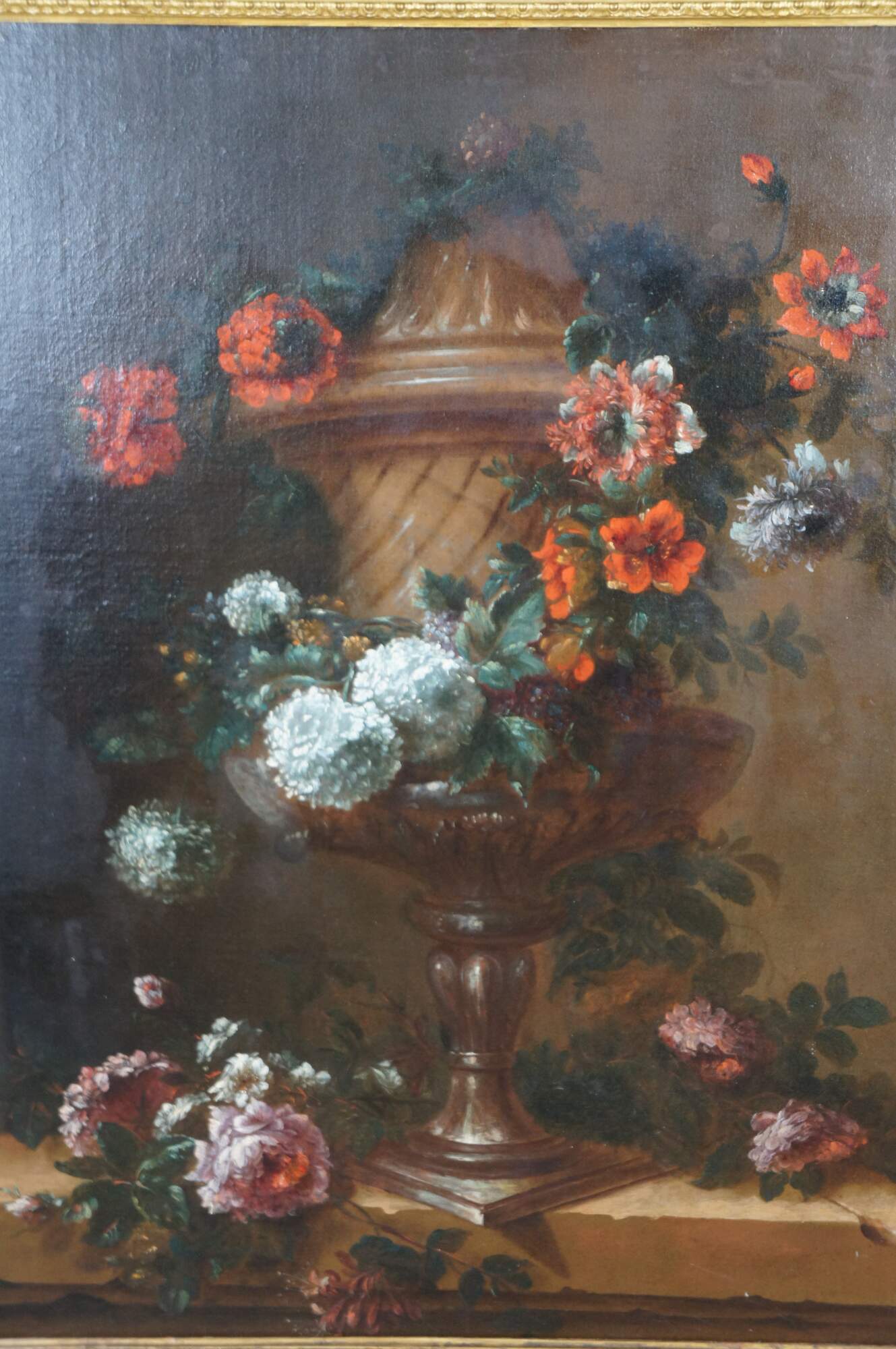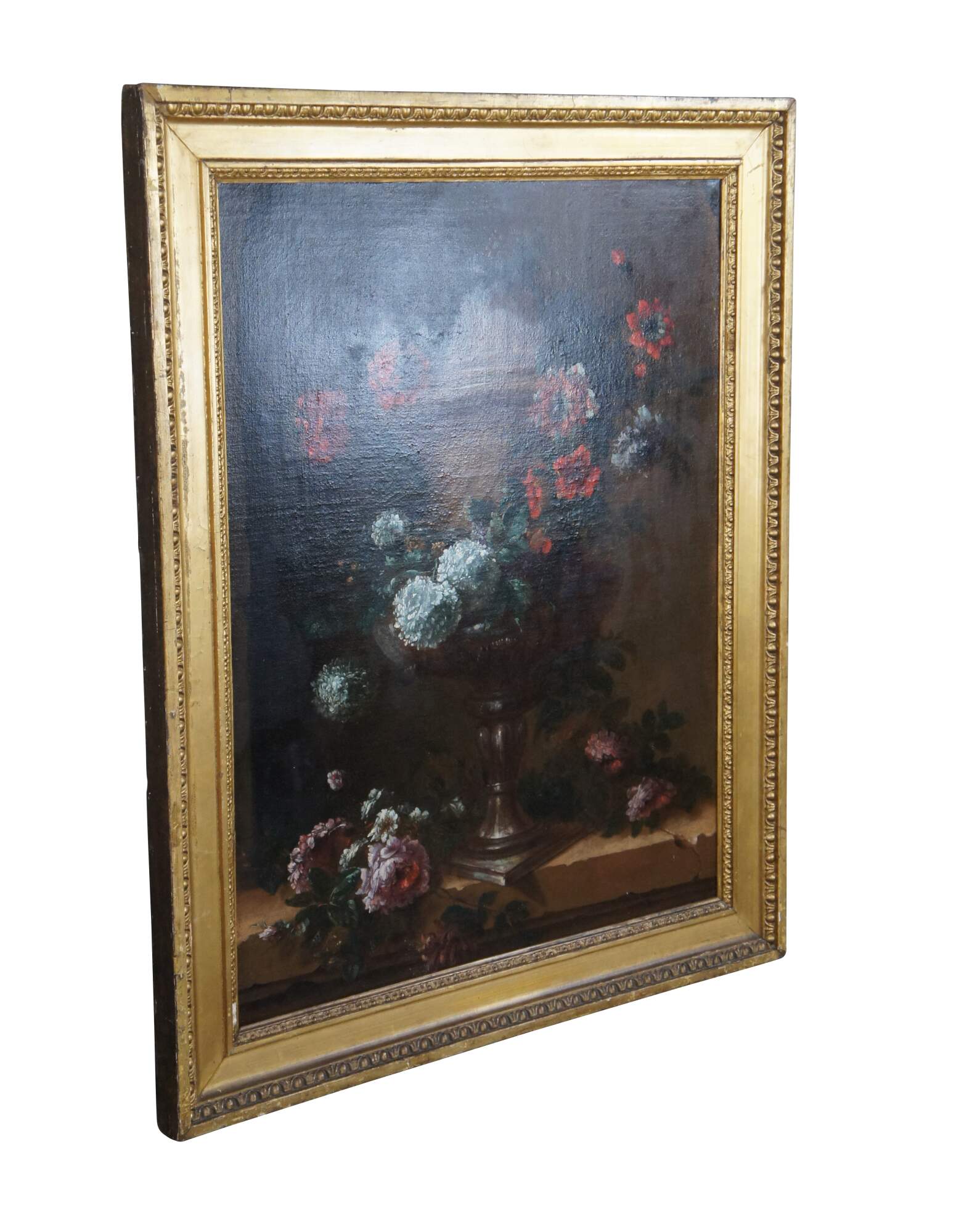 A large antique 19th Century still life featuring a Garland of Flowers surrounding a Grecian Vase. The piece is styled in the manner of a painting by Jean Baptiste Belin de Fontenay, aptly titled Vase Surrounded by a Garland of Flowers. The painting is on vanvas and framed in wood with a gold finish showcasing an egg and dart molding. The painting is unsigned.