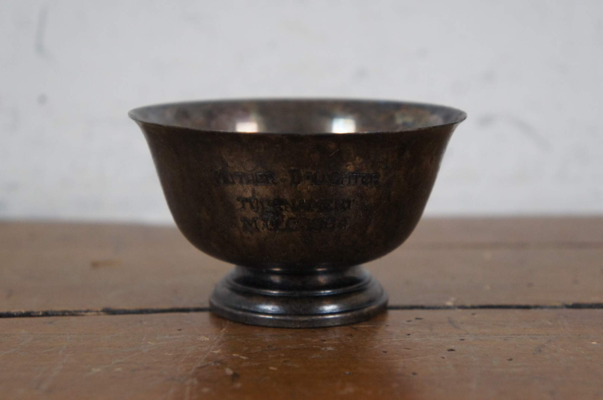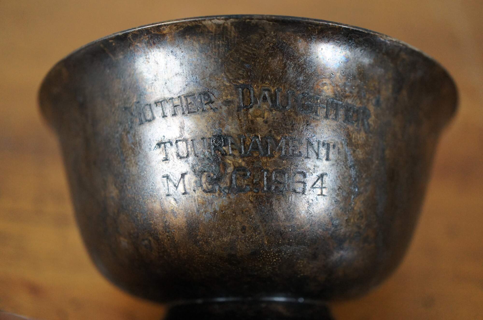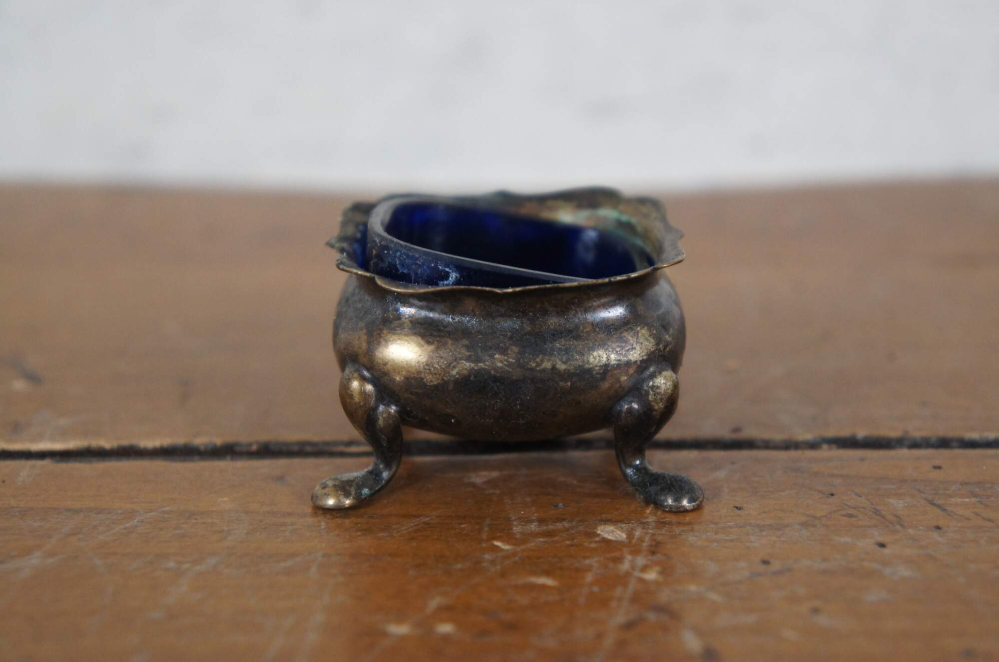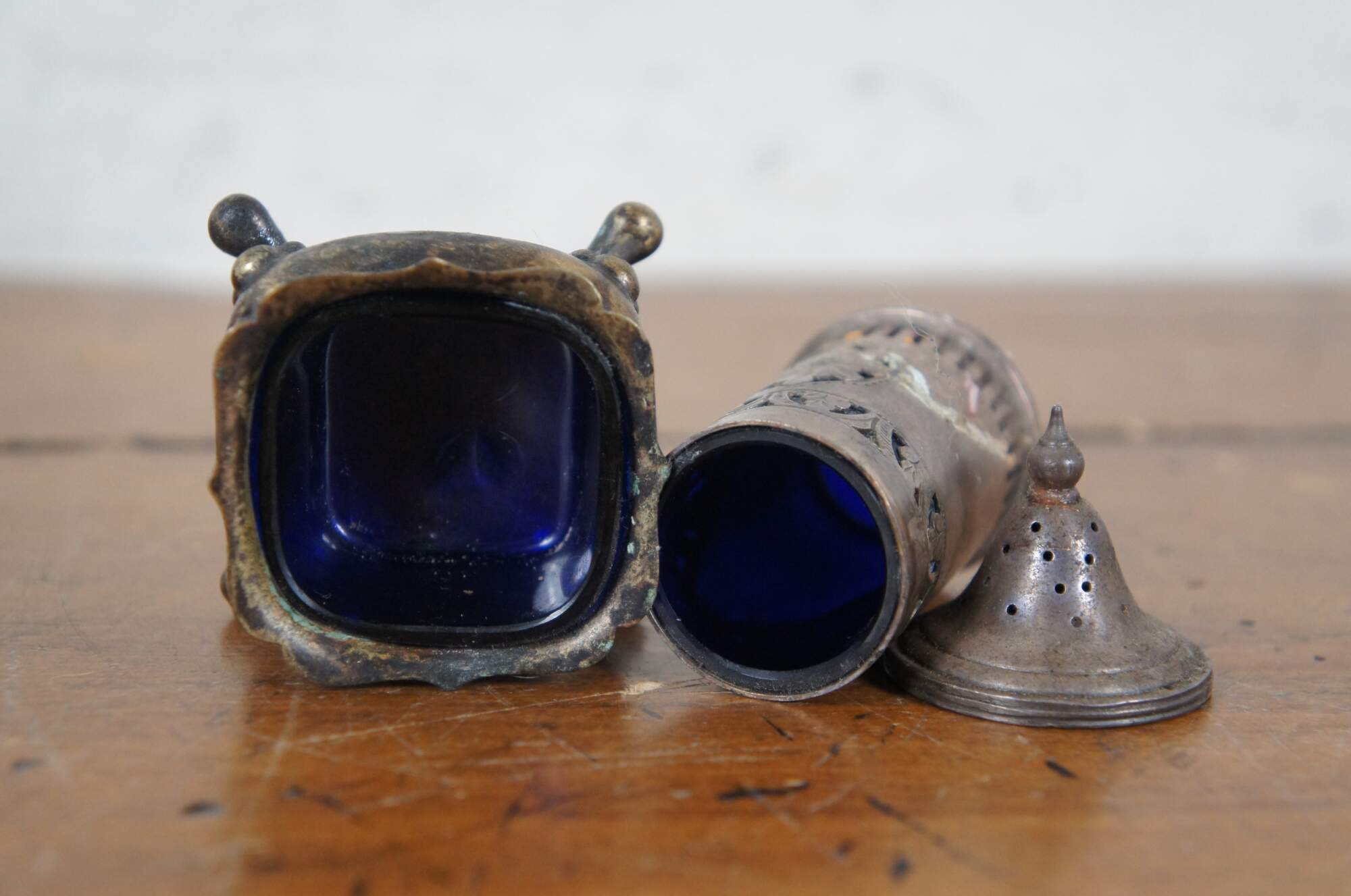 Mid to late 20th century lot of 11 assorted silverplate piece including six small salt shakers / pepper pots, one cobalt glass lined shaker, one medium candy dish, one small candy dish (engraved "Mother-Daughter Tournament Moraine Country Club Dayton Ohio MCC 1964), one cobalt glass lined salt cellar, and one spoon rest. Made in England / Reed & Barton / The Sheffield Silver Co / Cheltenham & Co.