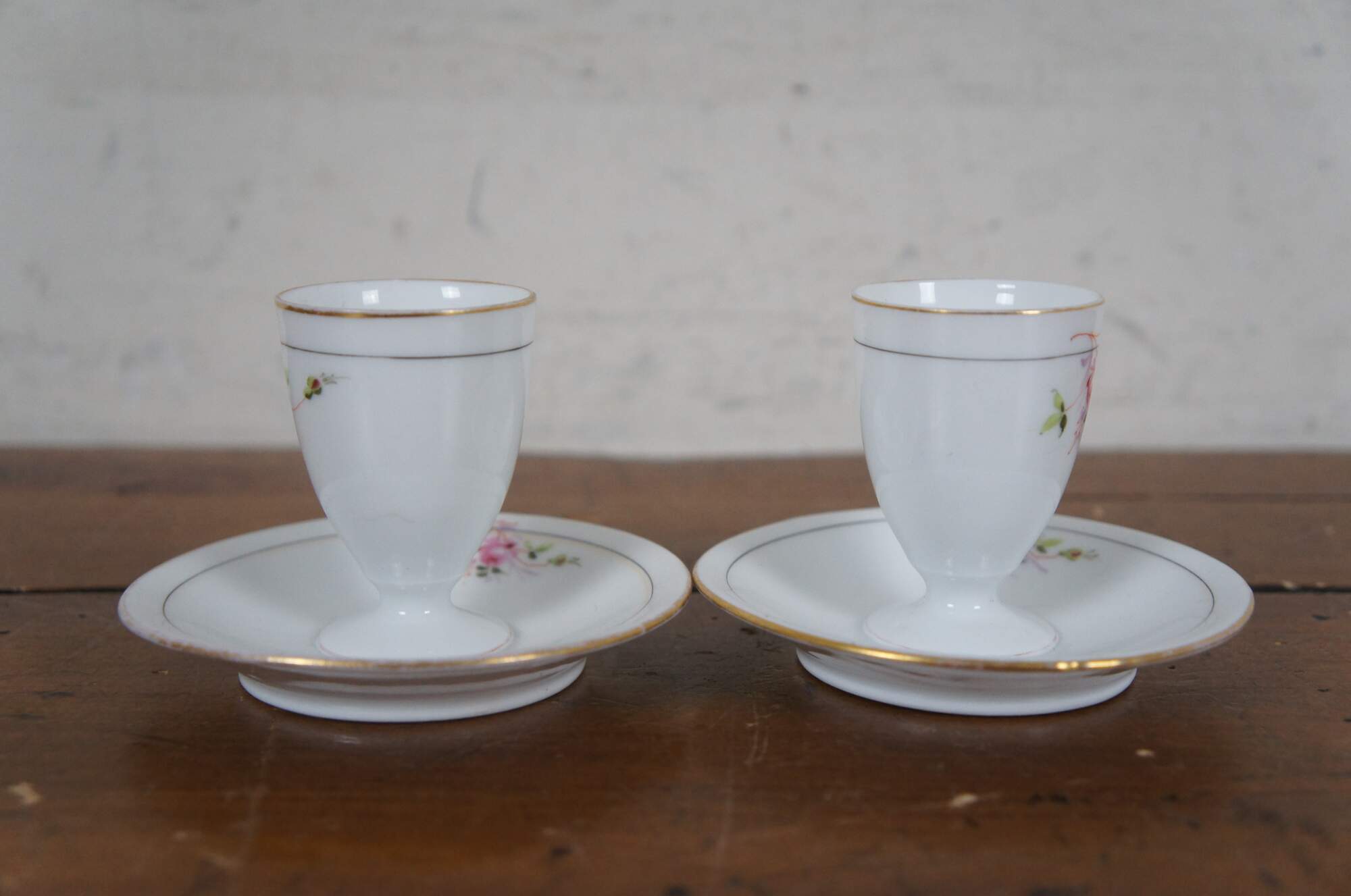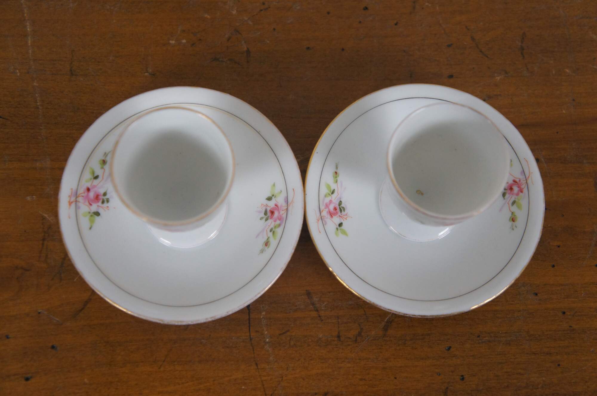 Pair of Fischer & Mieg / Pirkenhammer porcelain egg cups with attached underplate, hand painted with sprigs of pink roses and gilded accents. Mark used circa 1853-1873.