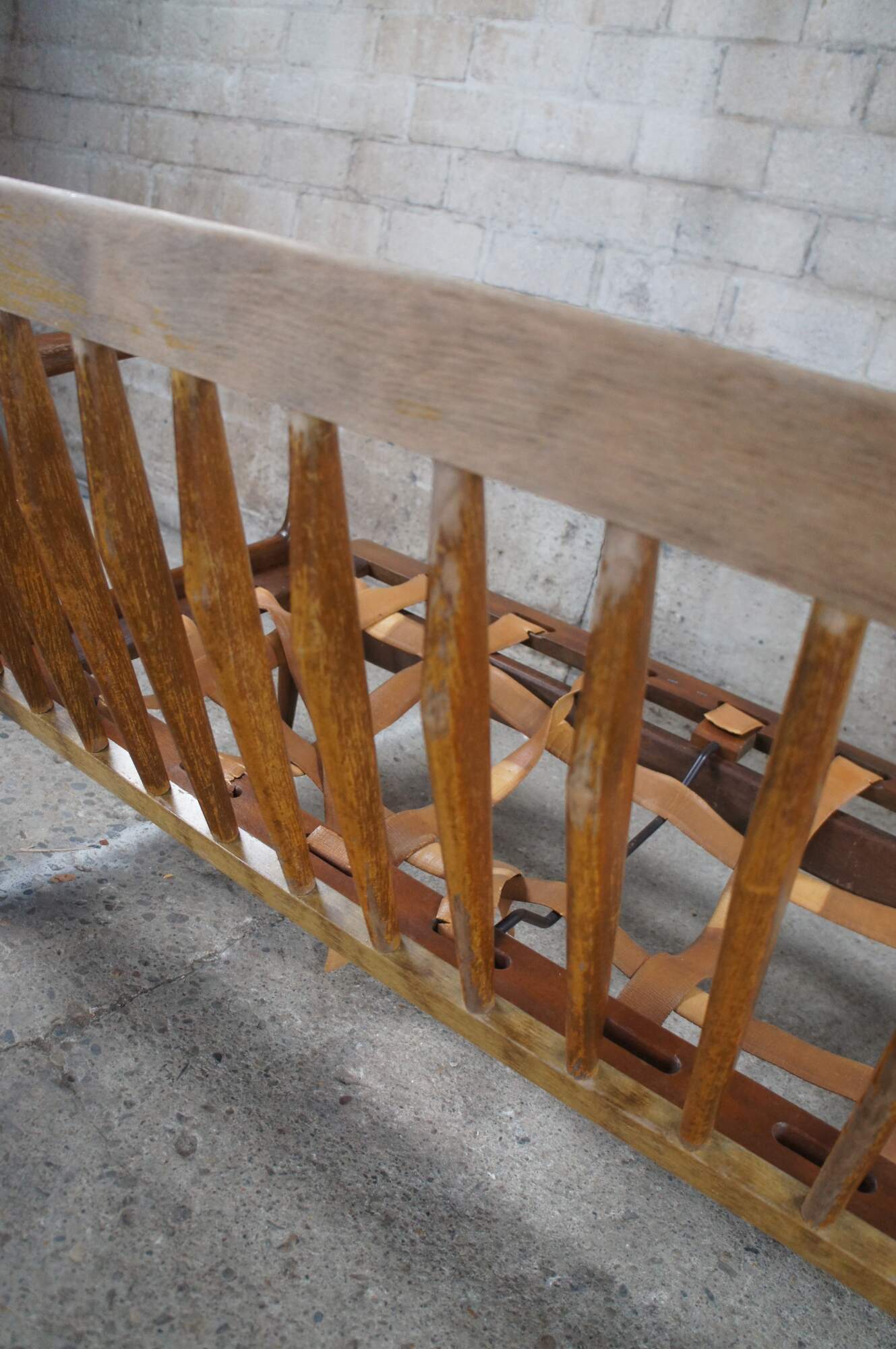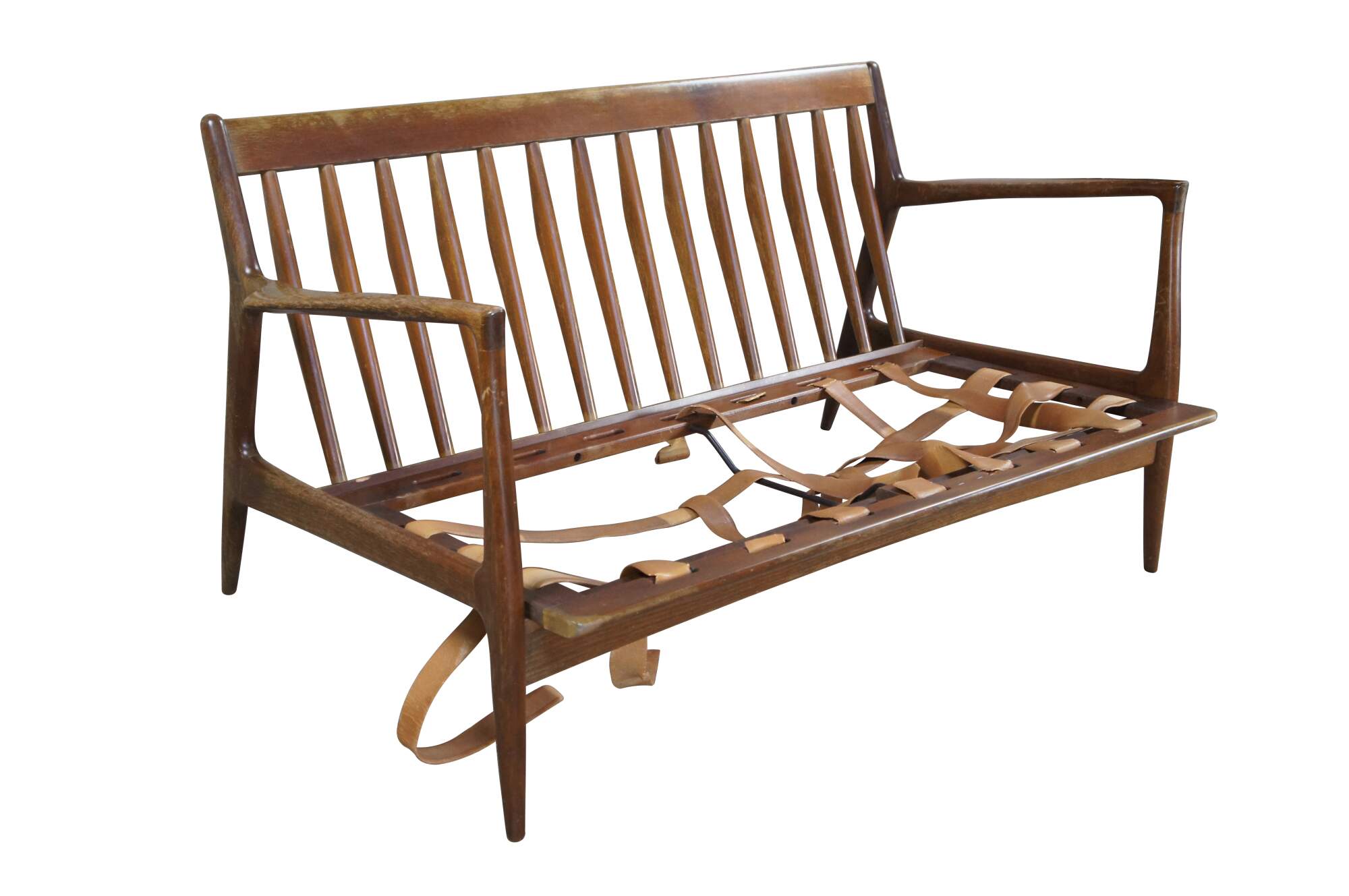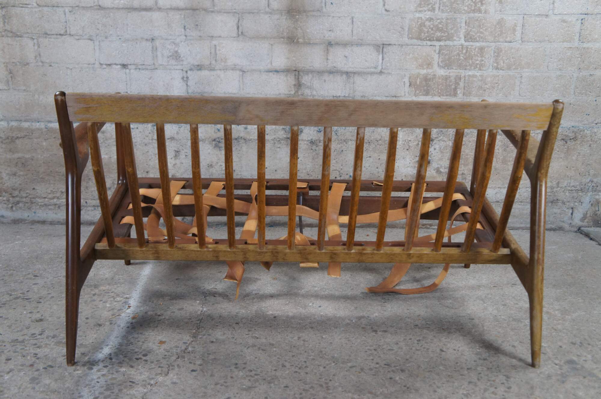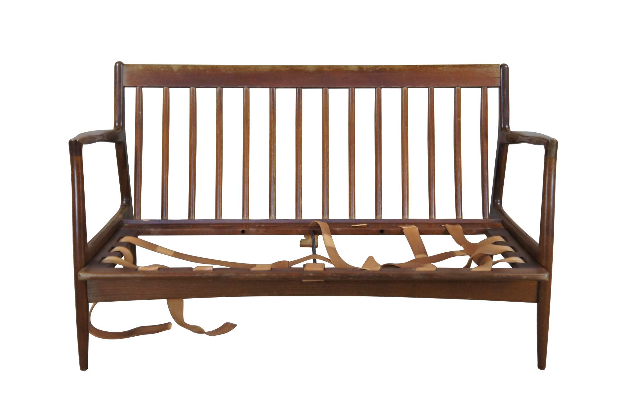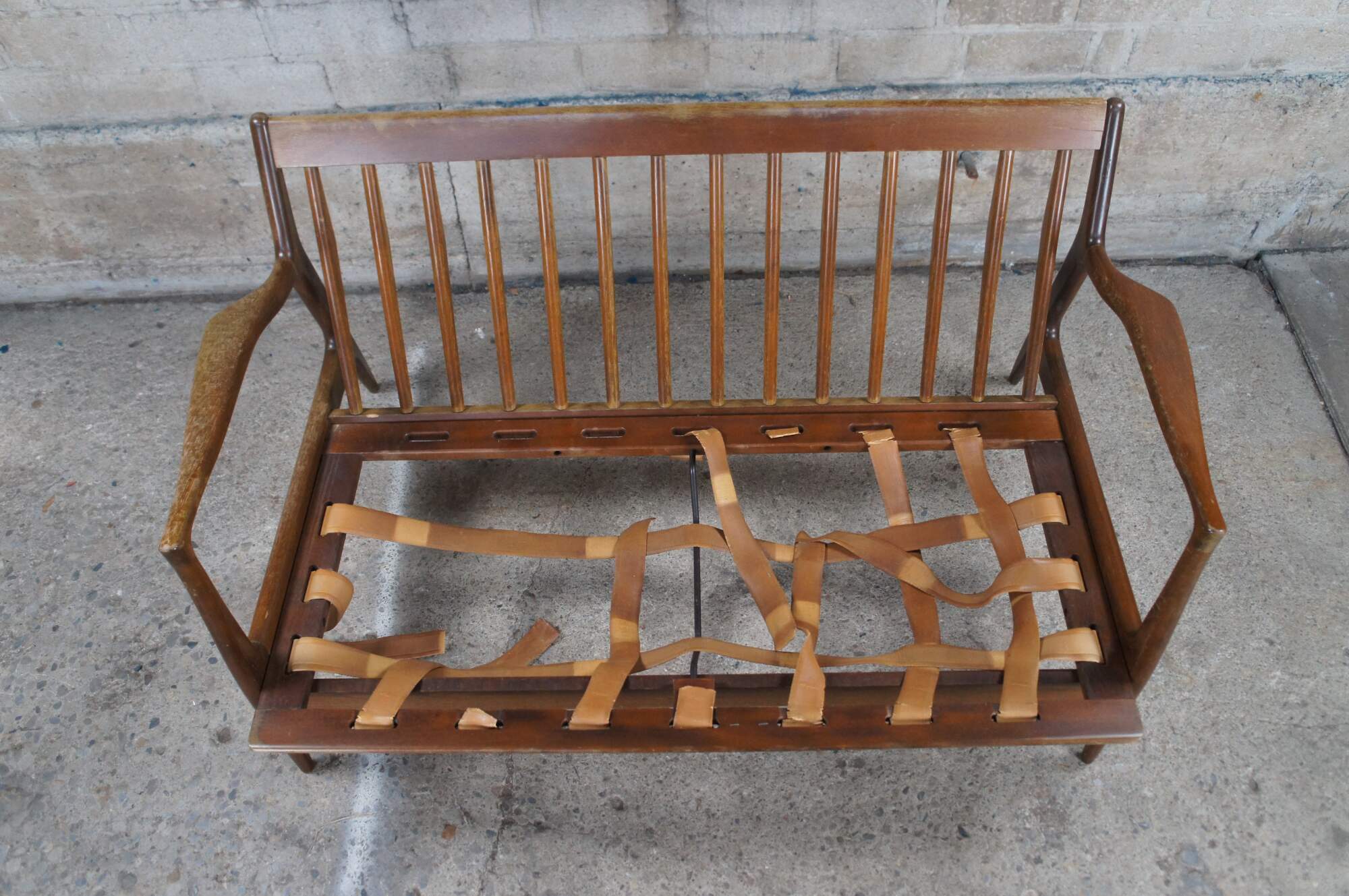 Fair condition, wear and distressing commensurate with age and use, finish loss, marking, sagging / dry rot / few missing seat supports, no cushions.