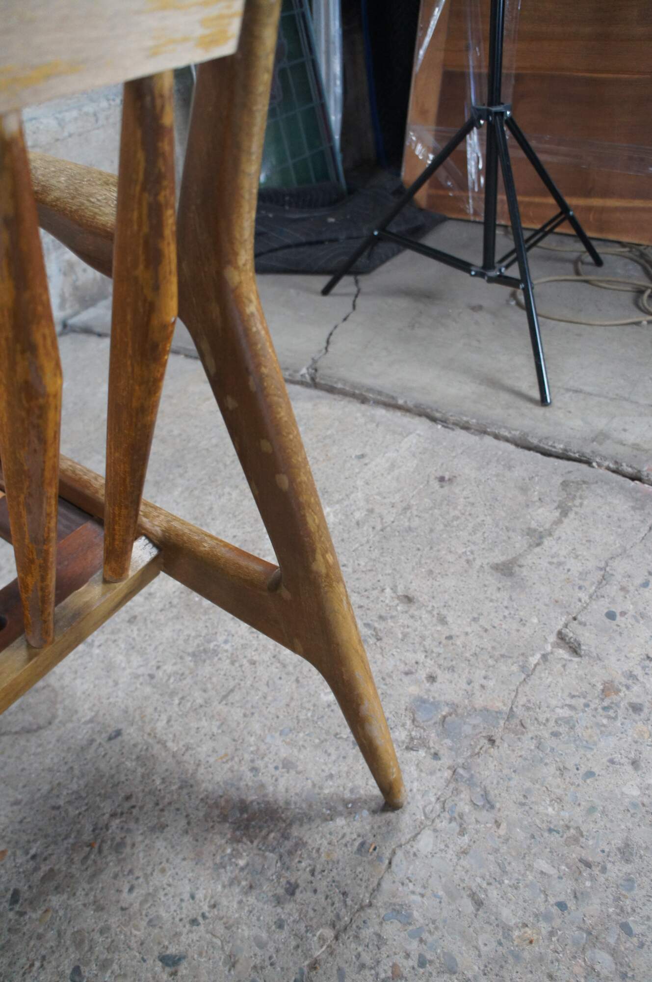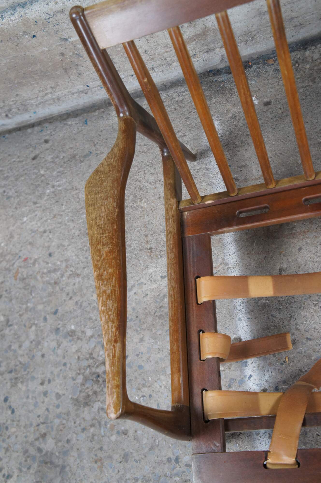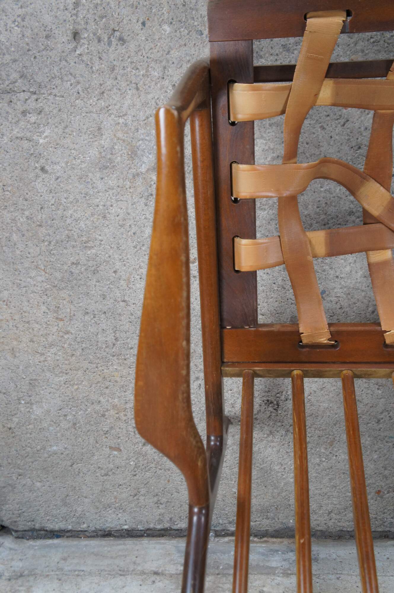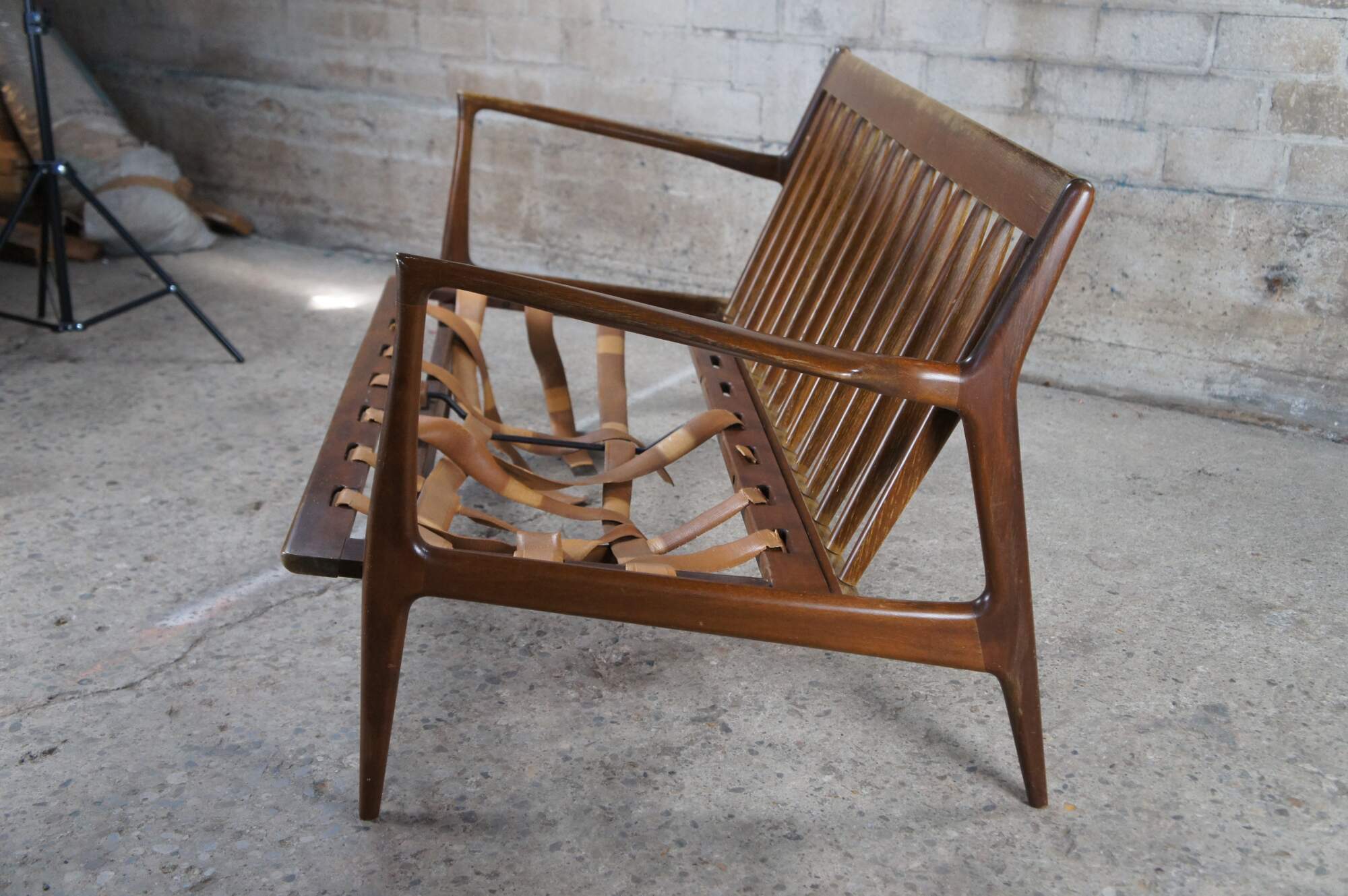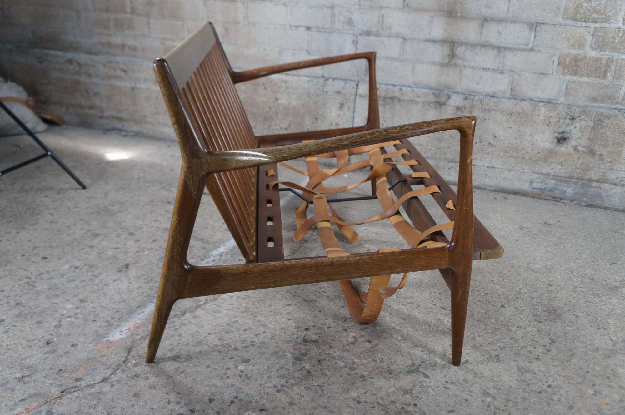 Fair condition, wear and distressing commensurate with age and use, finish loss, marking, sagging / dry rot / few missing seat supports, no cushions.