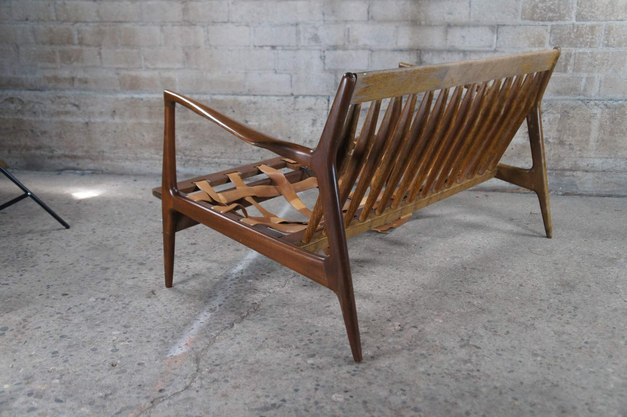Mid century modern IB Kofod Larsen for Selig Danish / Scandinavian settee / love seat or sofa. Made of walnut featuring sculpted frame with high sloped arms, tapered legs and vertical slats.