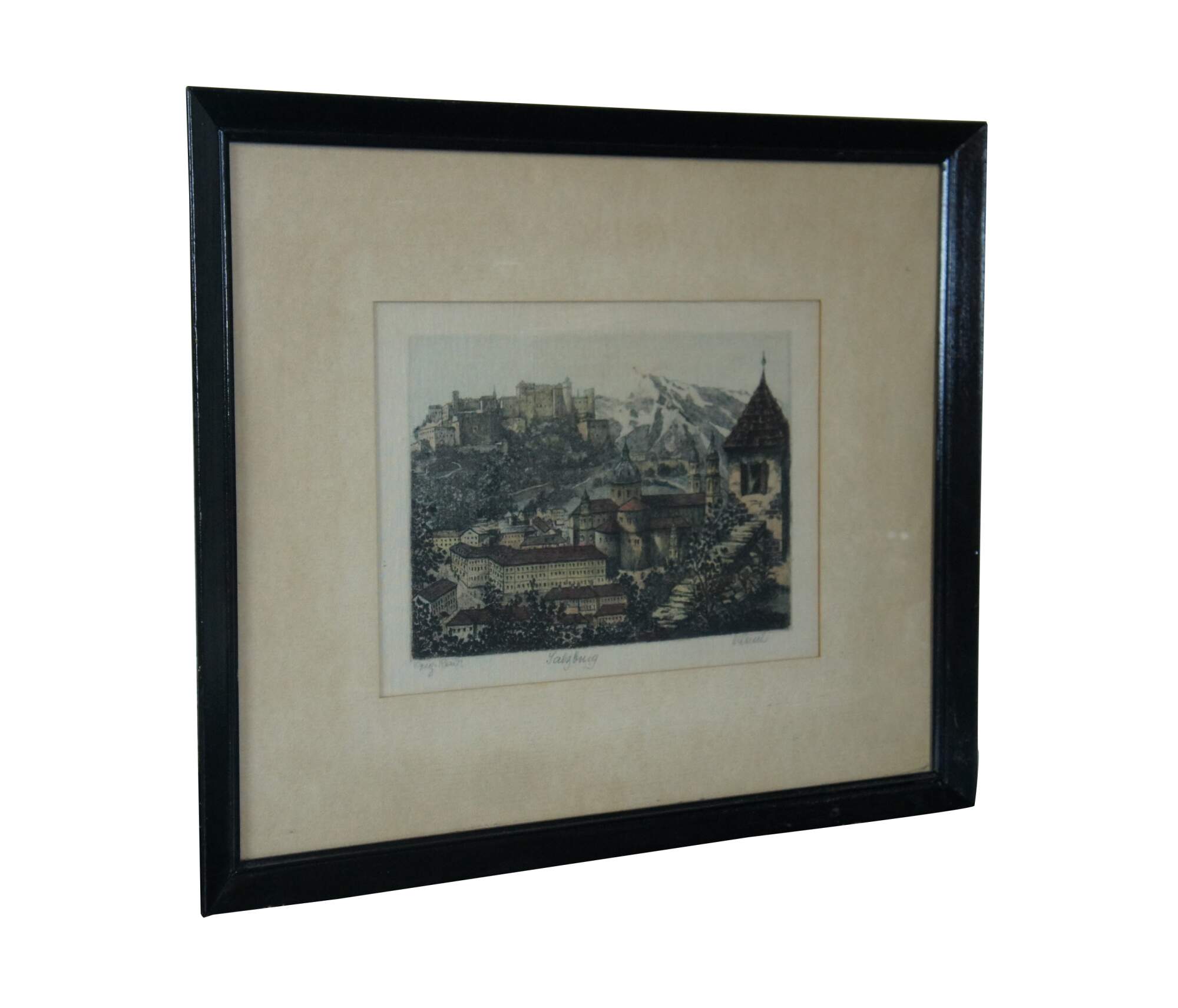 Mid to late 20th century colored etching on silk depicting a view of the city of Salzburg, Austria. Pencil marked "Orig. Rad. (Original Radierung) - Salzburg - H (W?) Leisch" along lower edge. Attributed to 20th century Austrian artist Hans Leisch. Black painted wood frame; beige mat.