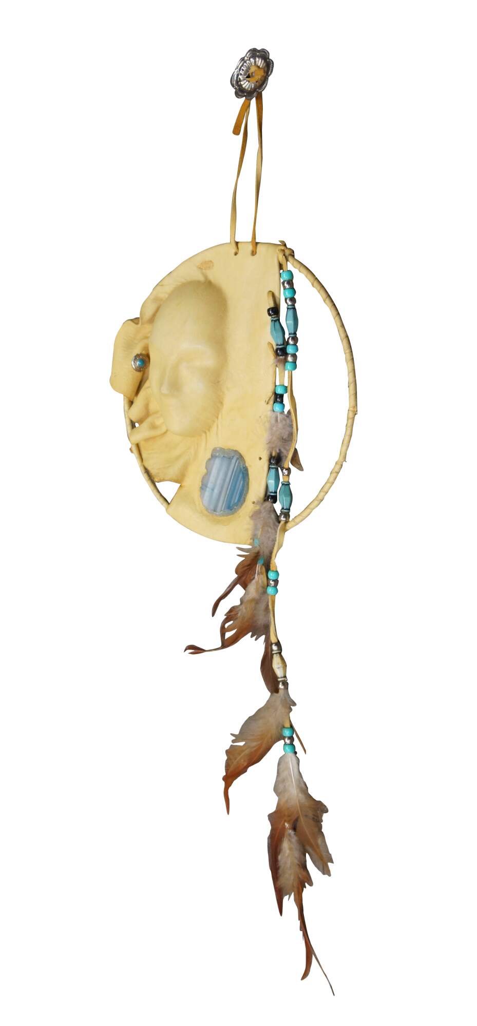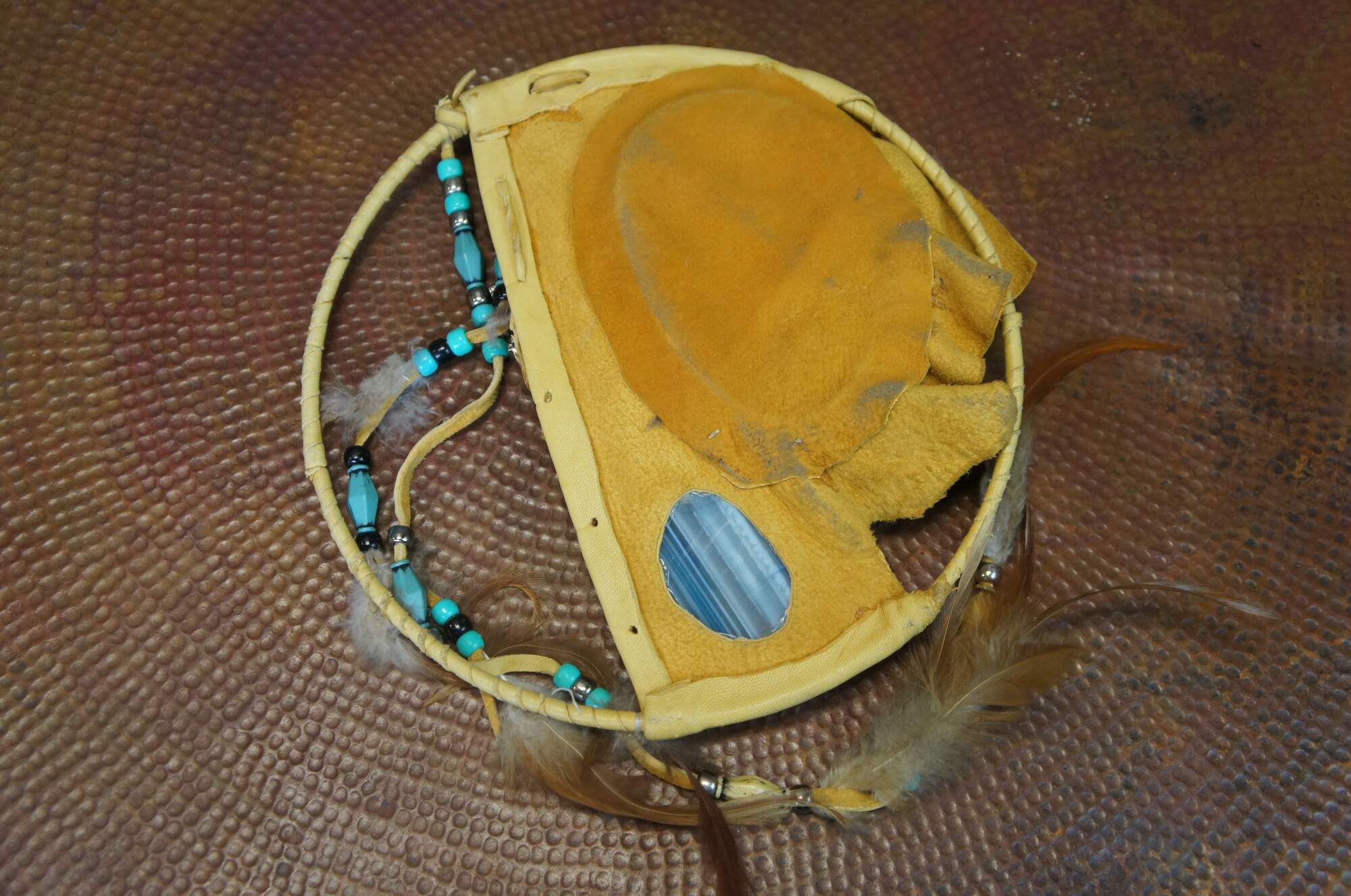 Late 20th century decorative wall hanging inspired by Native American spirit / medicine shields / dream catchers. Features a round hoop wrapped and partly covered by stretched leather, including a three dimensional face and embellished with a concho, slice of agate, feathers and black, silver, and turquoise beads. Suspended from a eather cord with concho.