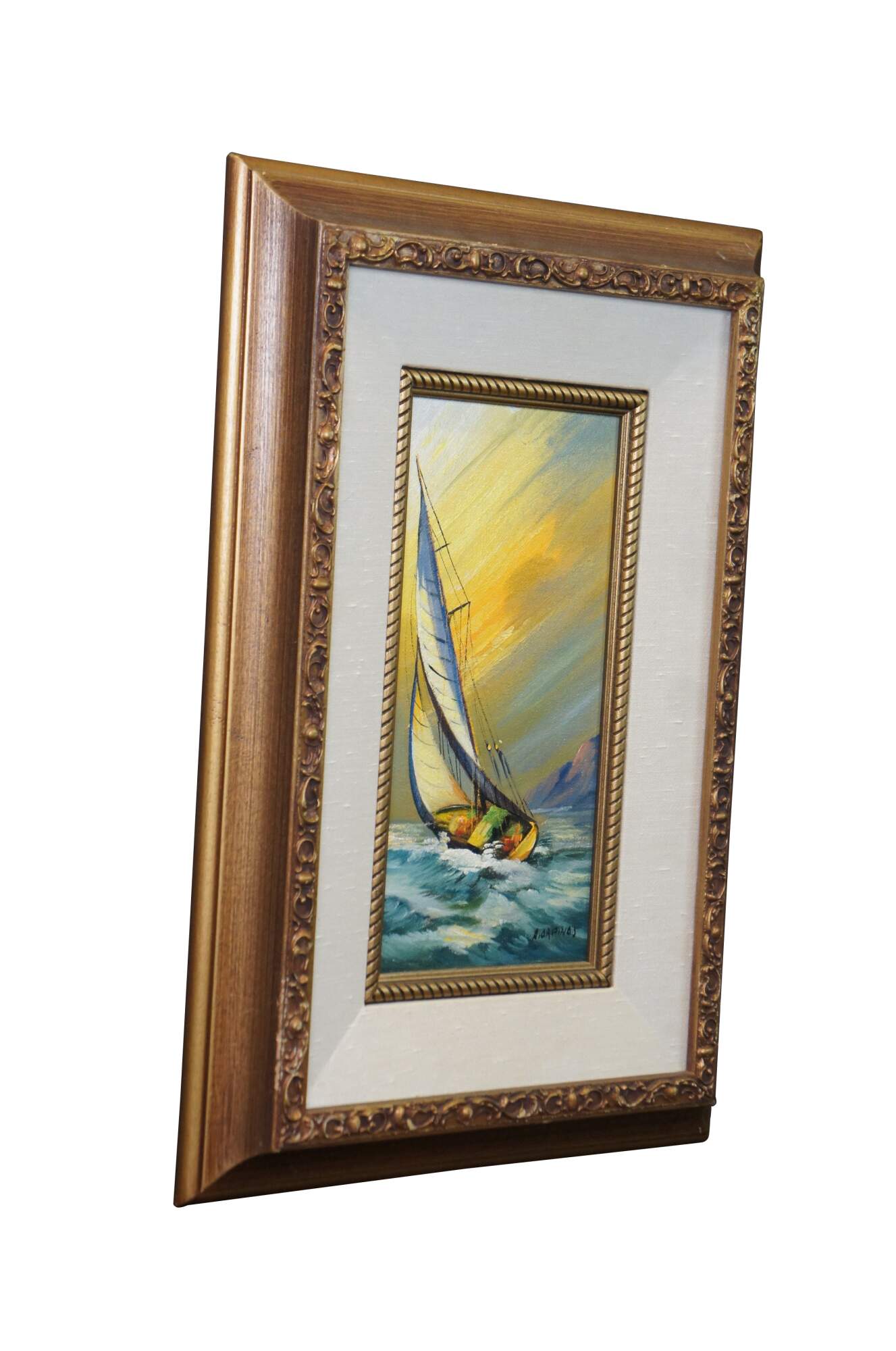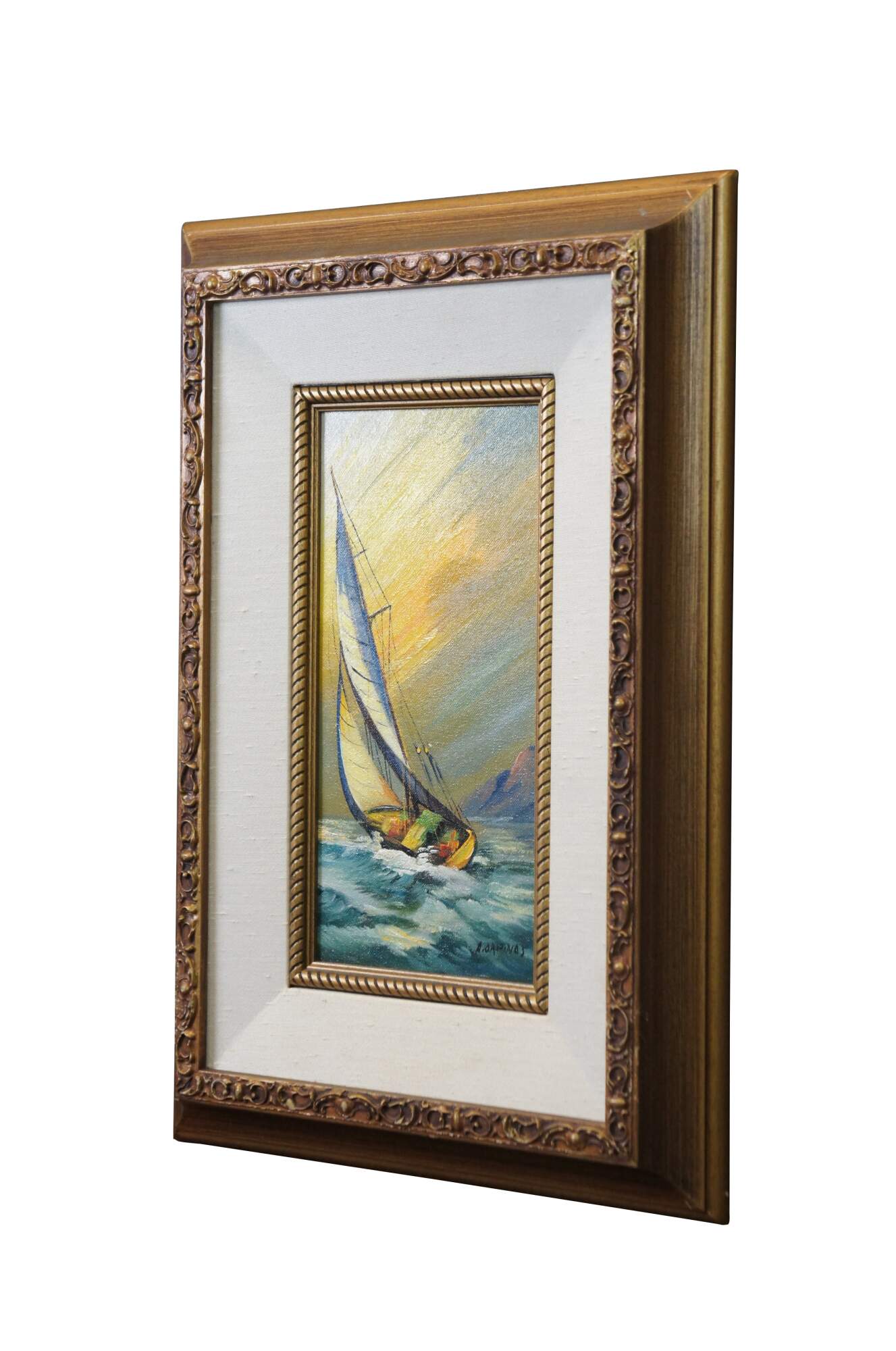 Late 20th century oil on board maritime seascape expressionist painting attributed to Chilean artist Andres Orpinas, depicting a sail boat tossing on the waves beneath an orange sunset sky. Signed A. Orpinas in lower right. Beveled and floral carved giltwood frame with white linen mat and rope twist edge.