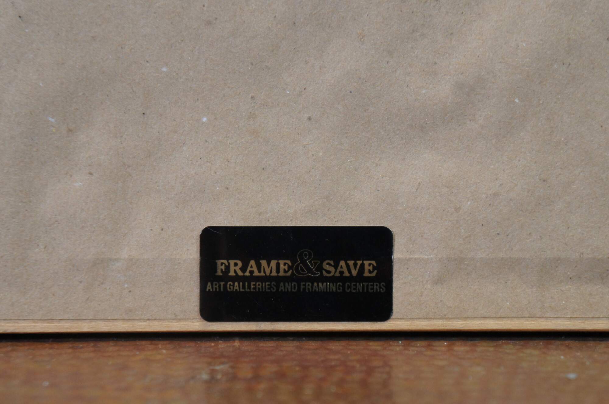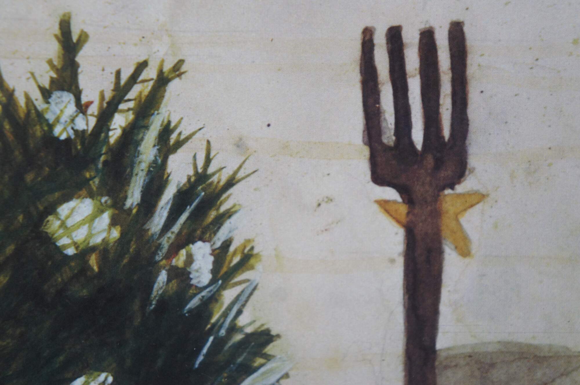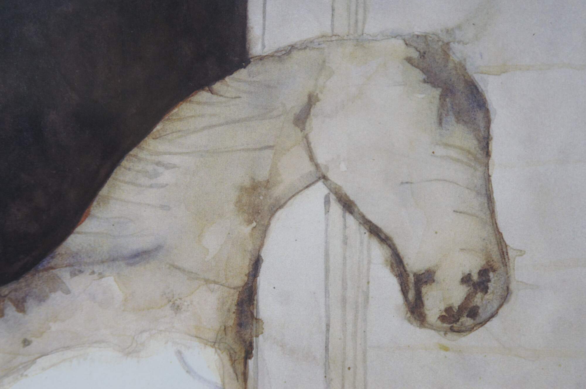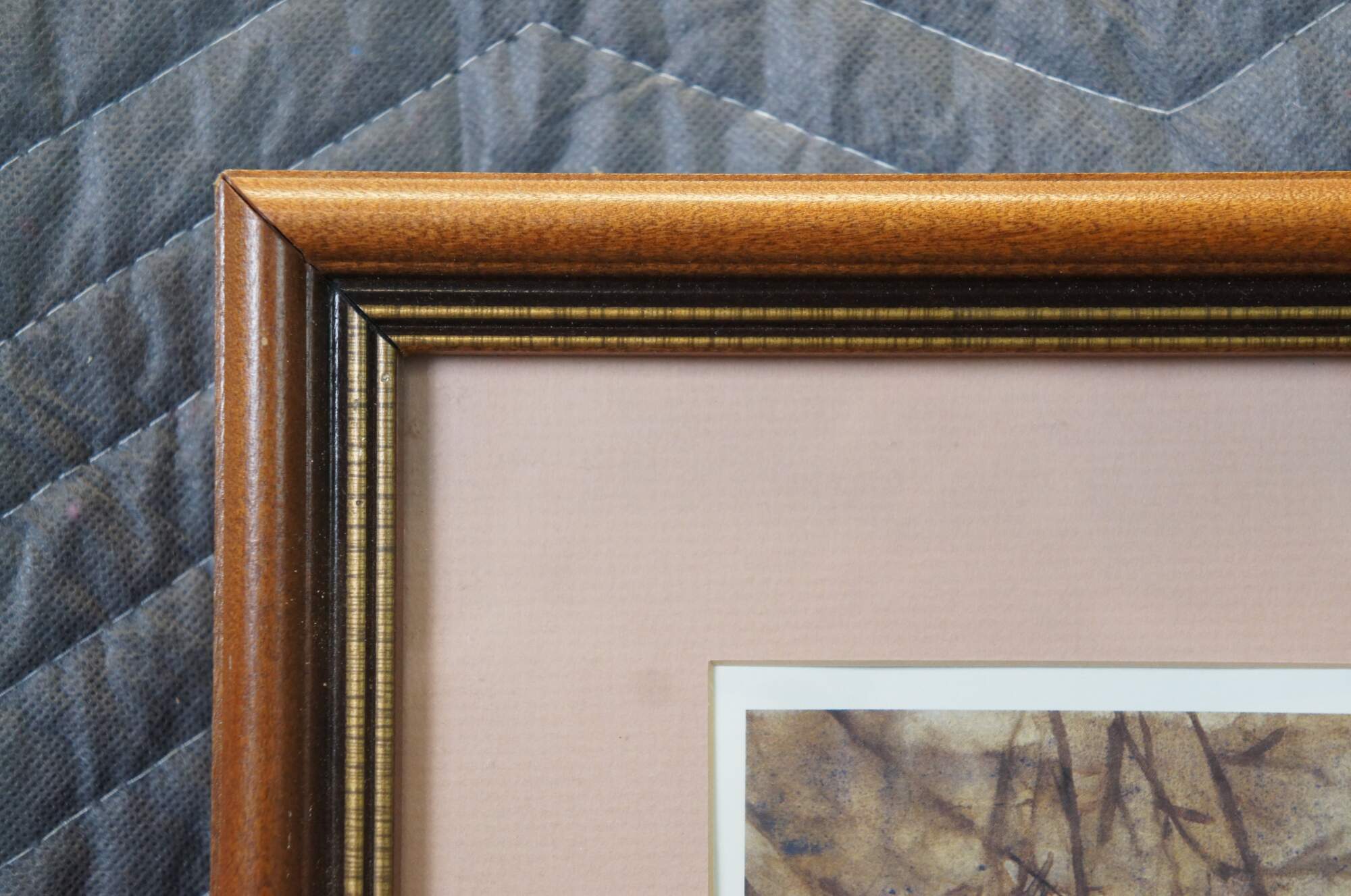 Late 20th century lithograph print of the still life "Natural Charms" by Ashley Akers. Depicts an array of rustic objects including a toy equestrian horse, potted plants, a watering can, and wooden basin on a table by a window. Rounded wood frame with black painted bevel; light pink mat.