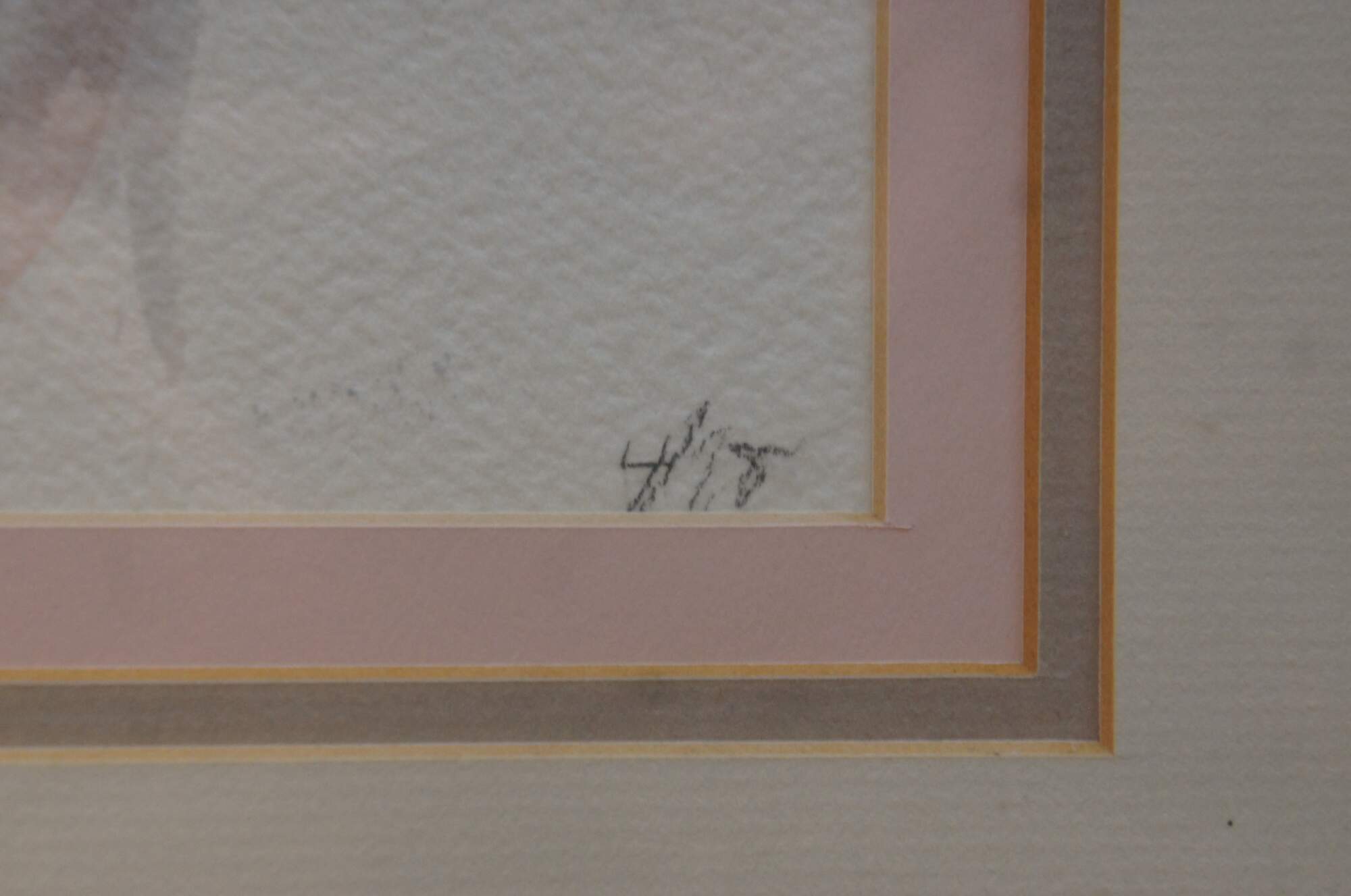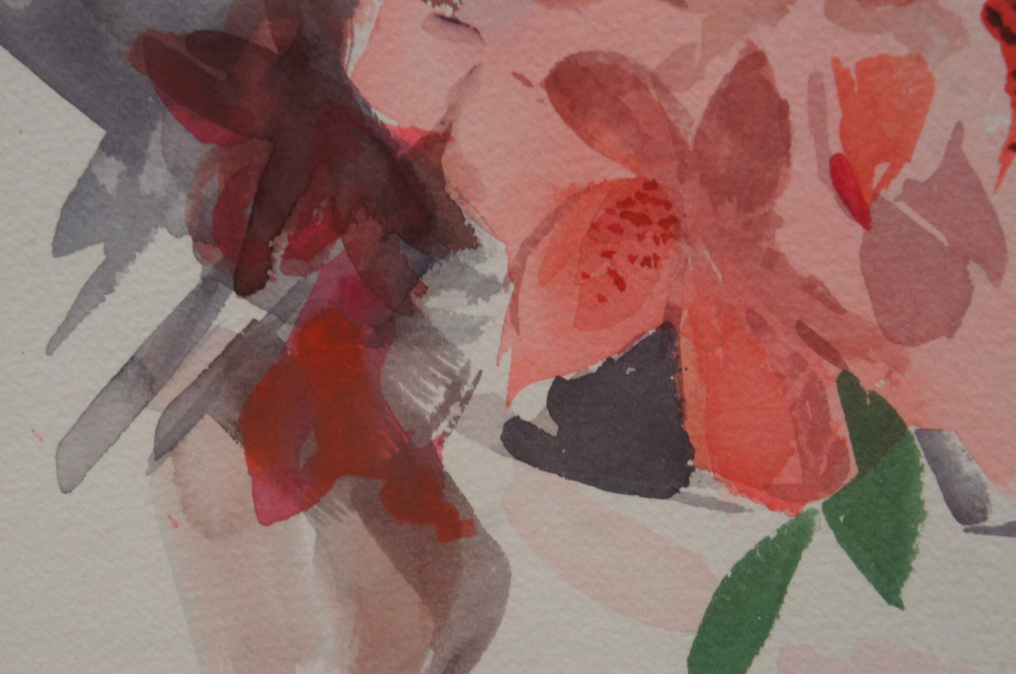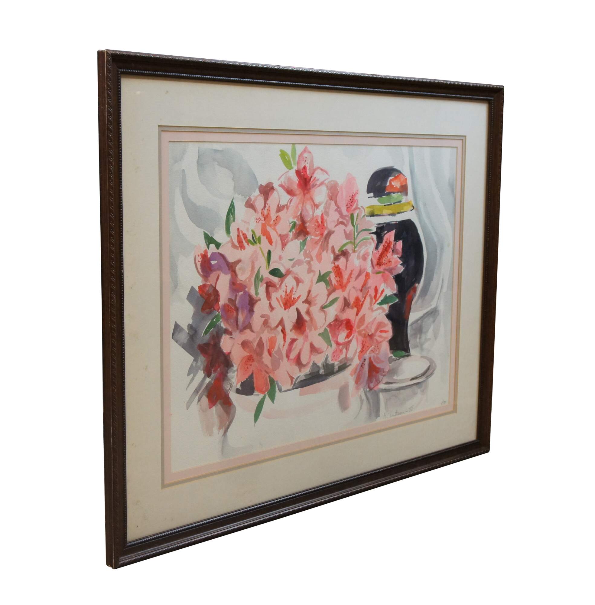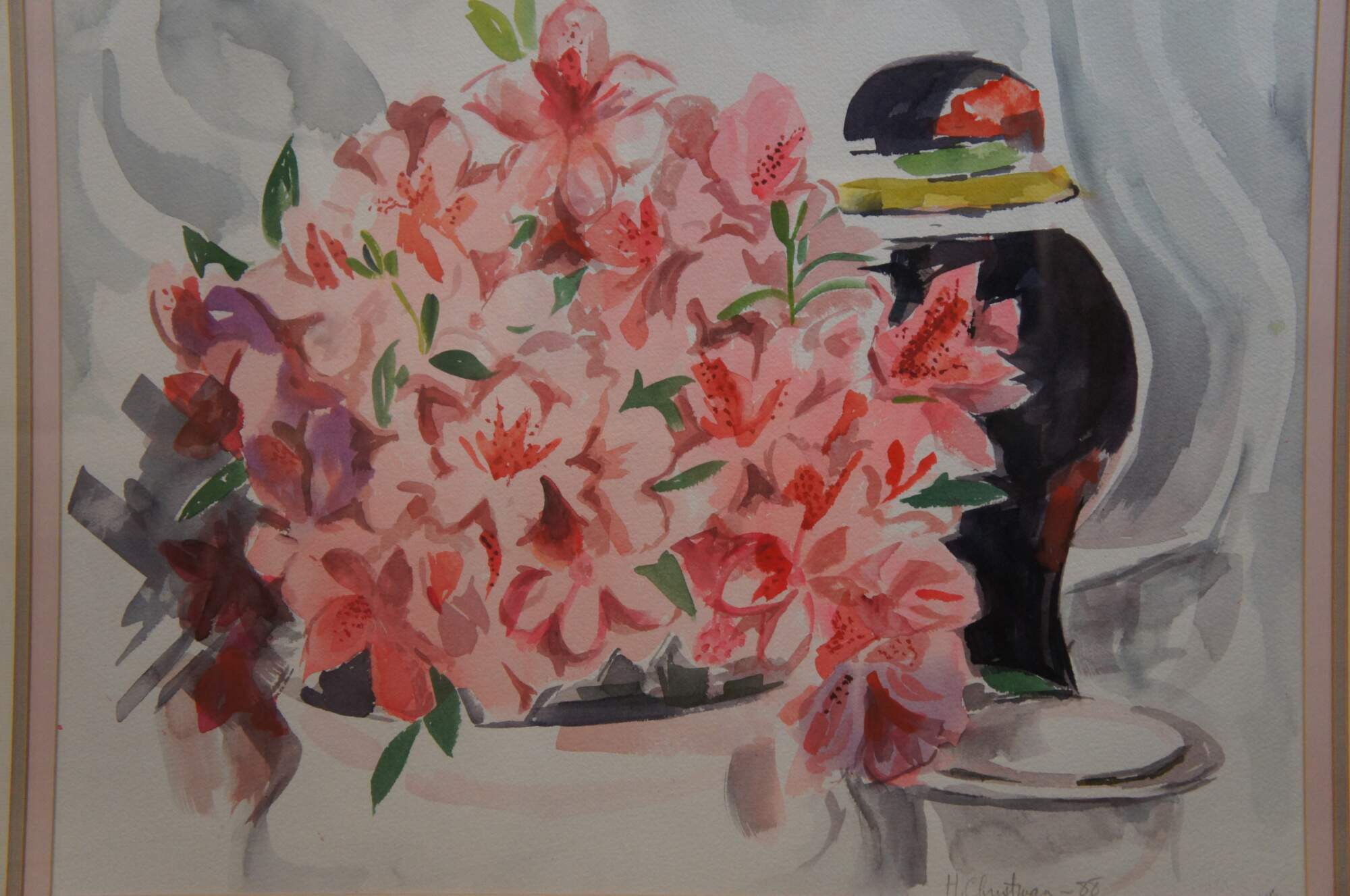 Vintage 1988 watercolor on paper still life painting by H. Christman. Depicts a bouquet of pink alstroemerias in a white vase with a red and black ginger jar in the background. Signed at lower right. Carved and beveled wood frame; off white, beige, and pink layered mat.