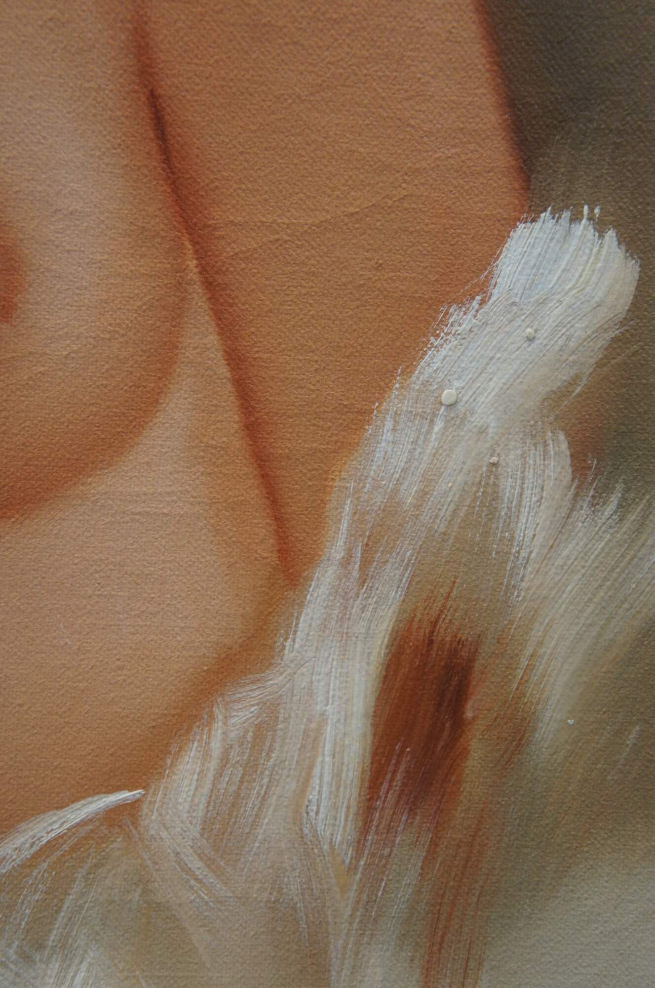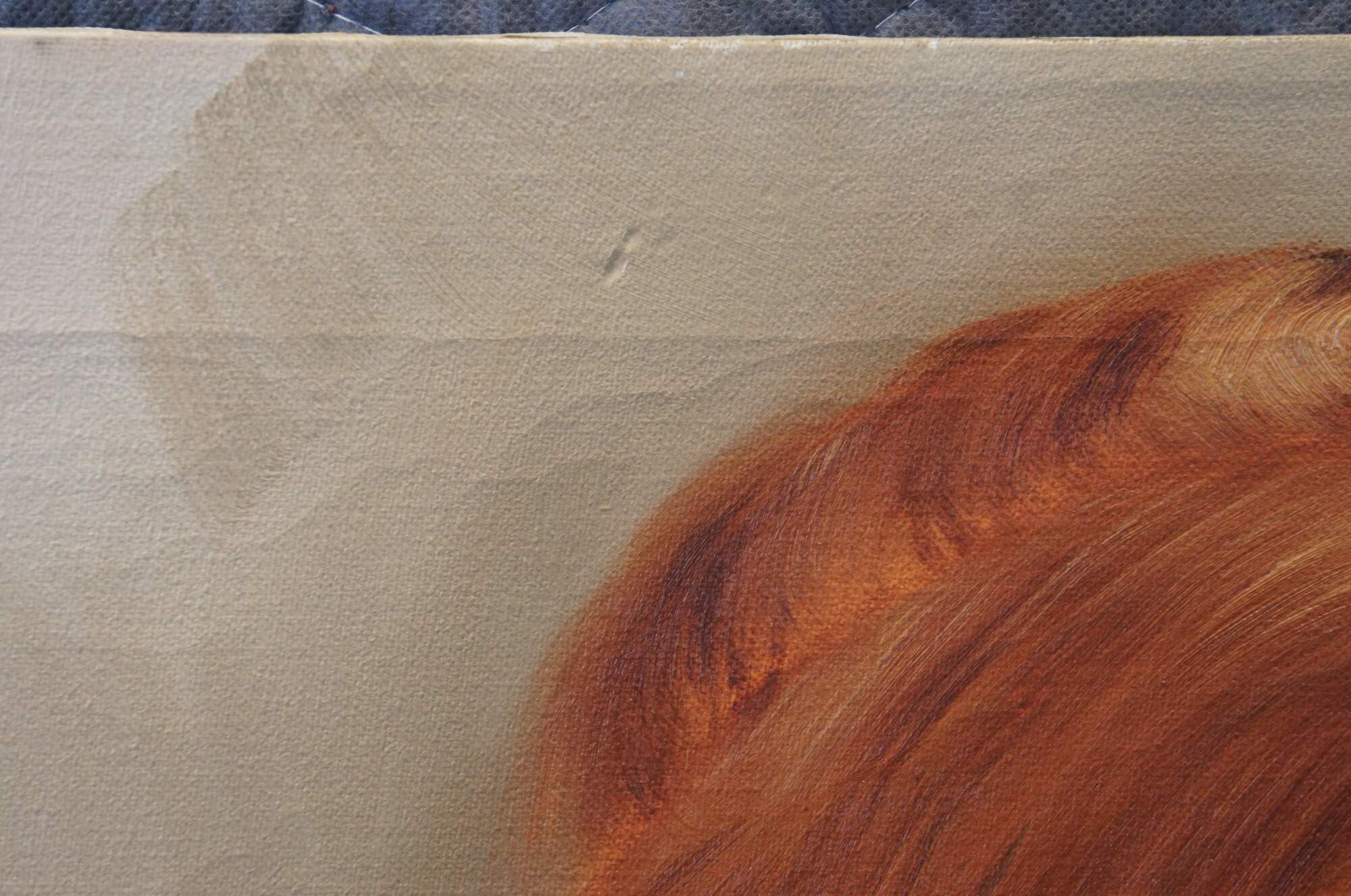 Vintage 20th century oil on canvas painting depicting a topless portrait of a nude woman with reddish blonde hair, signed Kelvin in lower right.