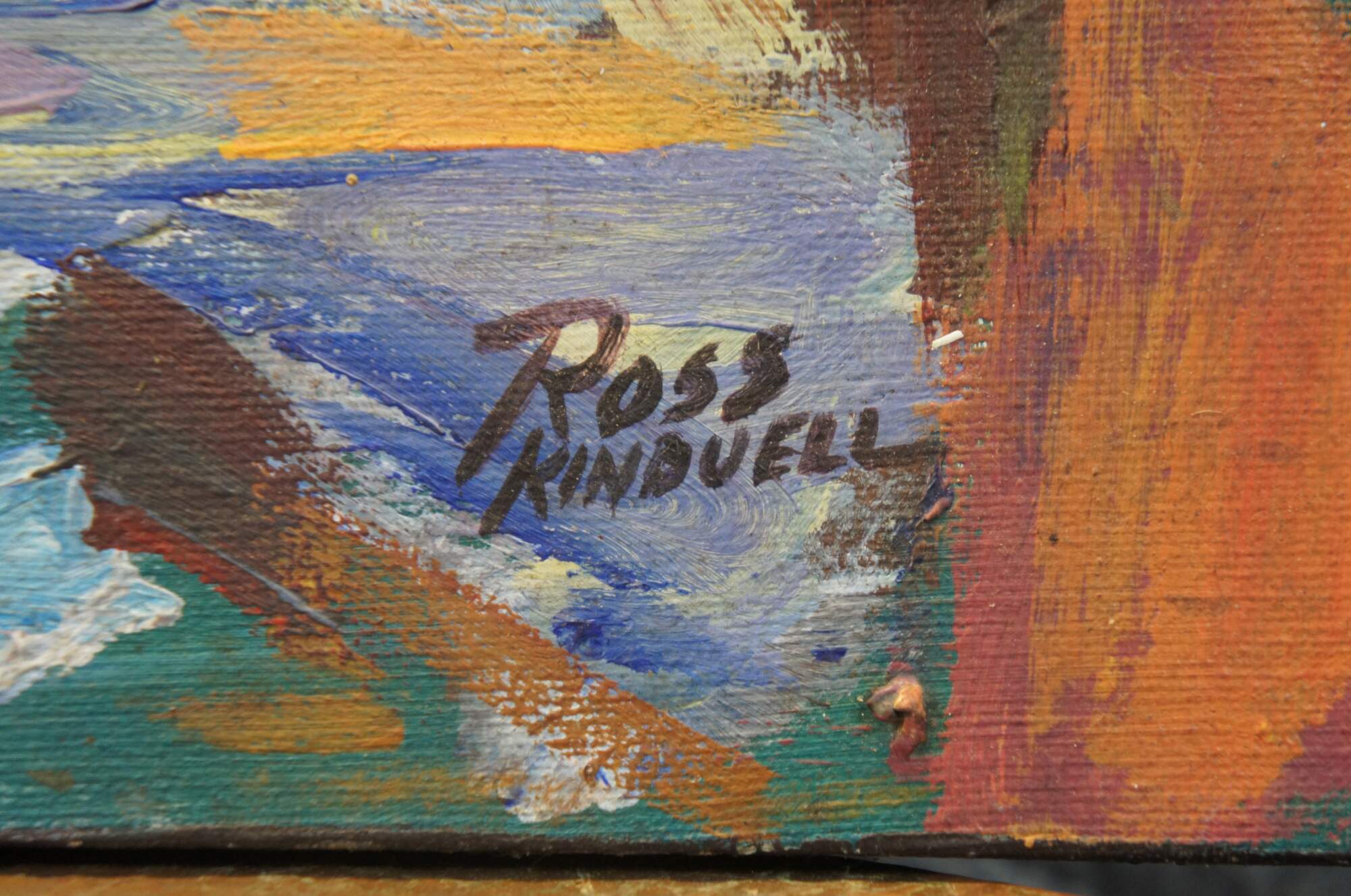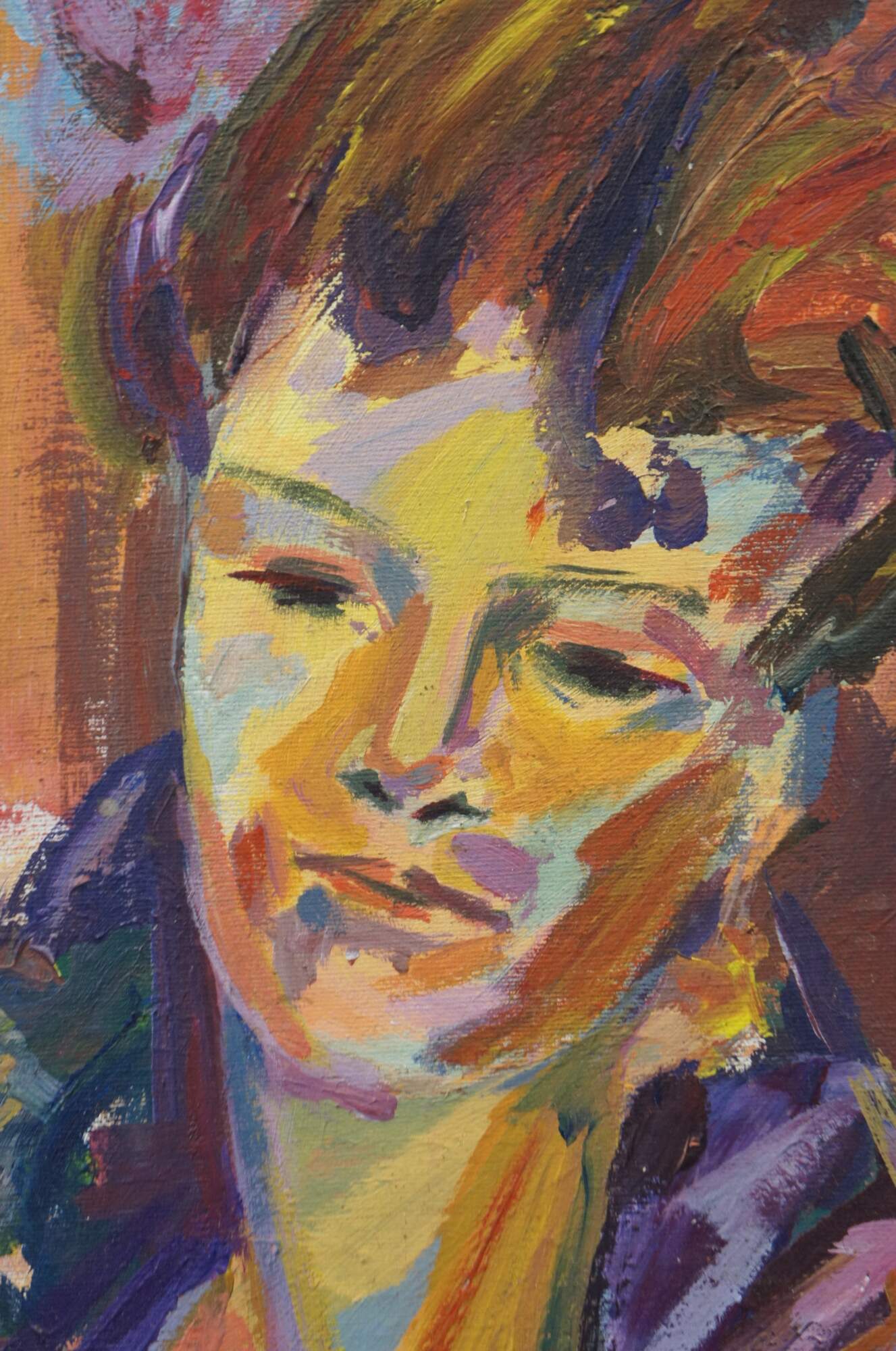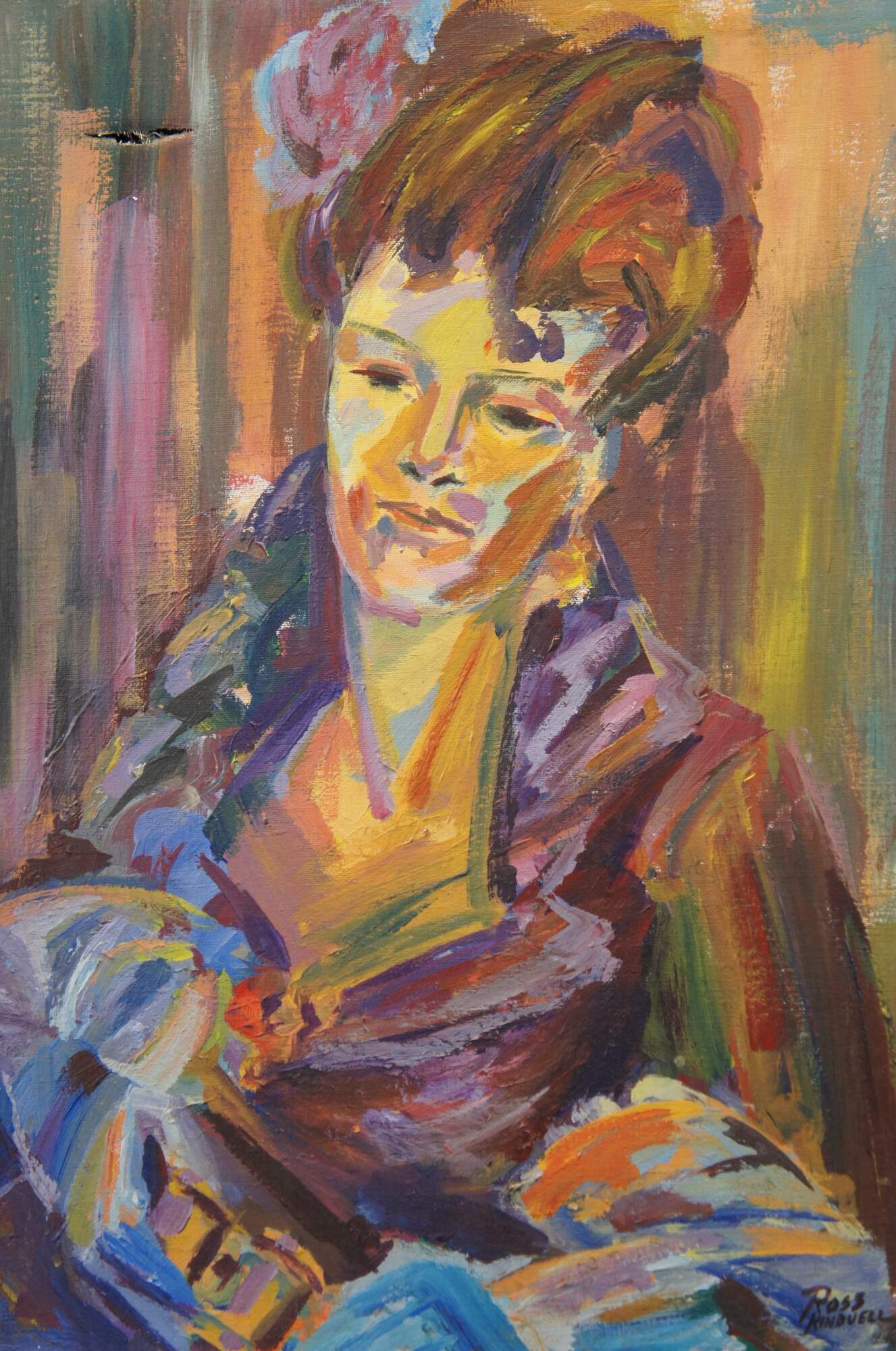 Vintage 20th century oil on canvas painting by Ross Kinduell, depicting a female figure in Victorian clothing, painting in a bold, colorful, expressionist style. Signed in lower right.