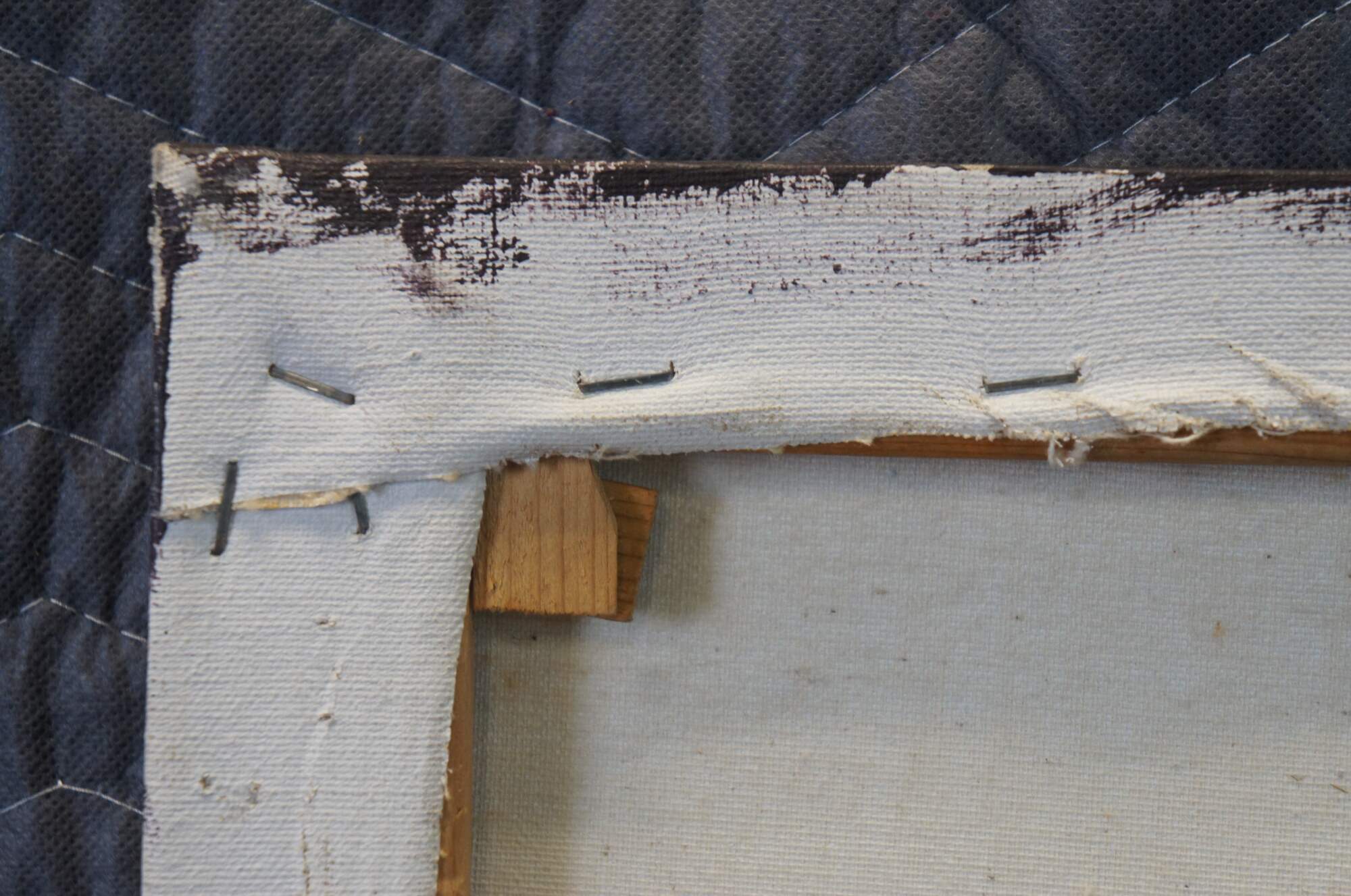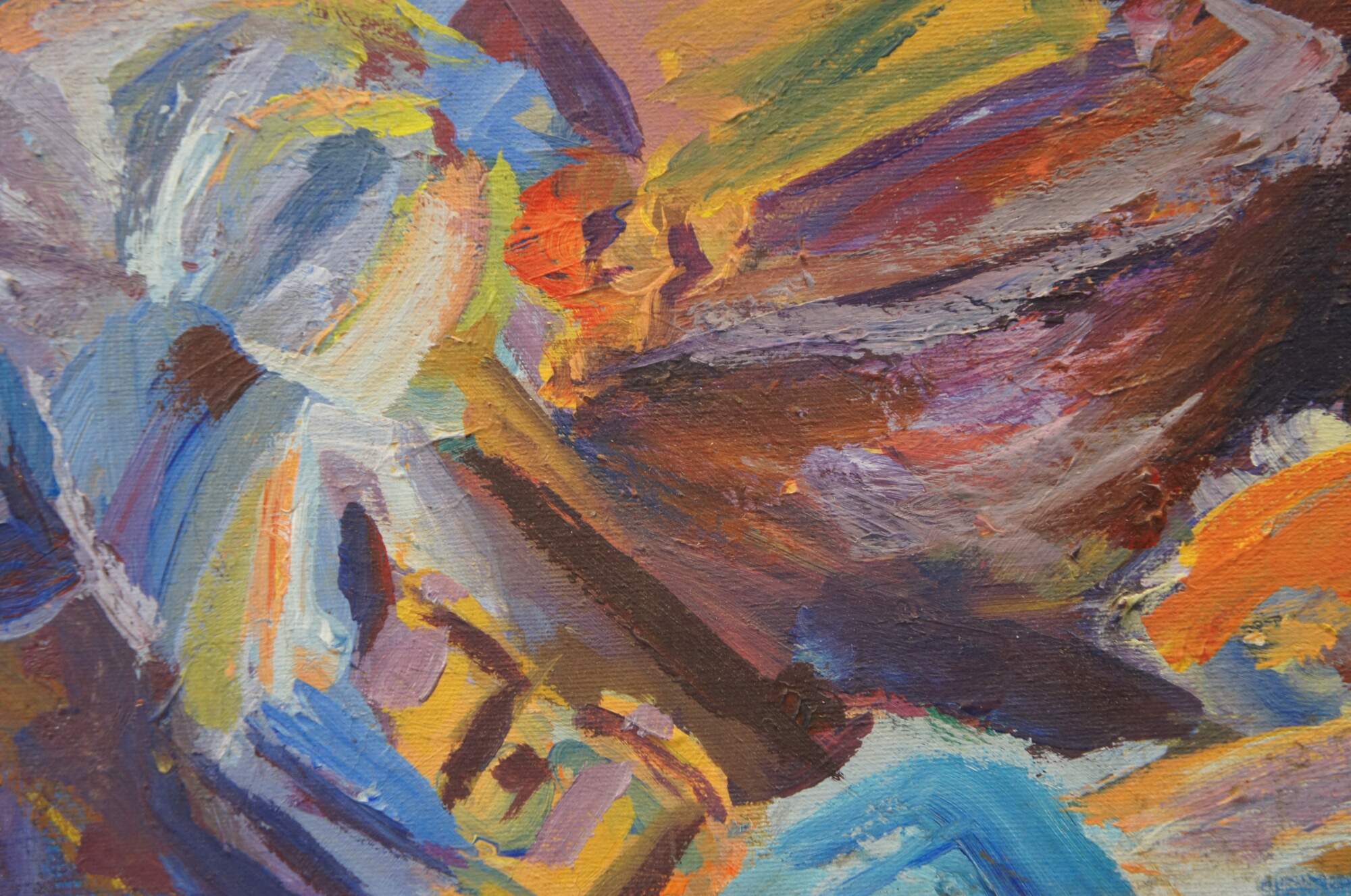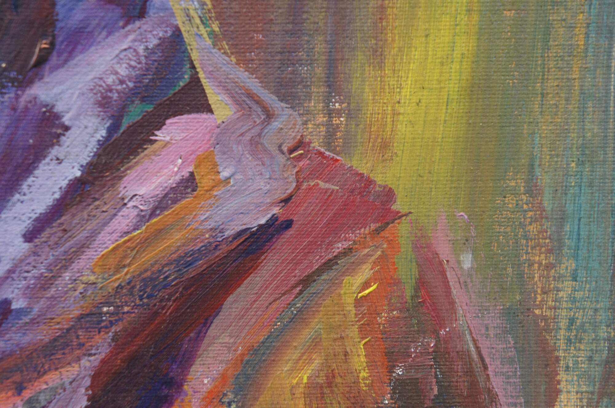 Vintage 20th century oil on canvas painting by Ross Kinduell, depicting a female figure in Victorian clothing, painting in a bold, colorful, expressionist style. Signed in lower right.