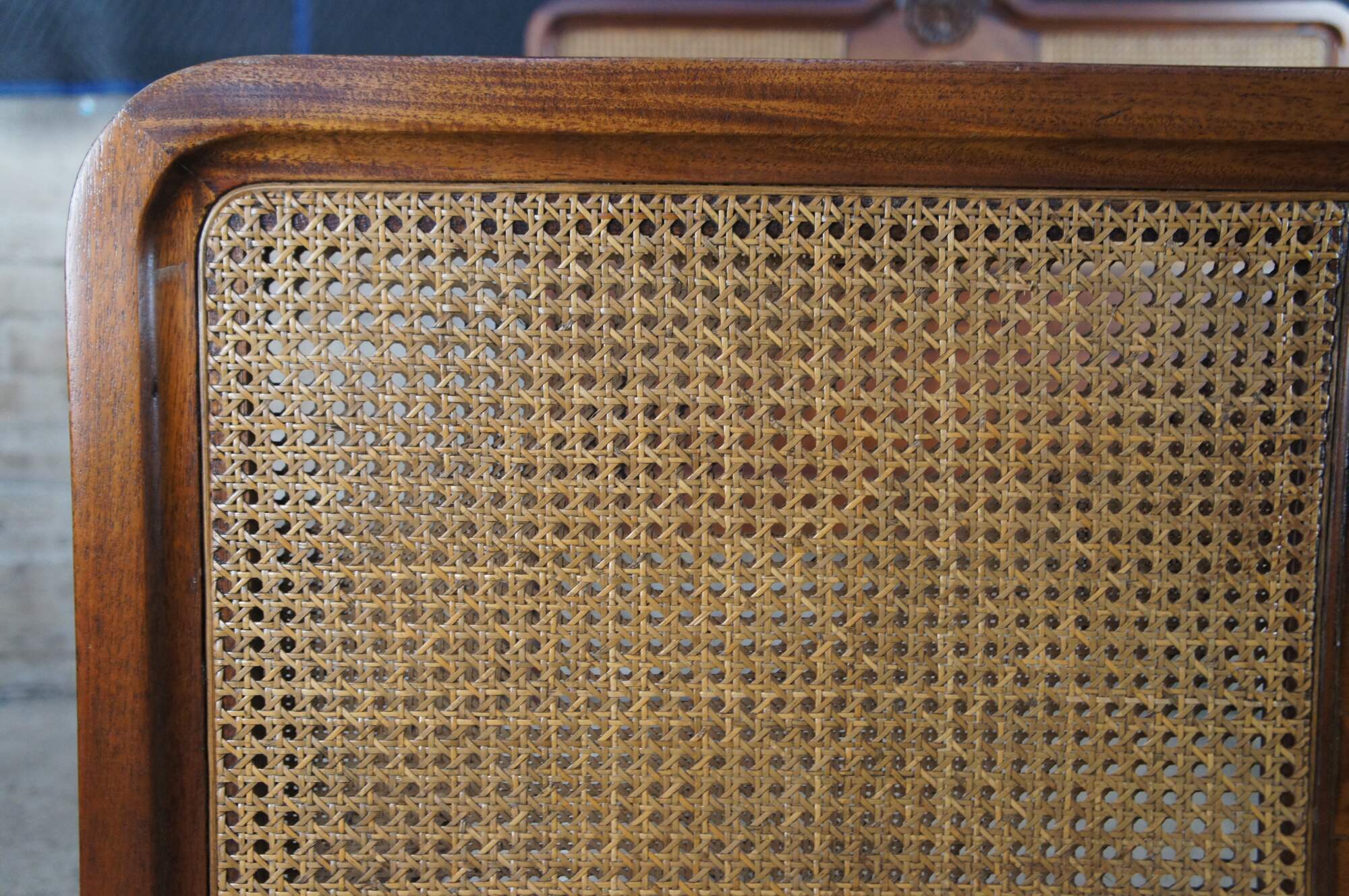 Antique French Provincial / French country / Louis XV style full size bed. Made of walnut featuring caned design with medallion crested headboard and barley twisted accents. Circa French Victorian era.