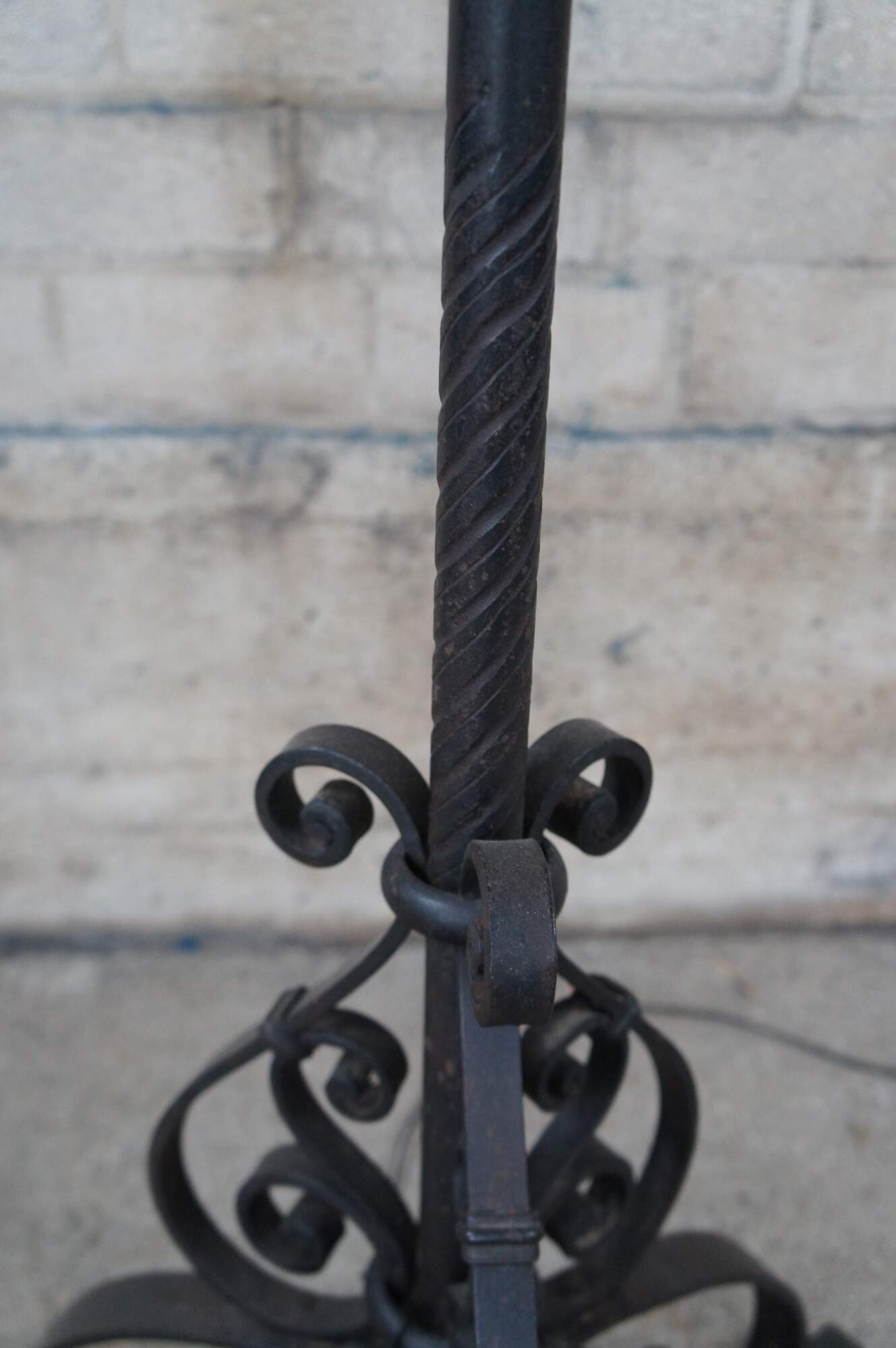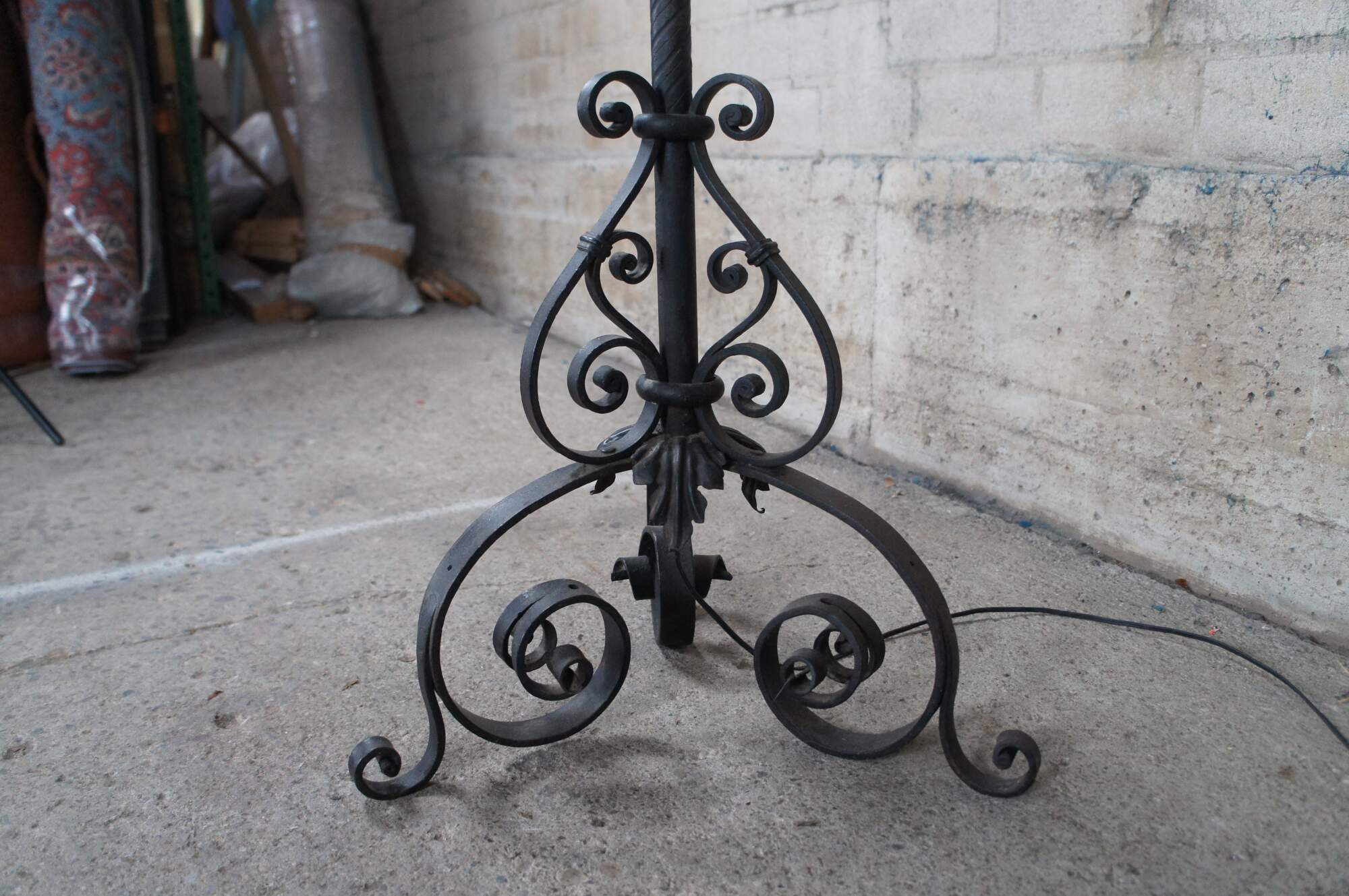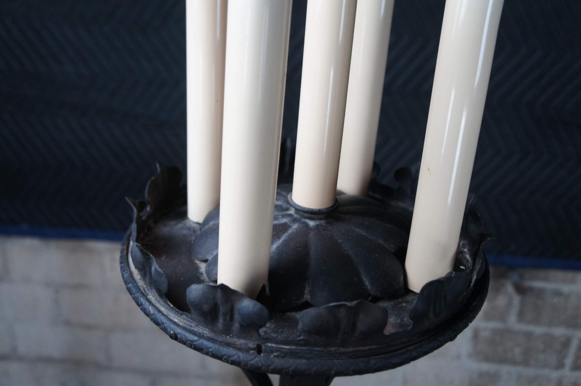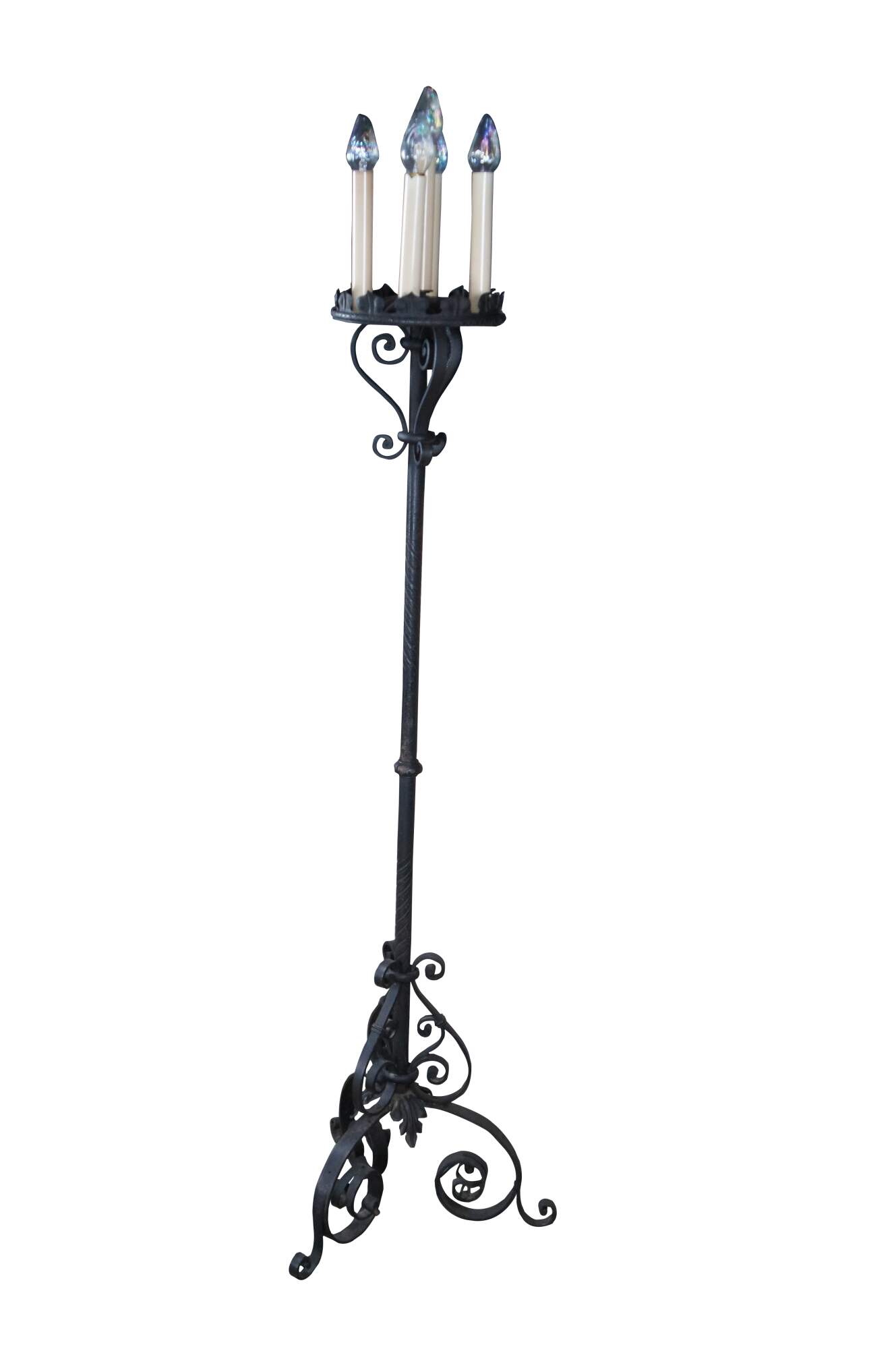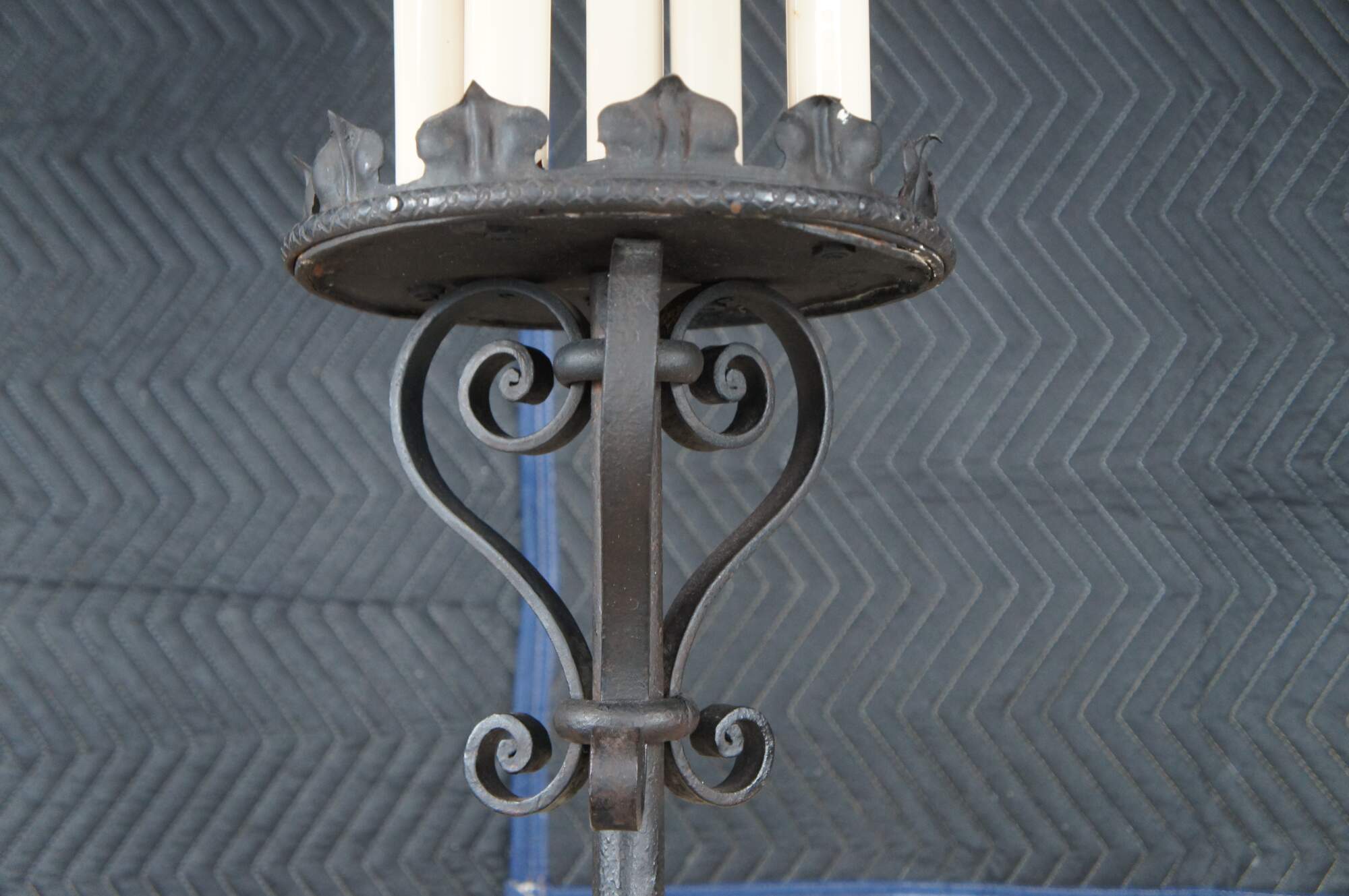 Very large and impressive early 20th century wrought / forged iron floor lamp featuring Gothic / Spanish styling with scrolled accents and five light torchiere candlestick candelabra.
