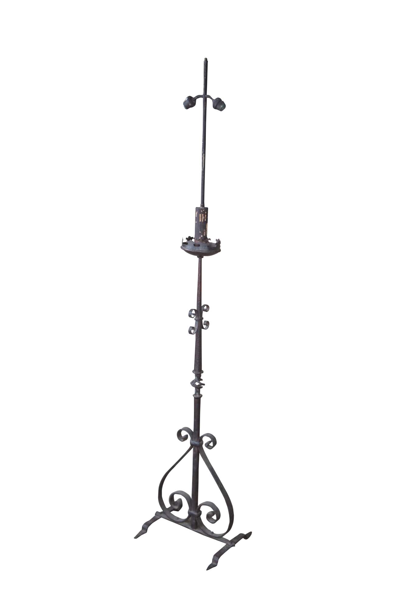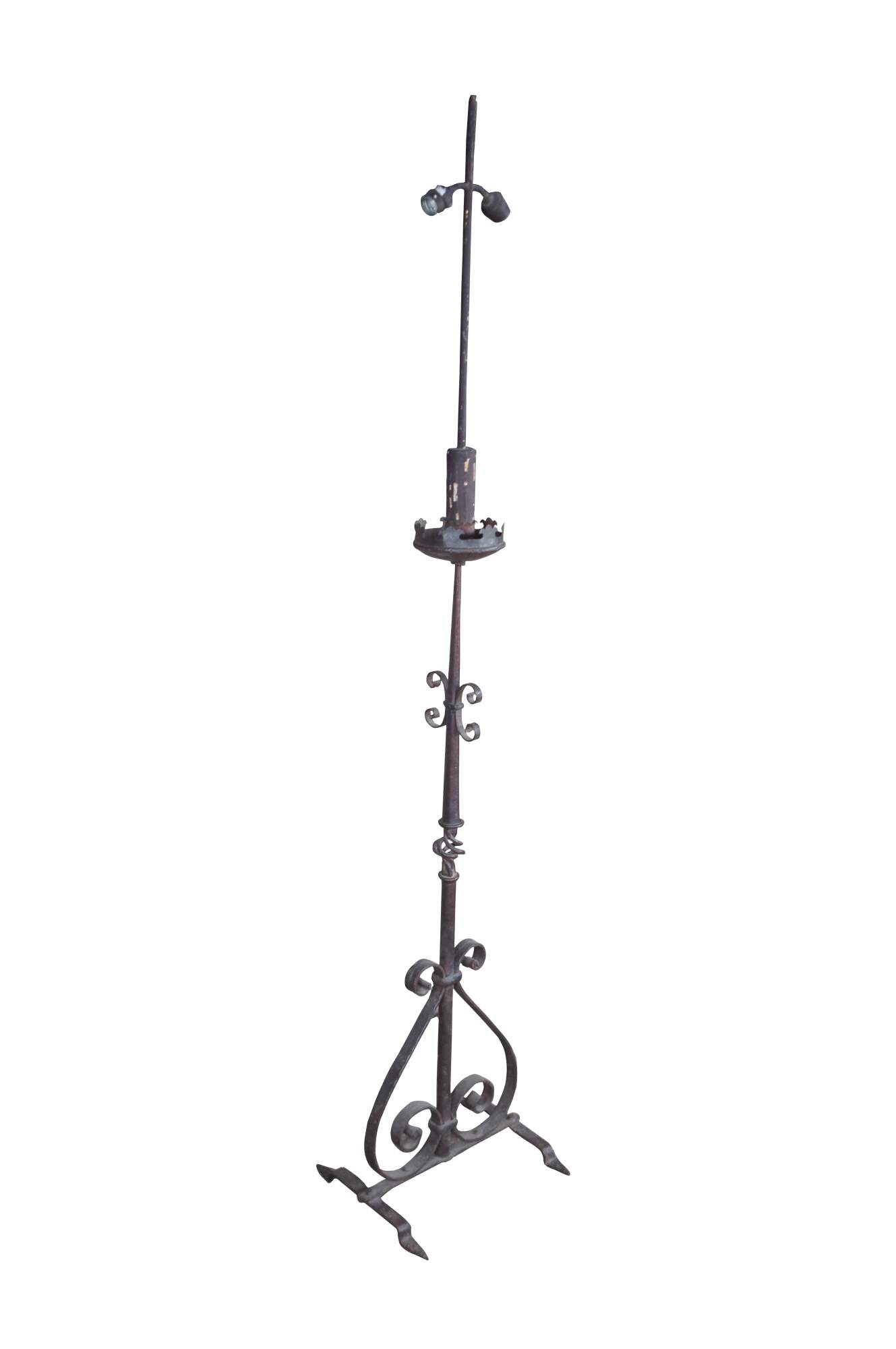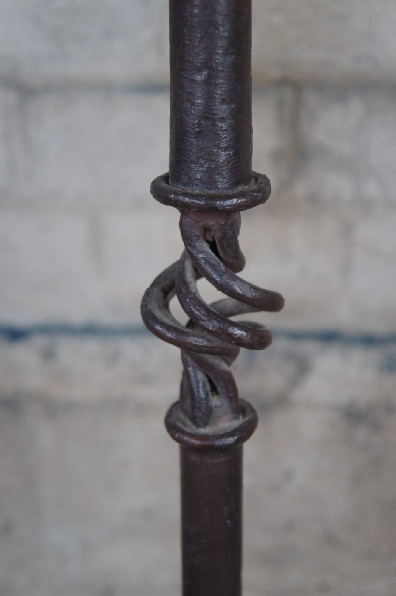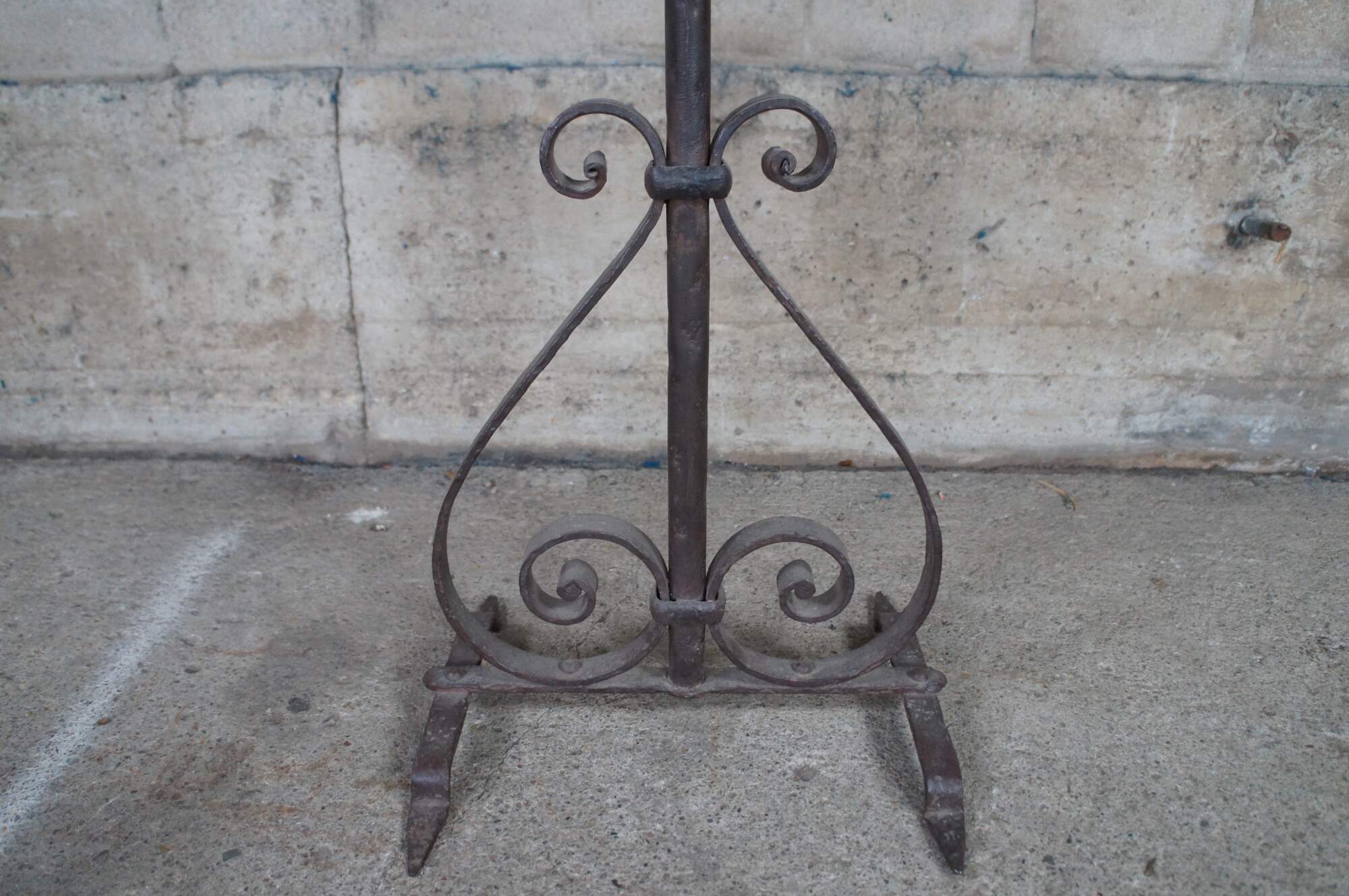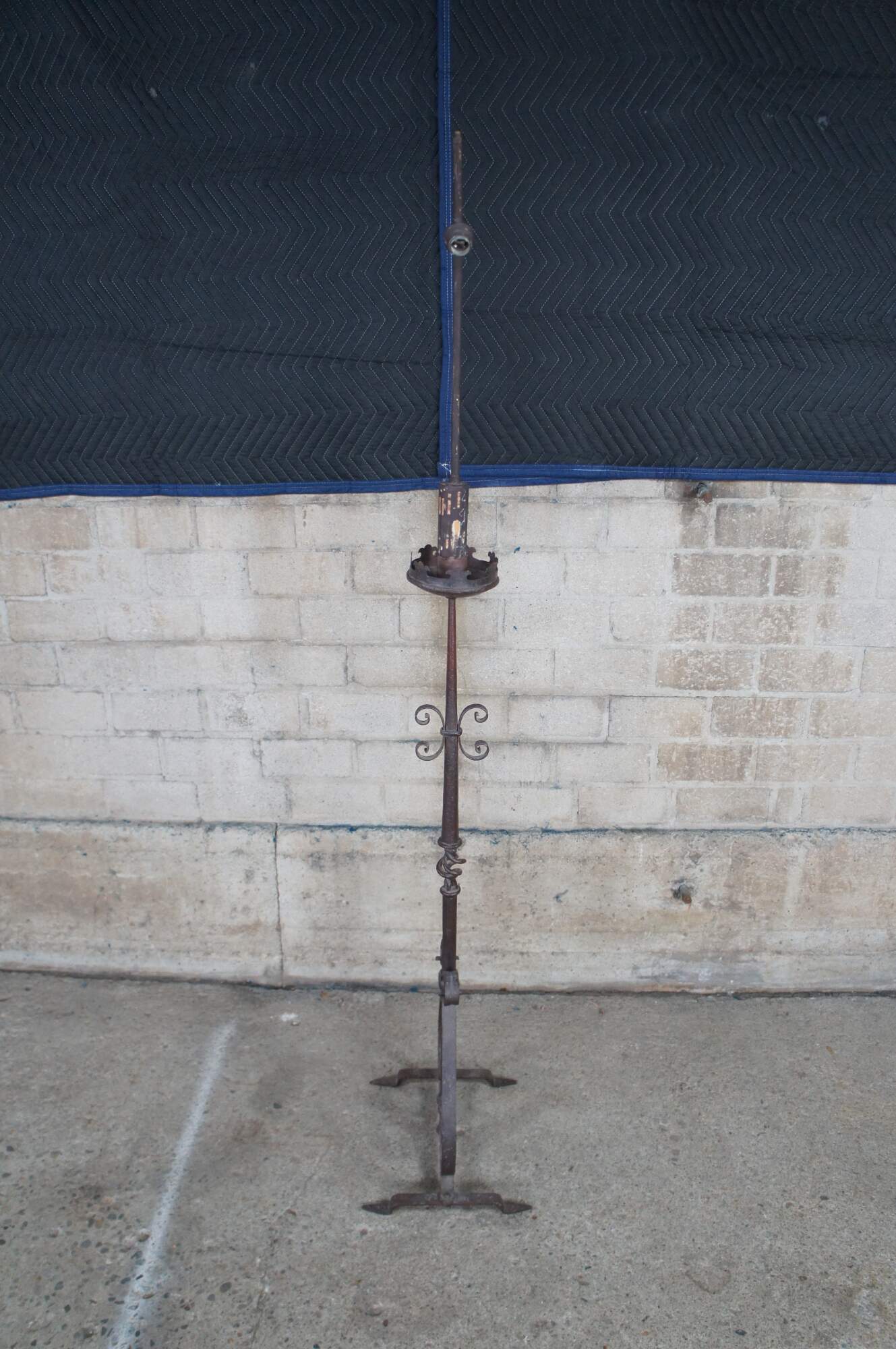 Large antique wrought / forged iron converted torchiere candle stand / candle holder floor lamp featuring Gothic / Spanish styling with scrolled accents, fleur de lis and two lights.