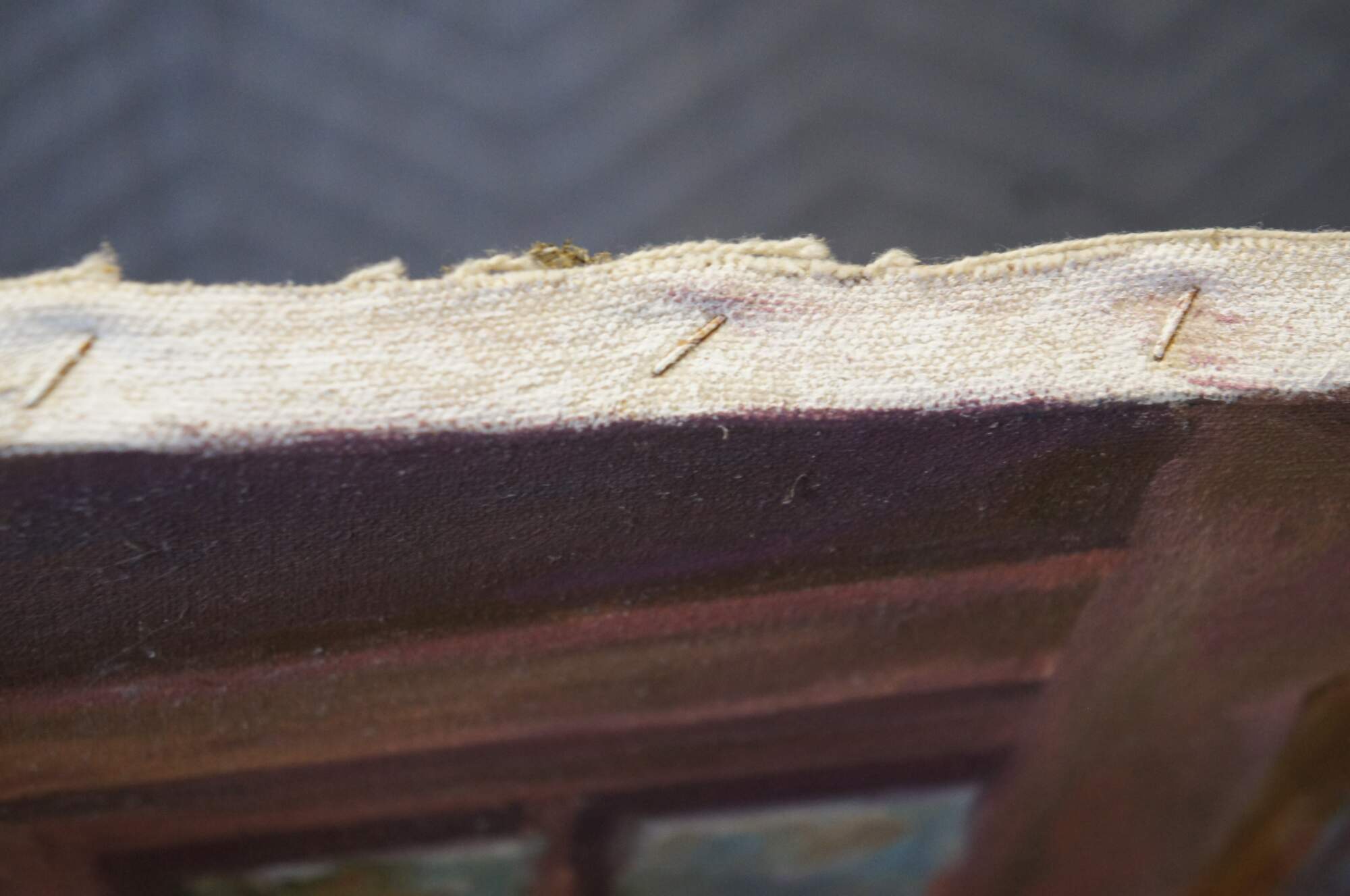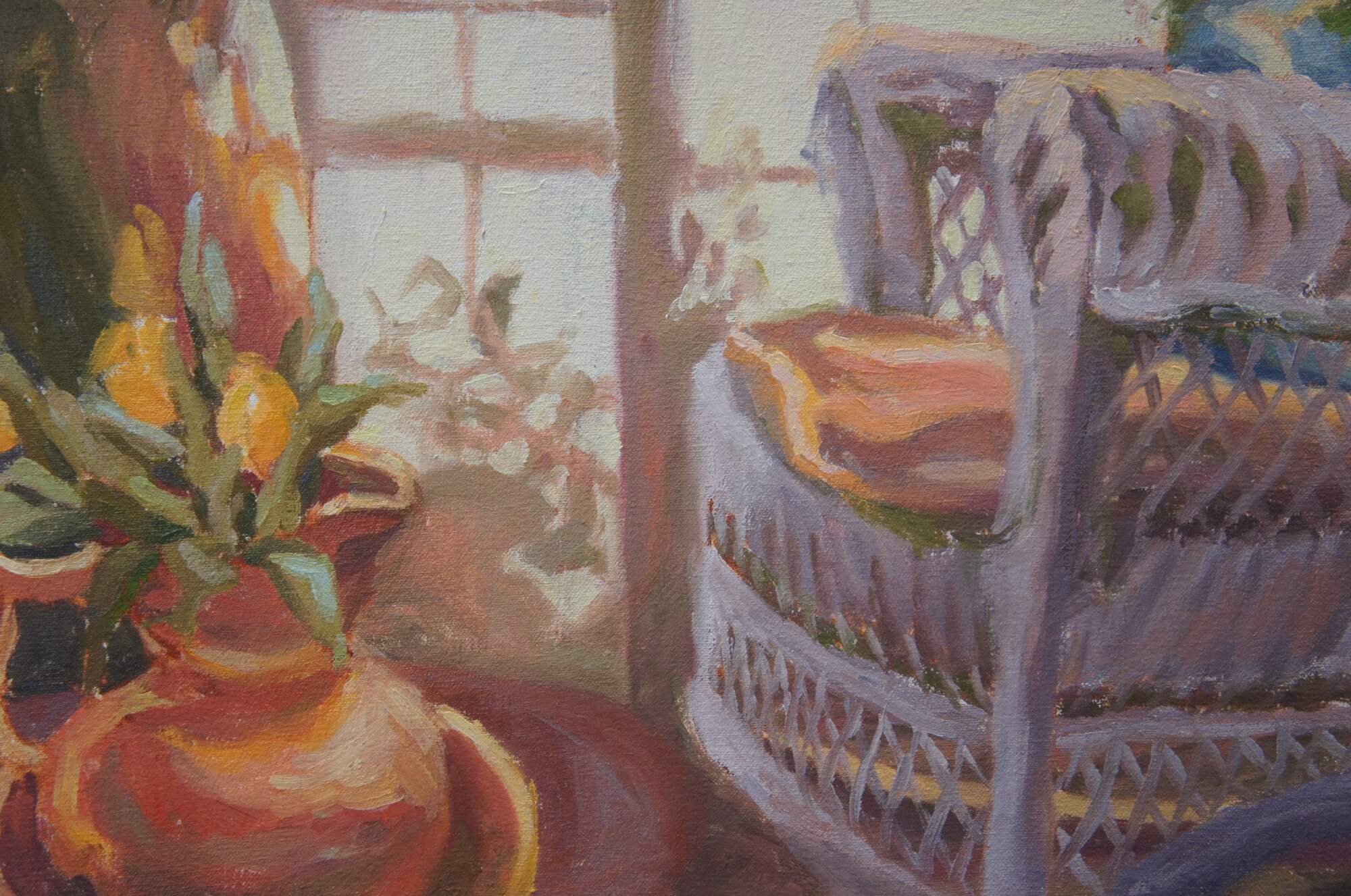 Mid to late 20th century Nancy Fisher oil on canvas painting depicting a woman standing and looking out a window in a room filled with slanting sunlight, a vase of lemons, and a white wicker chair.