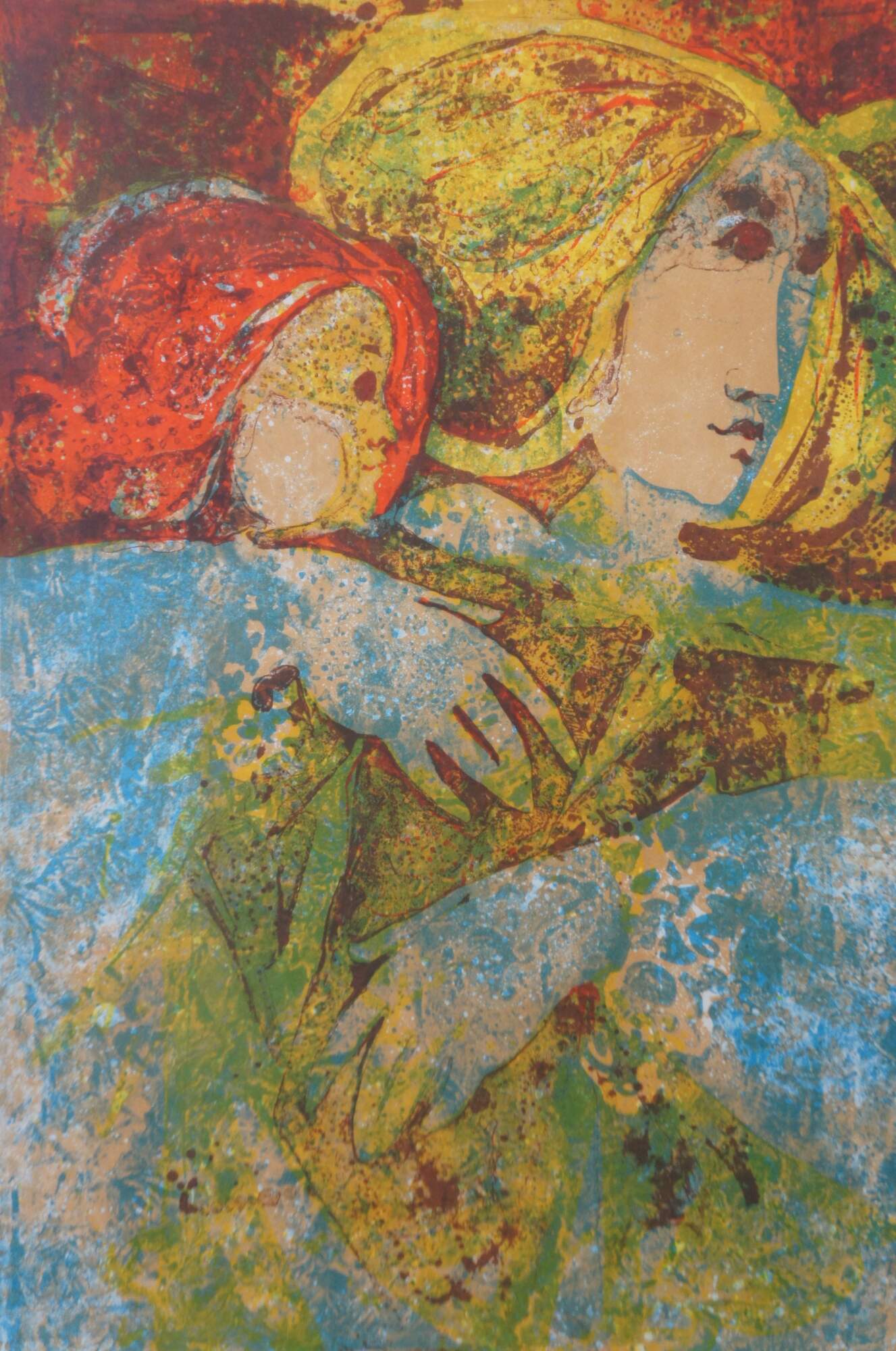 Late 20th century modernist lithograph print titled "Mother and Child" by Alvar Sunol Munoz-ramos. Depicts the Virgin Mary holding the baby Jesus in a modernist mottling of orange, yellow, blue and green. Pencil signed and numbered 95/275 along lower edge. Authentication on reverse by the Societe de Verification de la Nouvelle Gravure Internationale of New York and Paris / The Collector's Guild Ltd. Stamped 696 D. Wood frame with brass trim on raised bevel; orange mat.