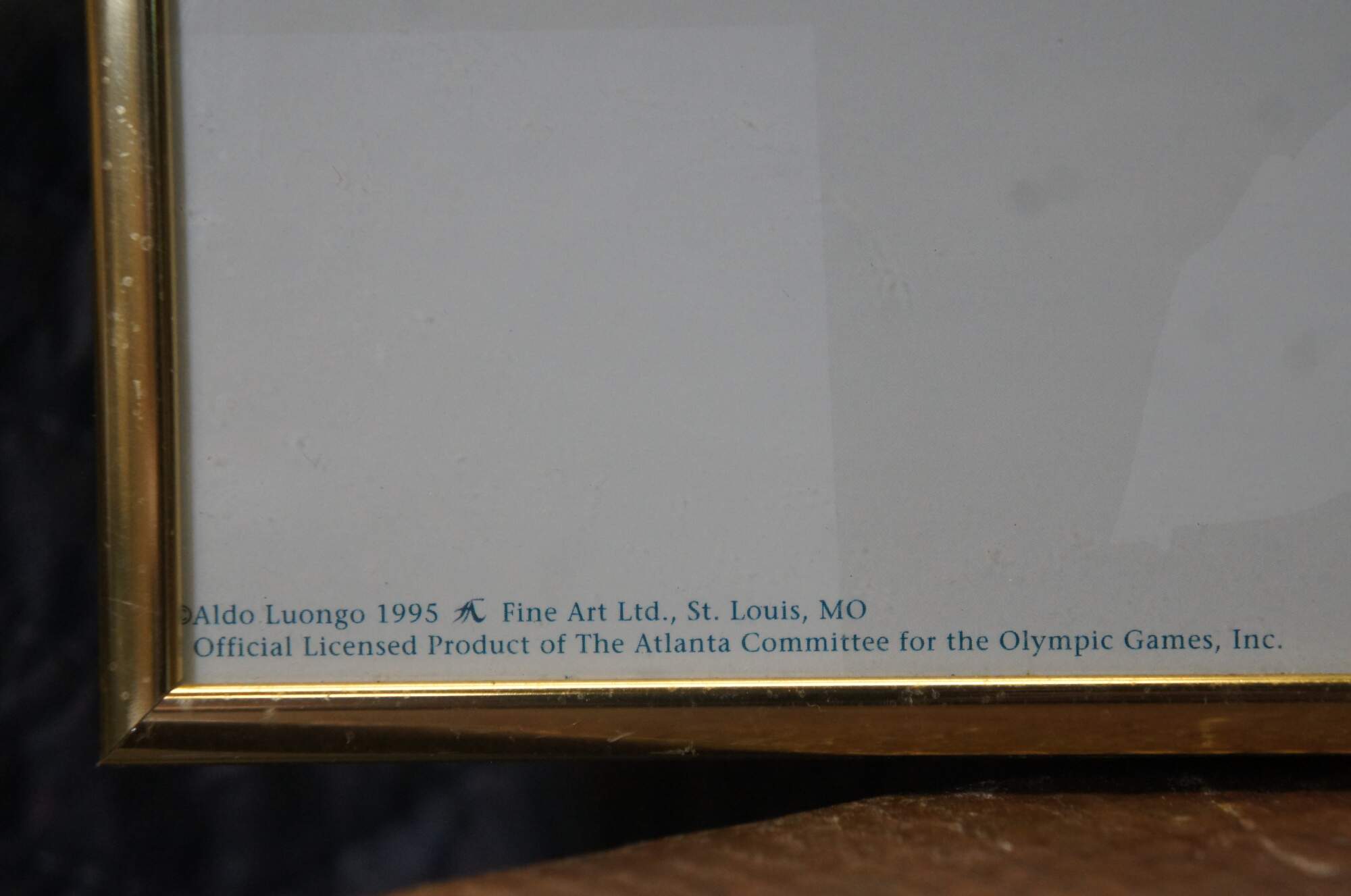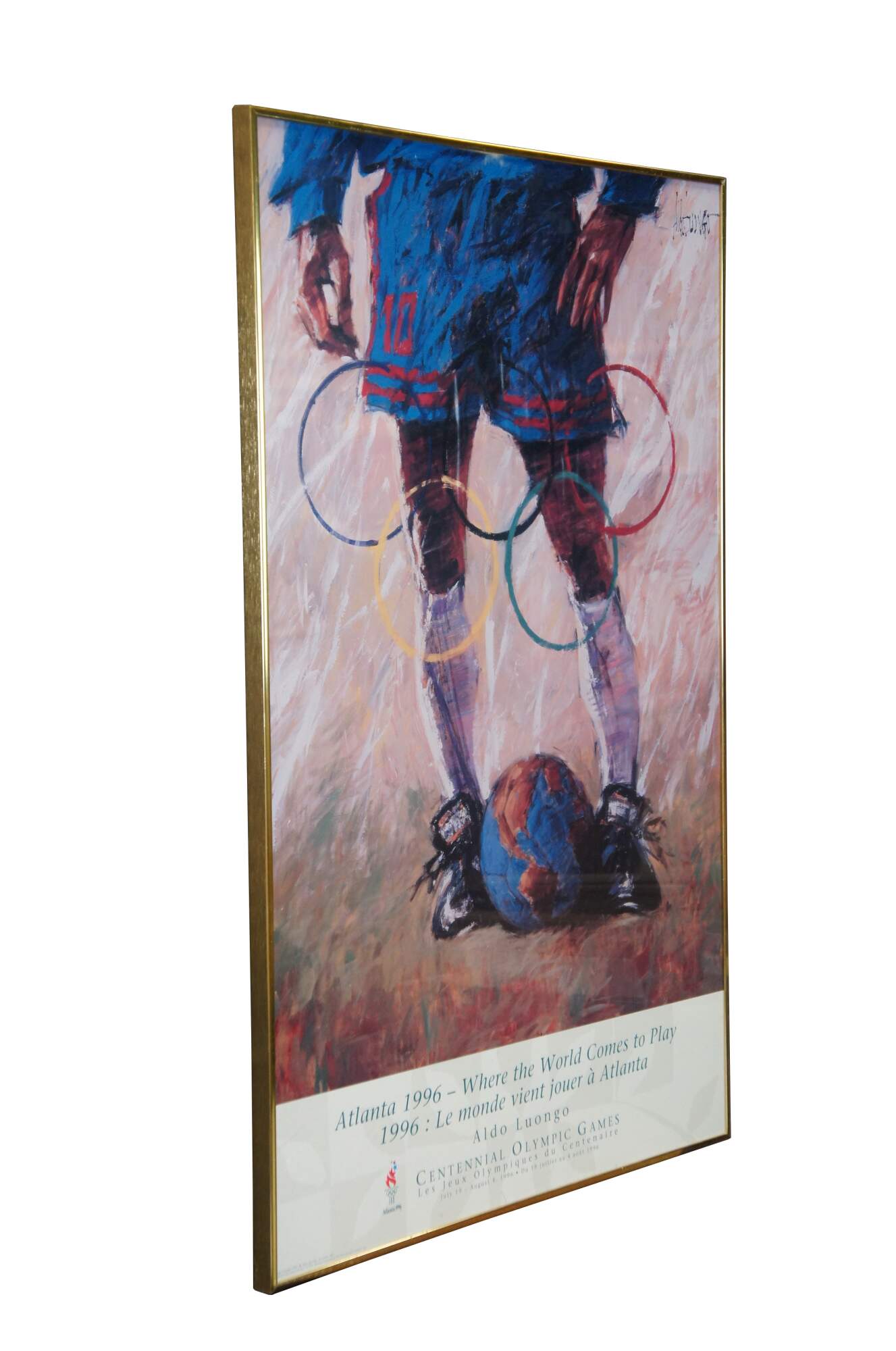Vintage poster commemorating the 1996 Centennial Summer Olympic Games in Atlanta, GA, designed by Aldo Luongo. Depicts the lower half a soccer / football / futbol player in blue, overlayed with the Olympic rings, and a world globe between his feet instead of a soccer ball. Copyright Aldo Luongo 1995. Published by Fine Art Ltd, St. Louis, MO. Official Licensed Product of the Atlanta Committee for the Olympic Games, Inc. Gold tone metal frame.