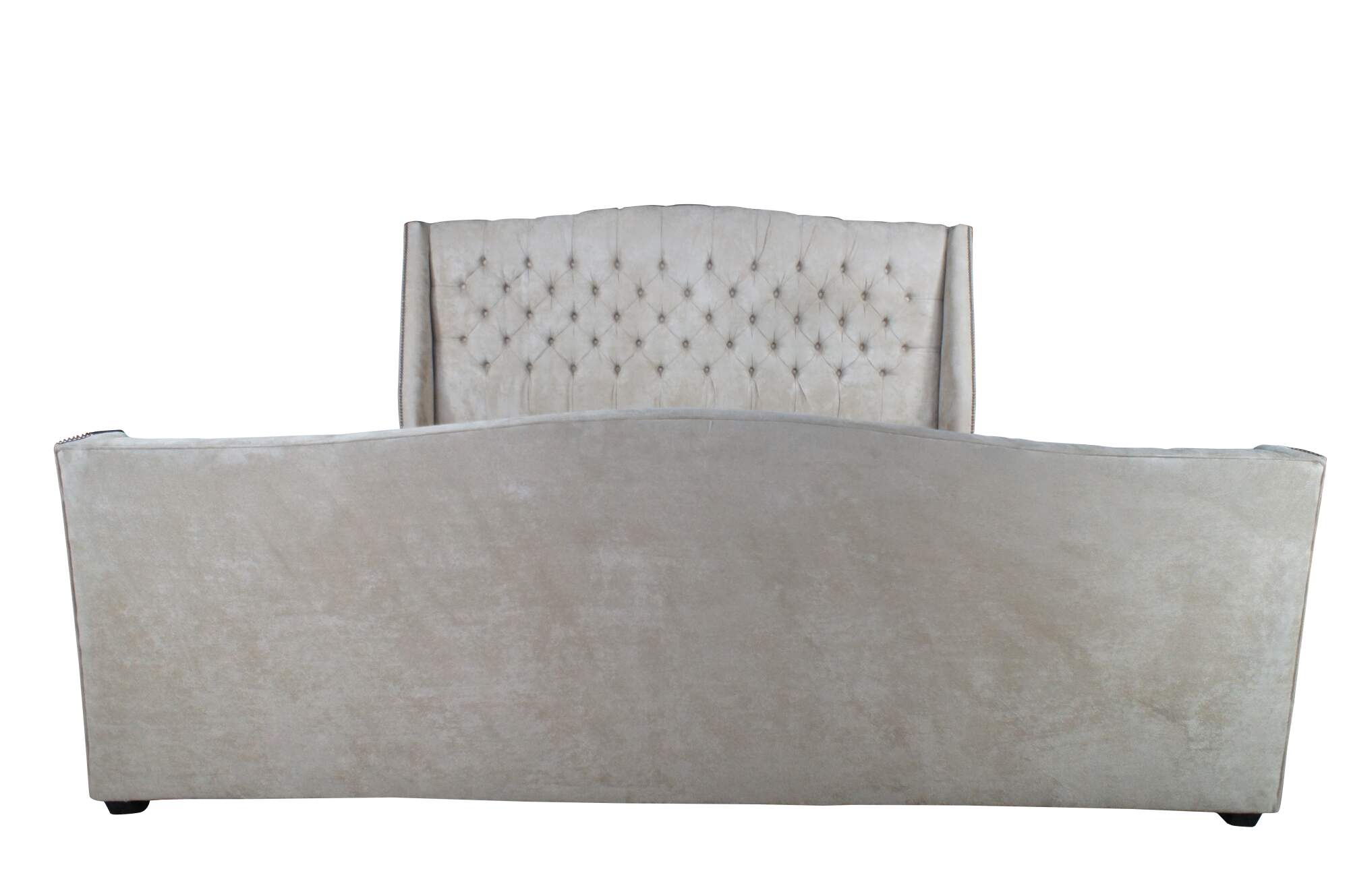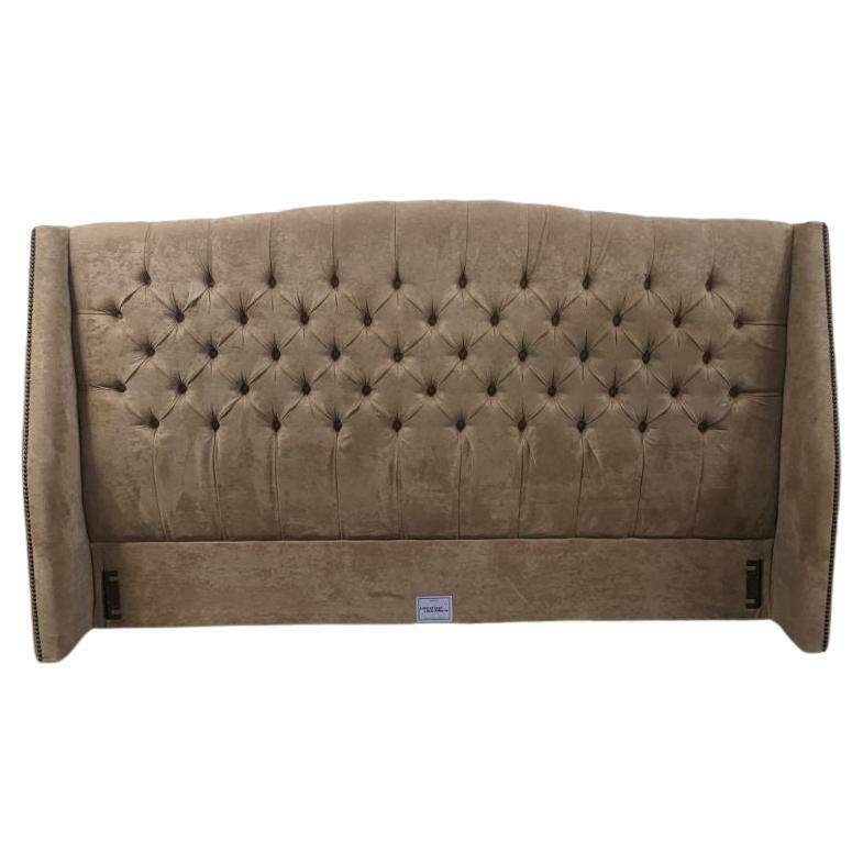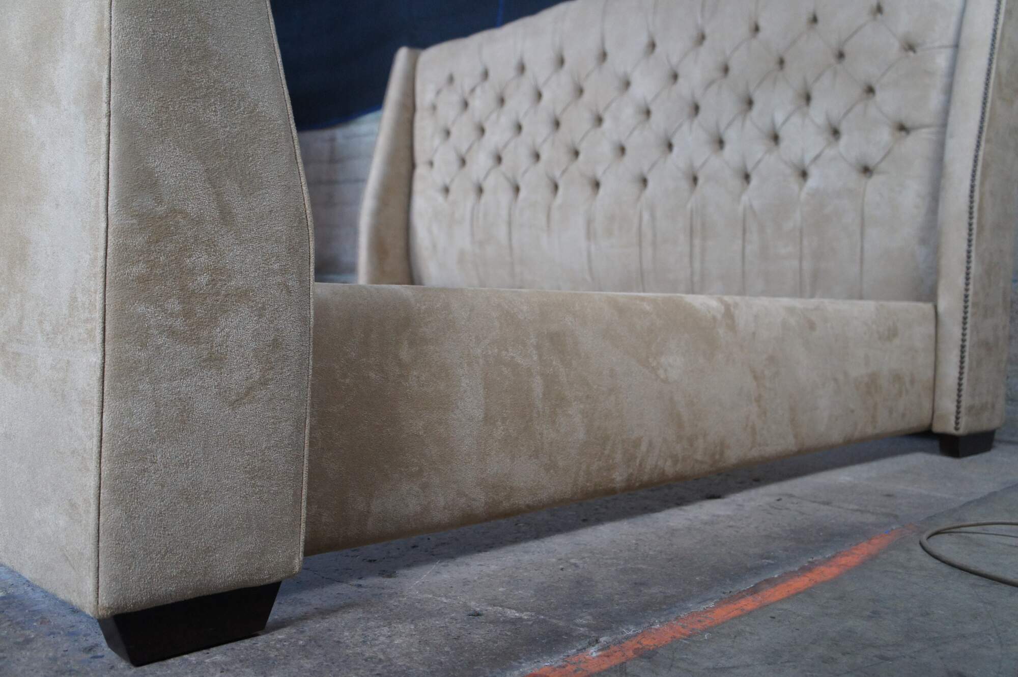 Vintage MG+BW tufted suede nailhead king size bed frame.