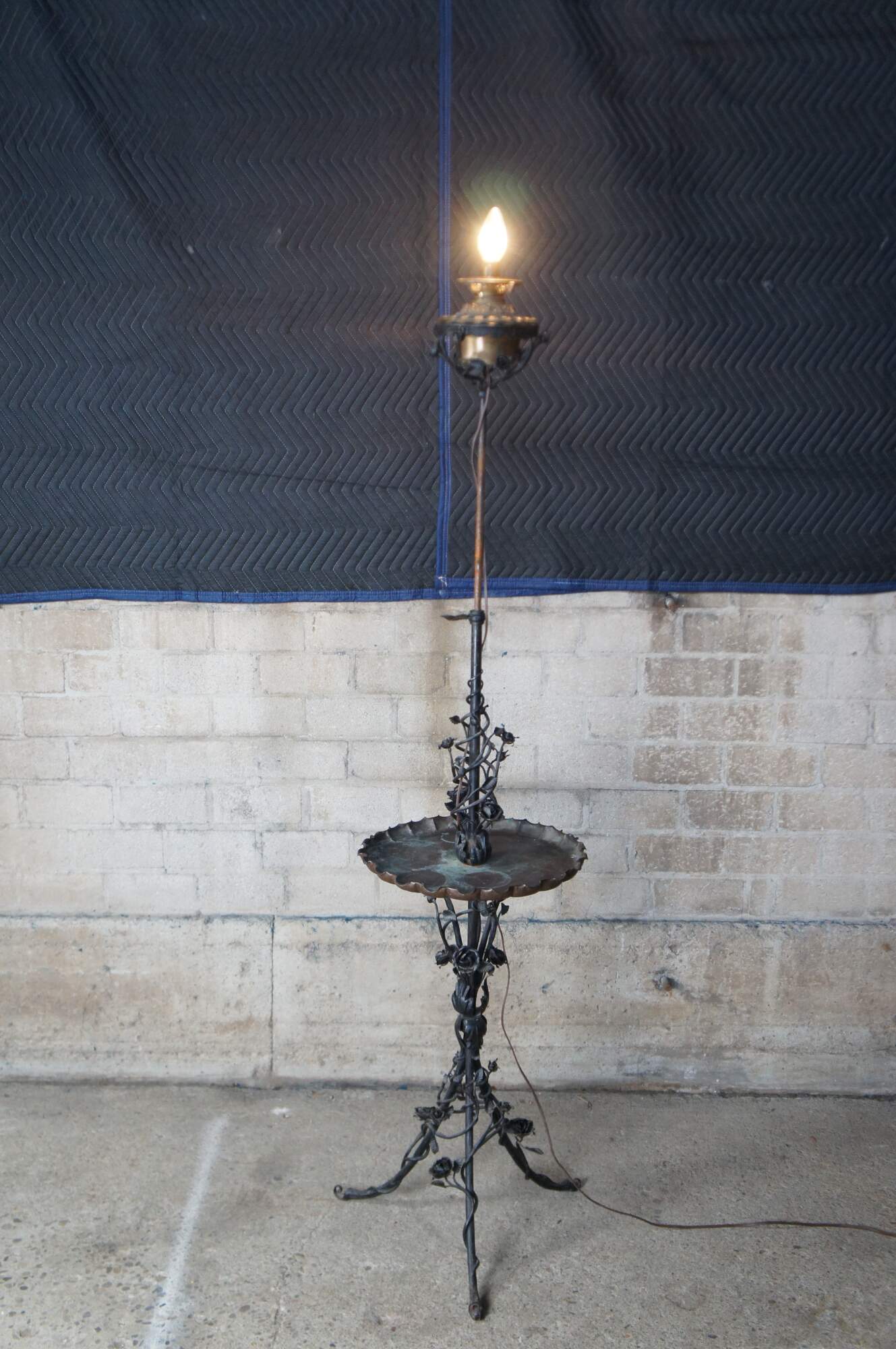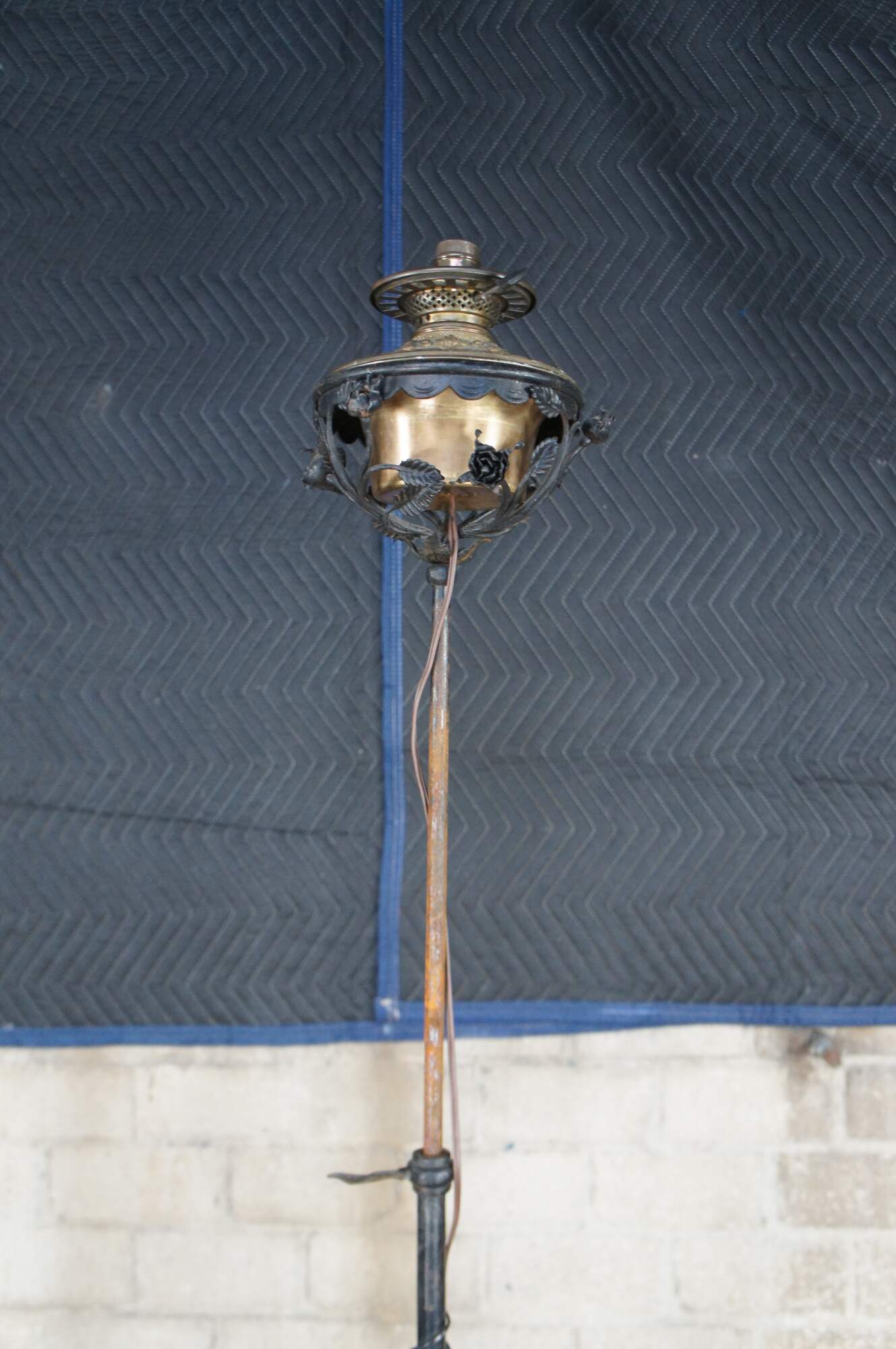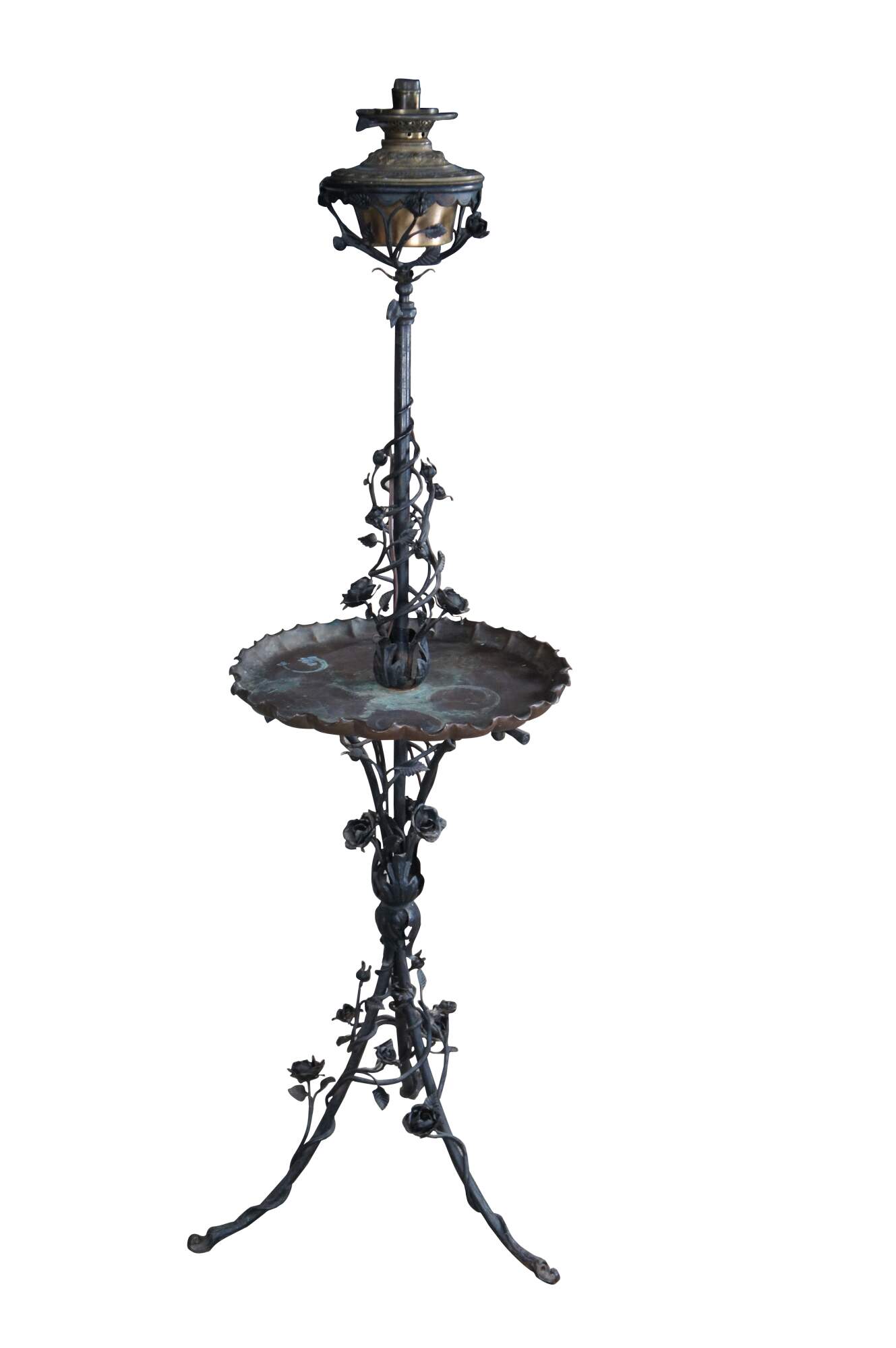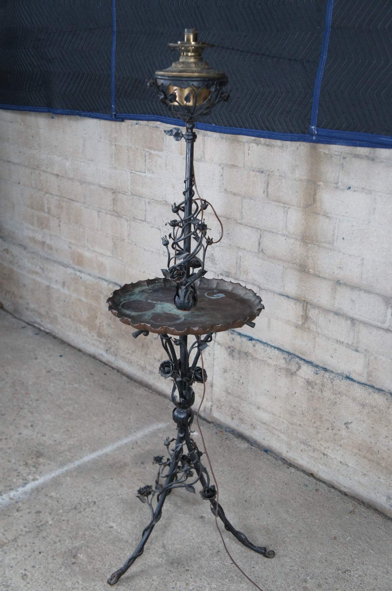 Antique Victorian wrought / forged iron converted rise and fall oil lantern floor lamp. Made of iron featuring Art Nouveau styling with a floral rose / vine / acanthus theme, tripod base, bronze tray table and extendable lantern light.