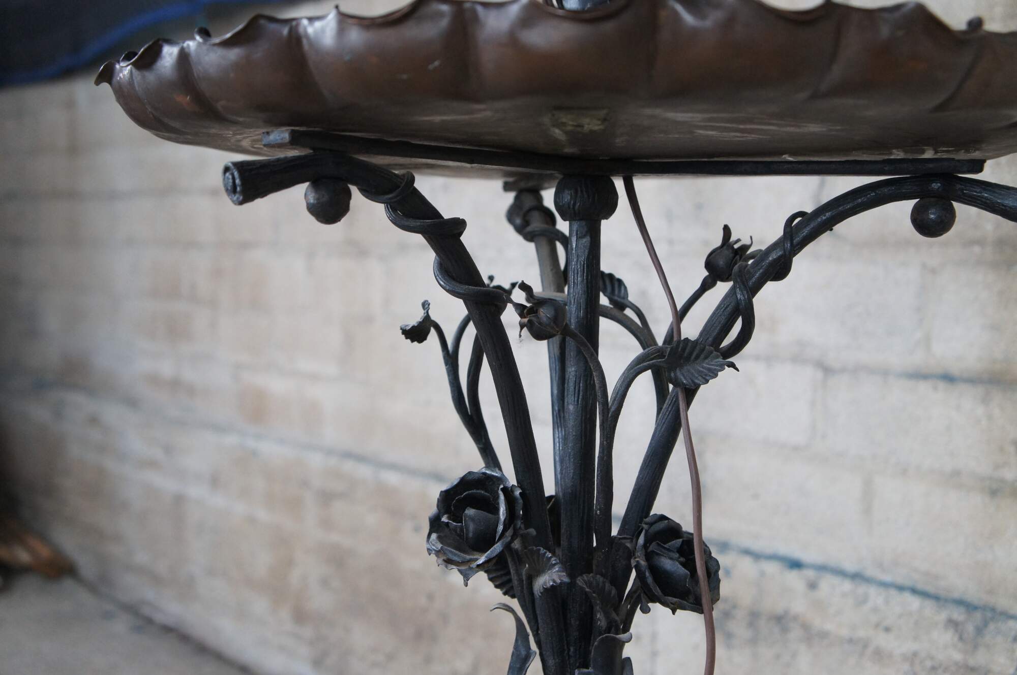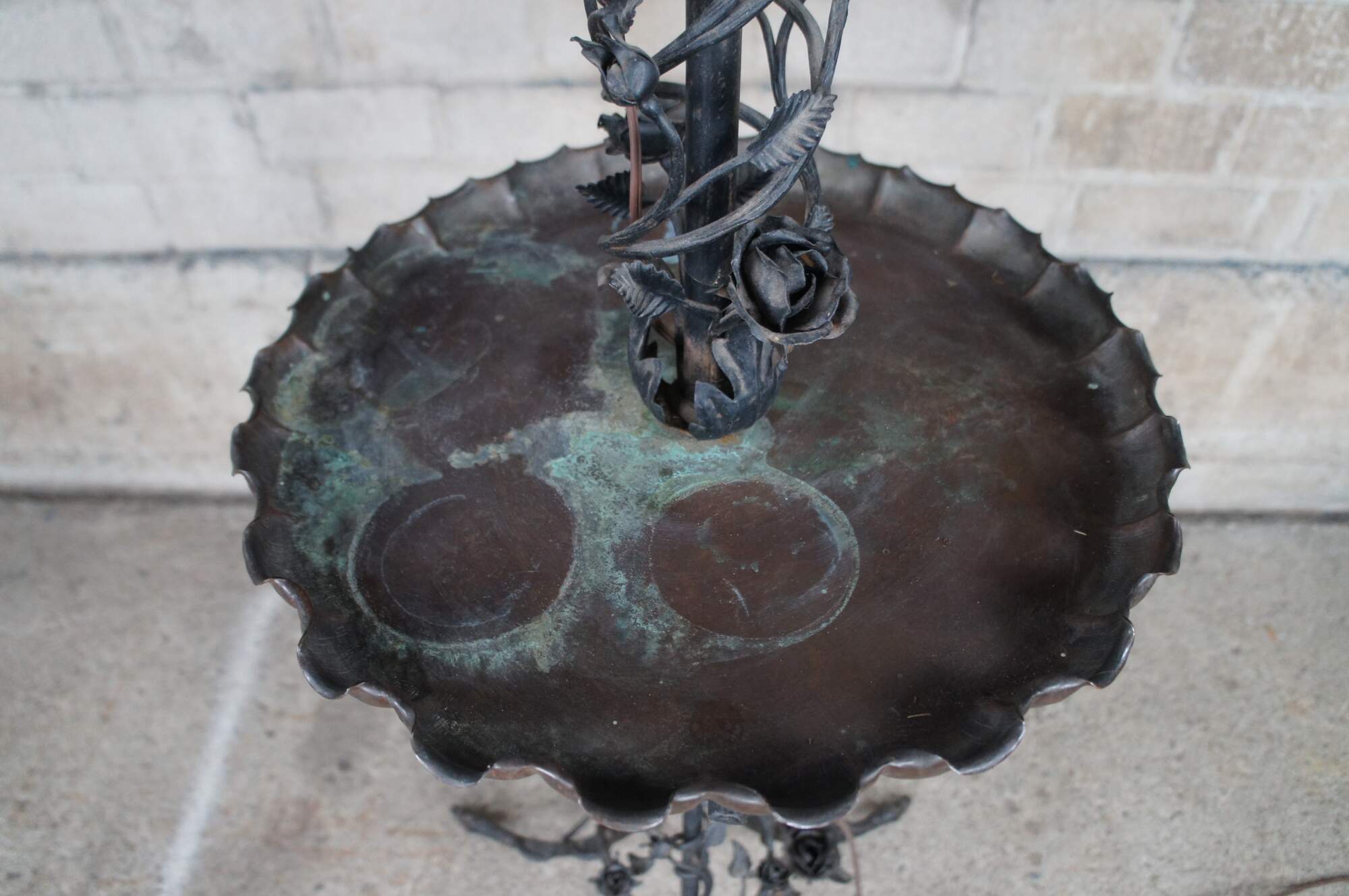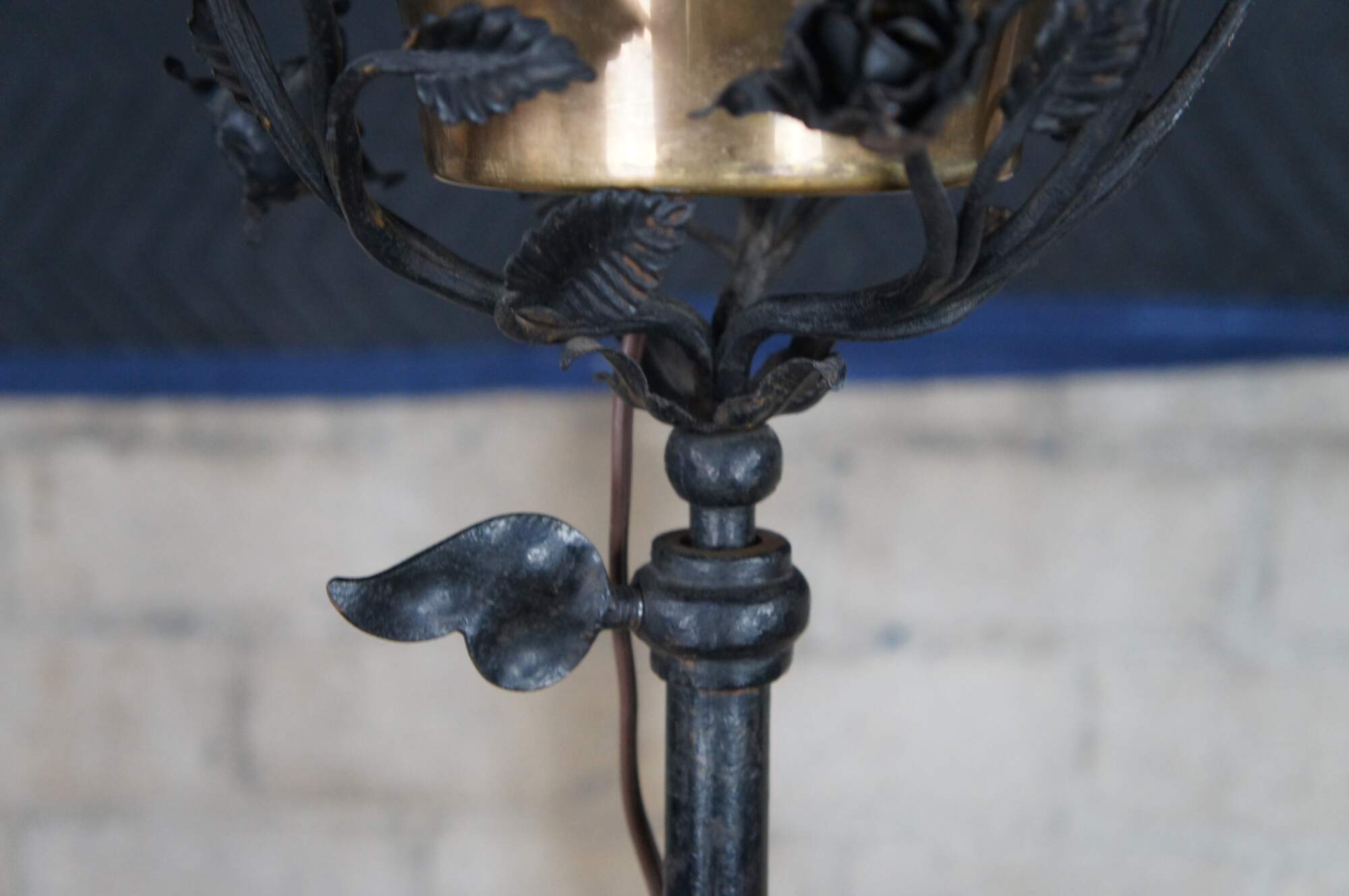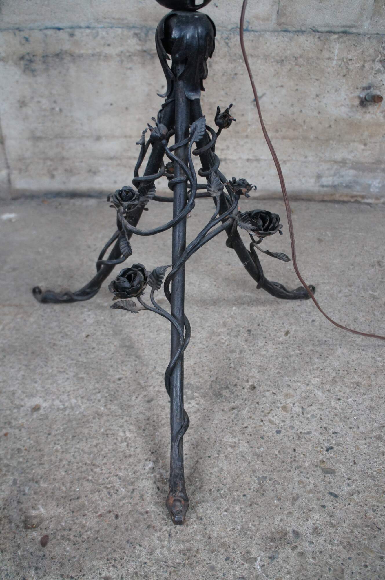 Antique Victorian wrought / forged iron converted rise and fall oil lantern floor lamp. Made of iron featuring Art Nouveau styling with a floral rose / vine / acanthus theme, tripod base, bronze tray table and extendable lantern light.