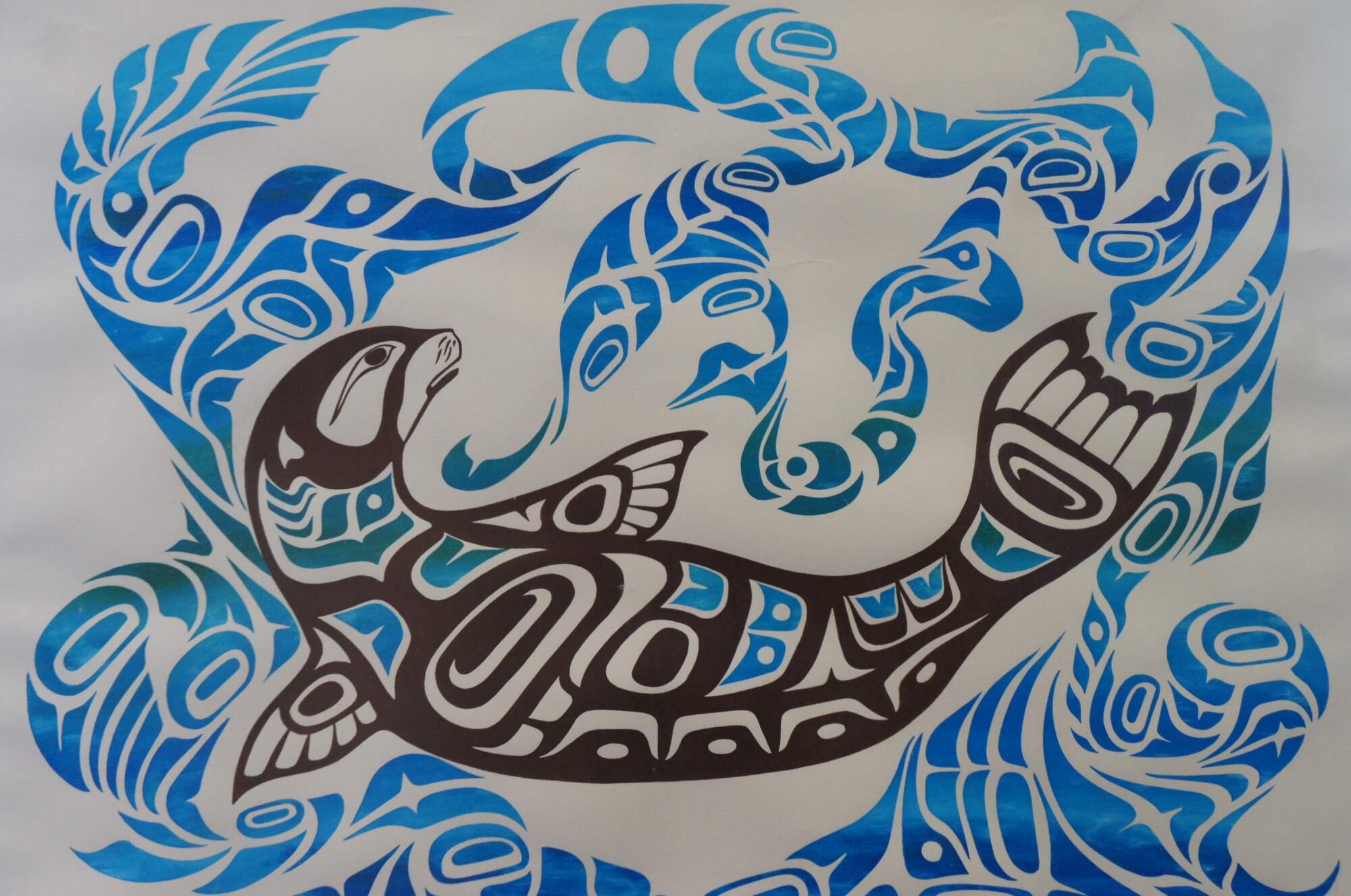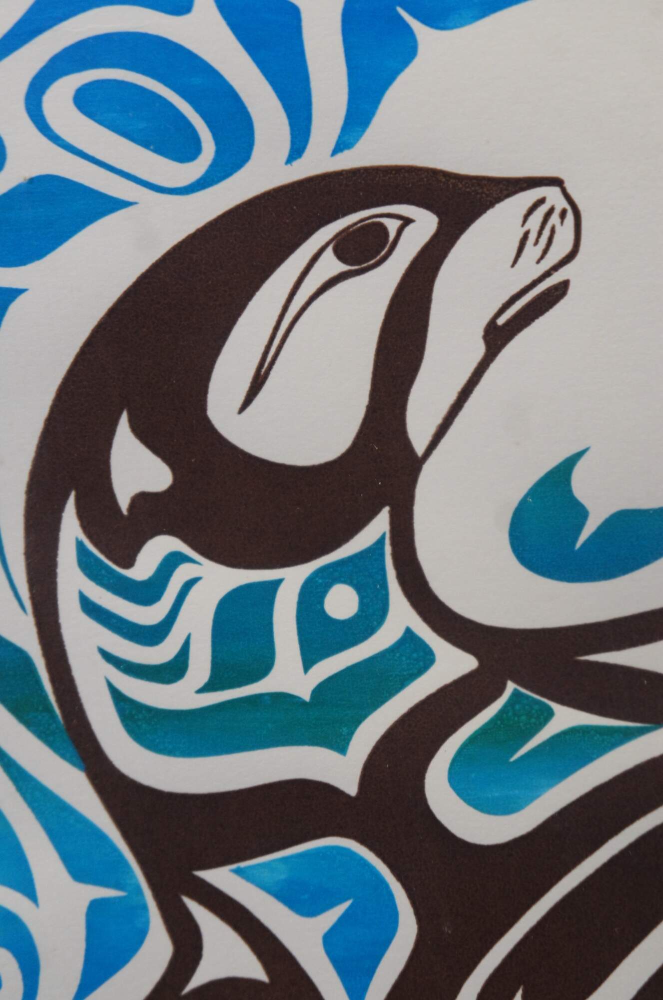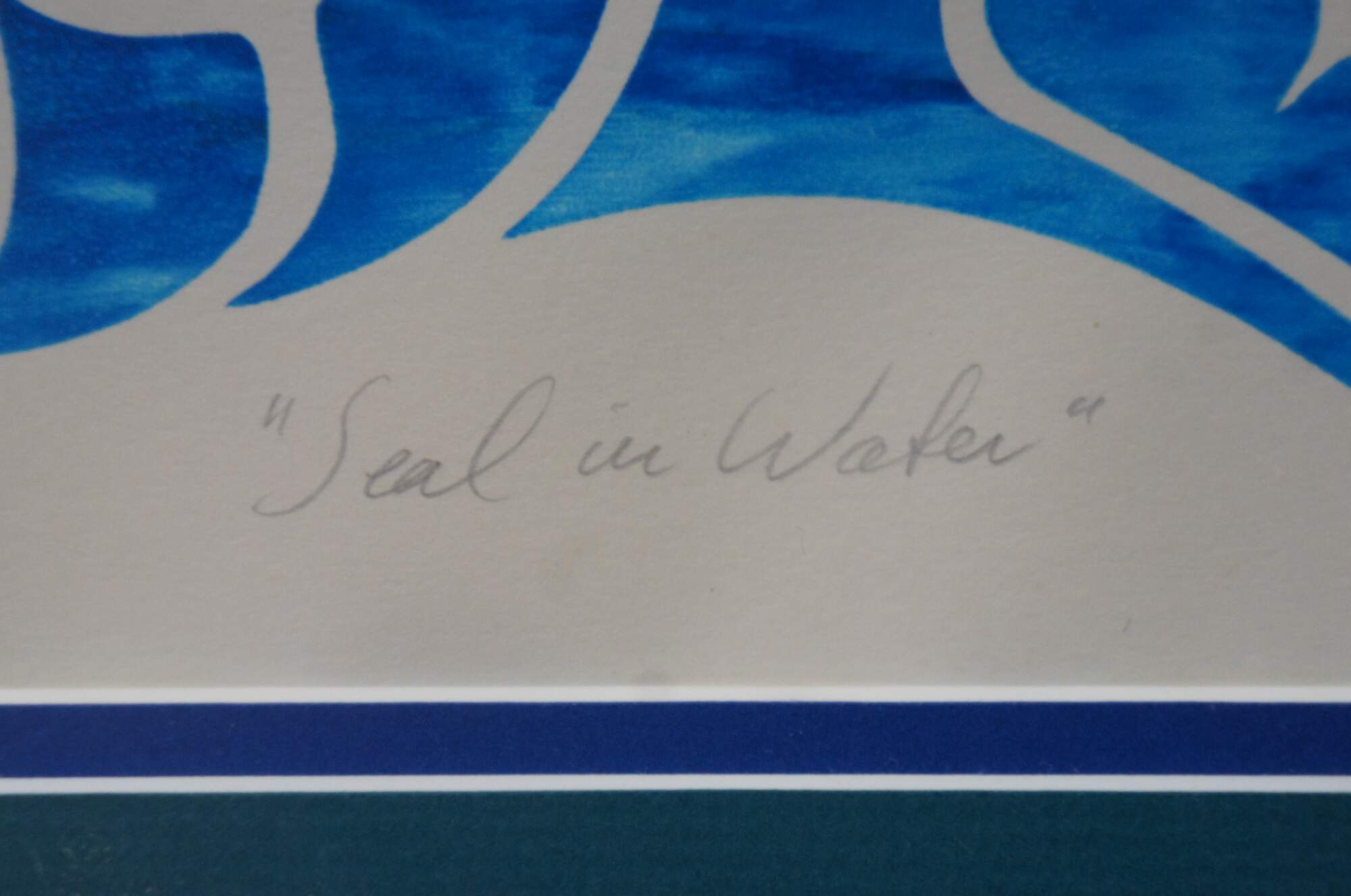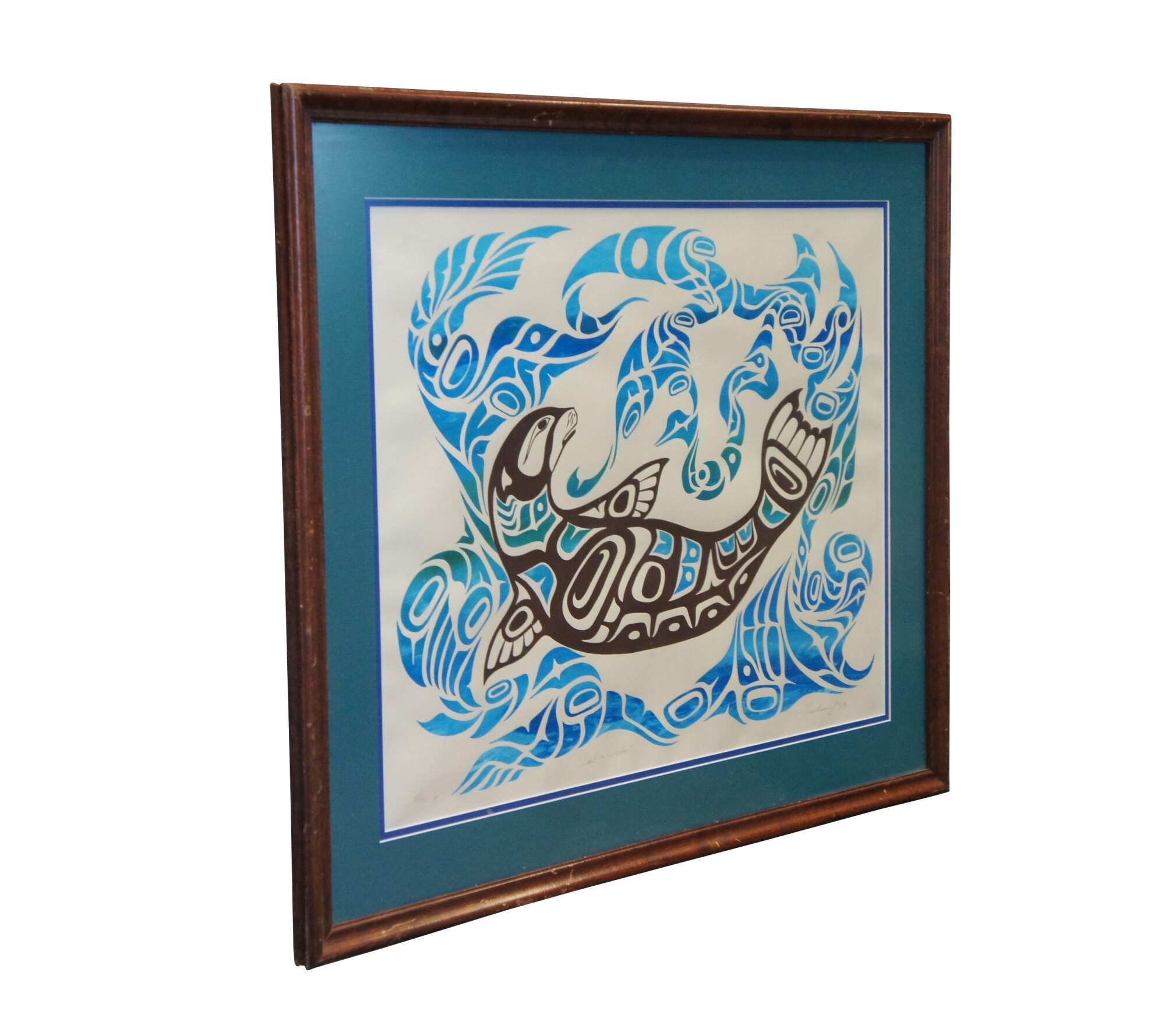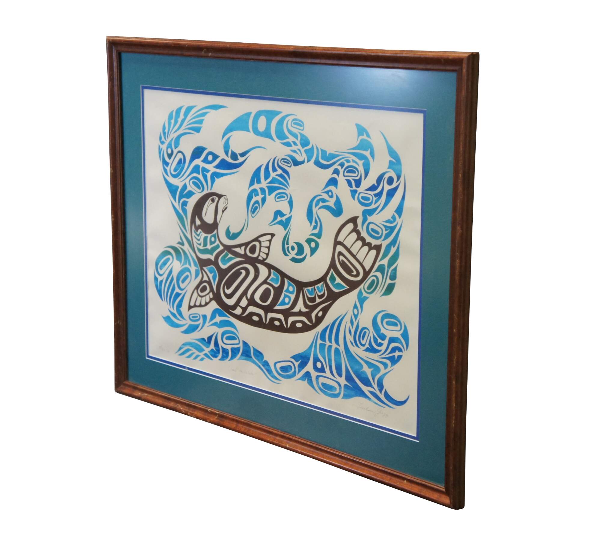 Rare vintage 1991 limited edition lithograph print titled "Seal in Water." Depicts a black and white seal / sea otter with blue and teal patches floating in swirling blue and teal waves, executed in a First Nations / indigenous / native folk art style. Pencil signed Tresham Gregg and numbered 38/42 along lower edge. Beveled wood frame; two tone blue layered mat.